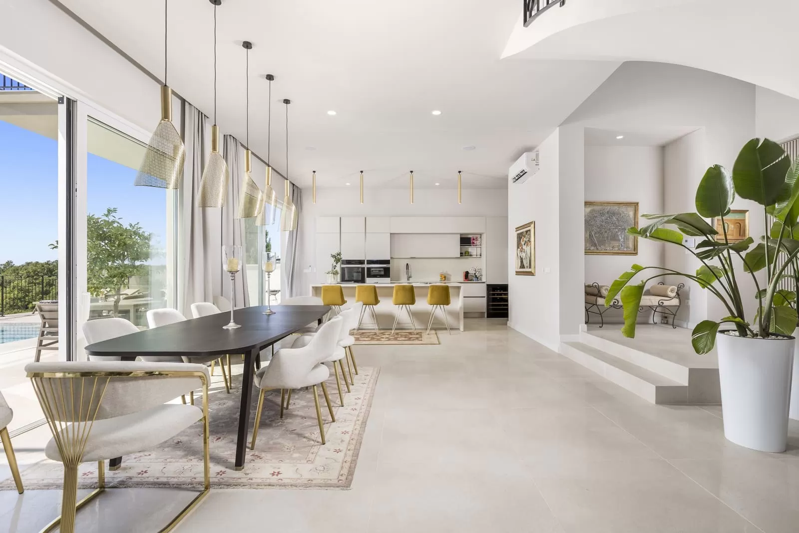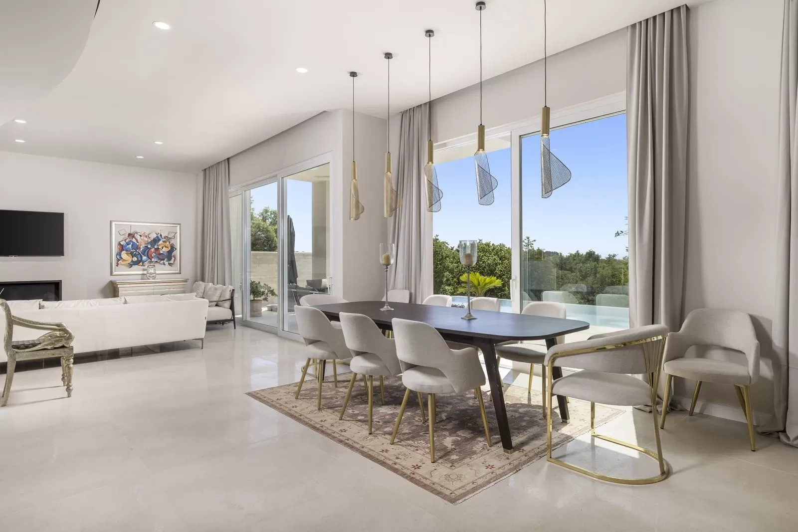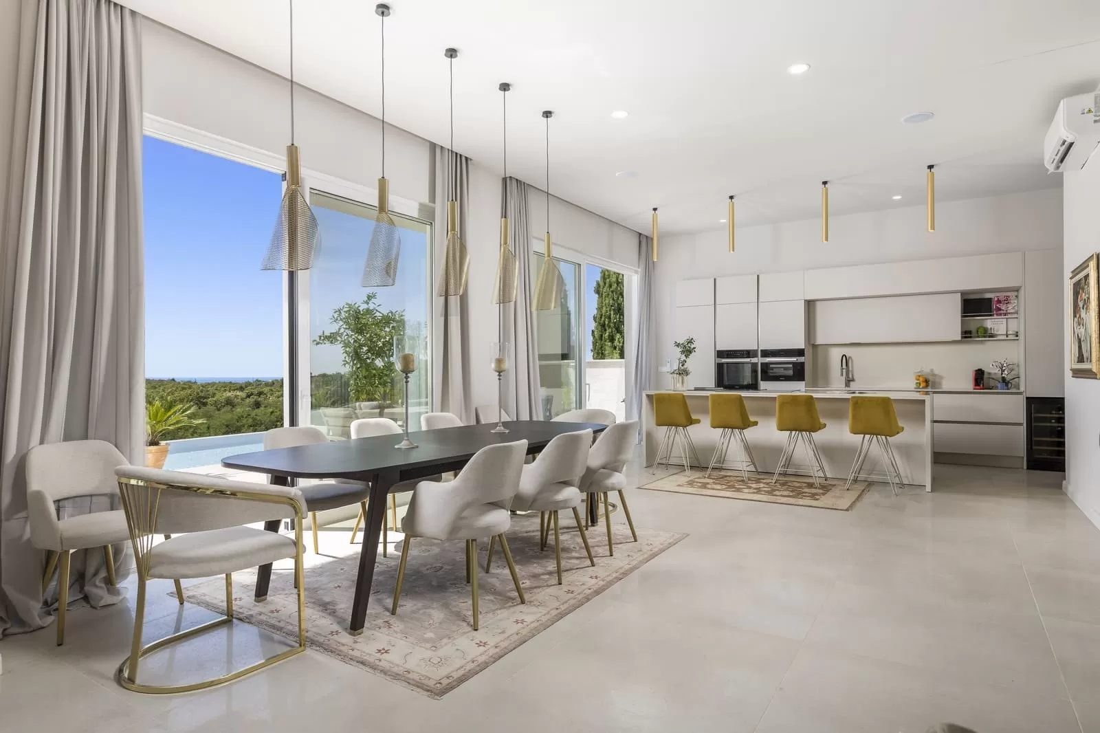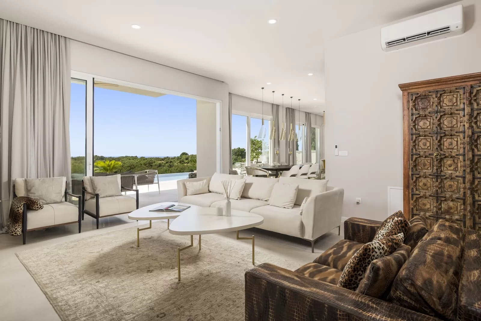 Im Inneren setzt sich die Eleganz fort. Große Glasfronten öffnen den Wohnbereich zur Terrasse und lassen Licht und Landschaft zu einem Teil des Interieurs werden. Das Zusammenspiel aus modernen Linien, hellen Farben und warmen Akzenten verleiht dem Raum eine behagliche und zugleich exklusive Atmosphäre. Eine offene Designerküche mit Kochinsel und hochwertigen Geräten geht fließend in den Essbereich über, von dem aus man einen herrlichen Blick auf den Pool und die umliegende Natur genießt. Das geschwungene Treppenhaus führt in die obere Etage, wo sich vier luxuriös ausgestattete Schlafzimmer befinden – zwei mit Kingsize- und zwei mit Queensize-Betten, jeweils mit eigenem Bad, Klimaanlage, Fernseher und Balkon. Edle Stoffe, dezente Beleuchtung und ausgewählte Accessoires schaffen eine perfekte Balance zwischen Komfort und Stil. Die Badezimmer sind modern und großzügig, mit Stein- und Glaselementen sowie sanfter Beleuchtung, die an ein privates Spa erinnert.