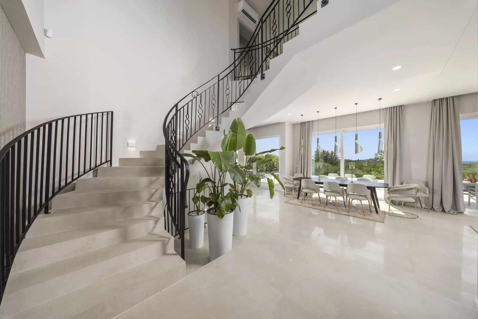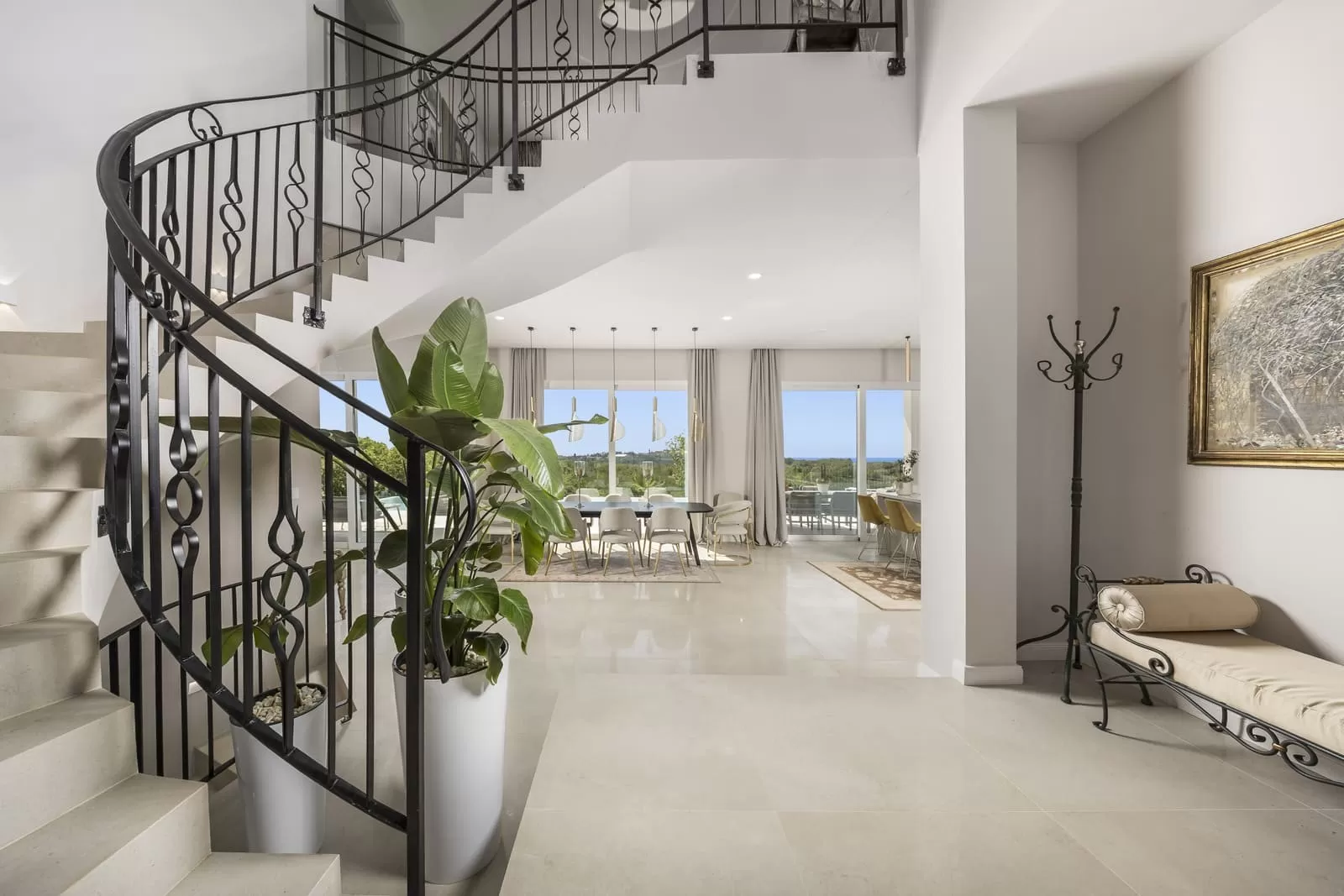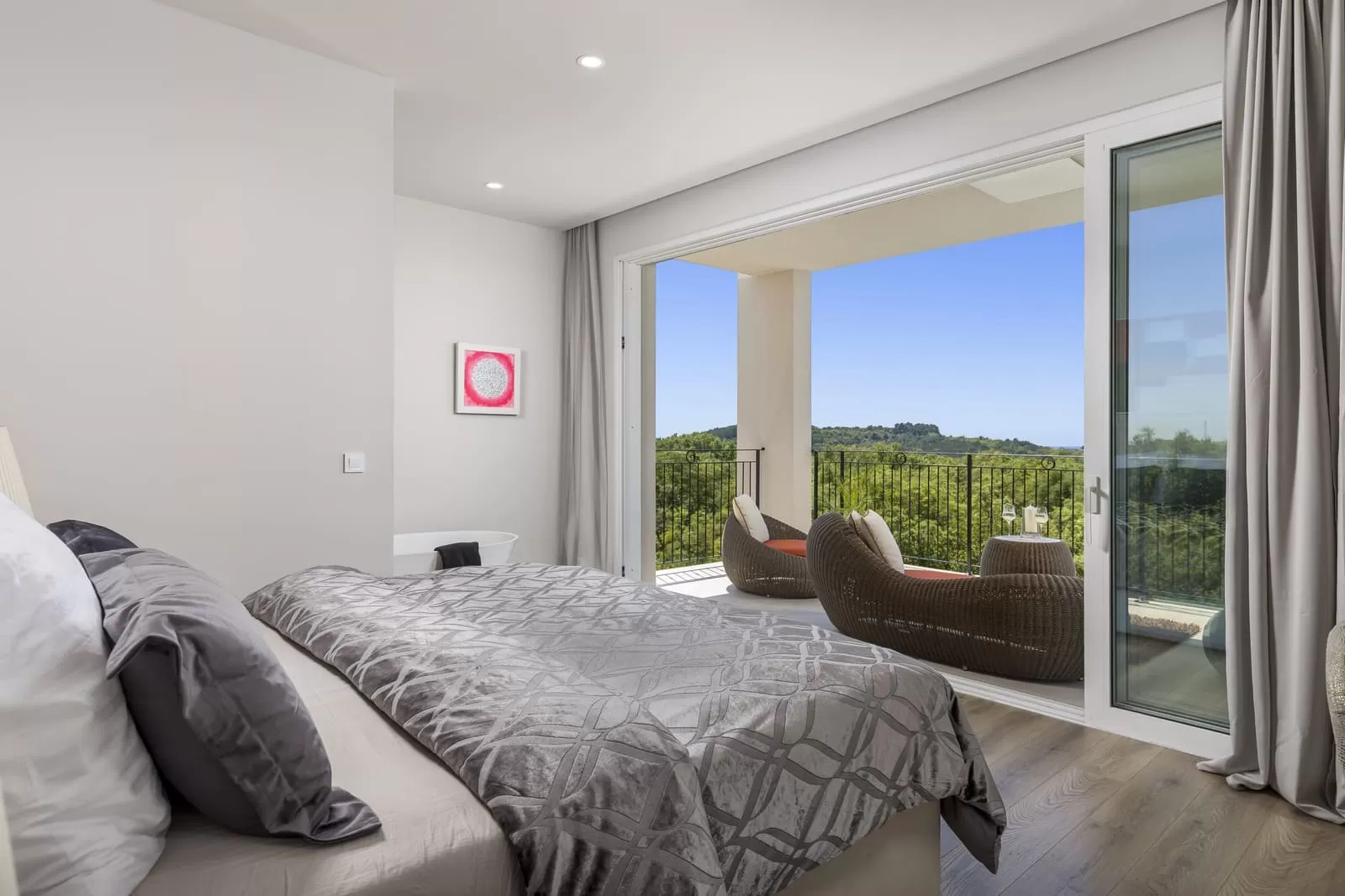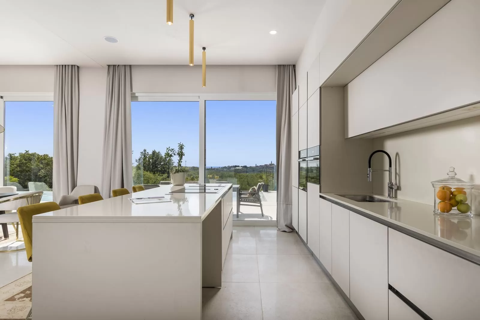 Im Inneren setzt sich die Eleganz fort. Große Glasfronten öffnen den Wohnbereich zur Terrasse und lassen Licht und Landschaft zu einem Teil des Interieurs werden. Das Zusammenspiel aus modernen Linien, hellen Farben und warmen Akzenten verleiht dem Raum eine behagliche und zugleich exklusive Atmosphäre. Eine offene Designerküche mit Kochinsel und hochwertigen Geräten geht fließend in den Essbereich über, von dem aus man einen herrlichen Blick auf den Pool und die umliegende Natur genießt. Das geschwungene Treppenhaus führt in die obere Etage, wo sich vier luxuriös ausgestattete Schlafzimmer befinden – zwei mit Kingsize- und zwei mit Queensize-Betten, jeweils mit eigenem Bad, Klimaanlage, Fernseher und Balkon. Edle Stoffe, dezente Beleuchtung und ausgewählte Accessoires schaffen eine perfekte Balance zwischen Komfort und Stil. Die Badezimmer sind modern und großzügig, mit Stein- und Glaselementen sowie sanfter Beleuchtung, die an ein privates Spa erinnert.