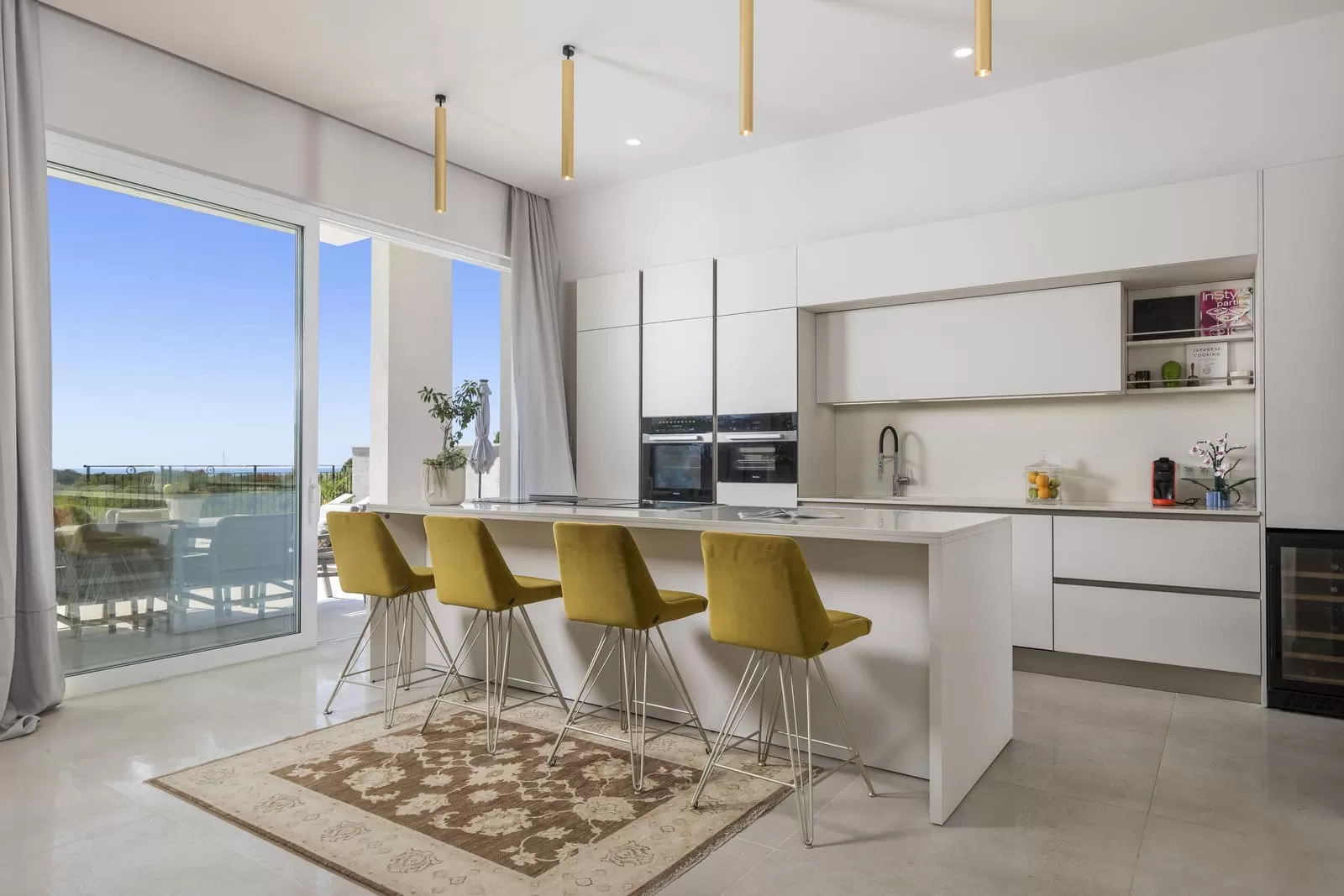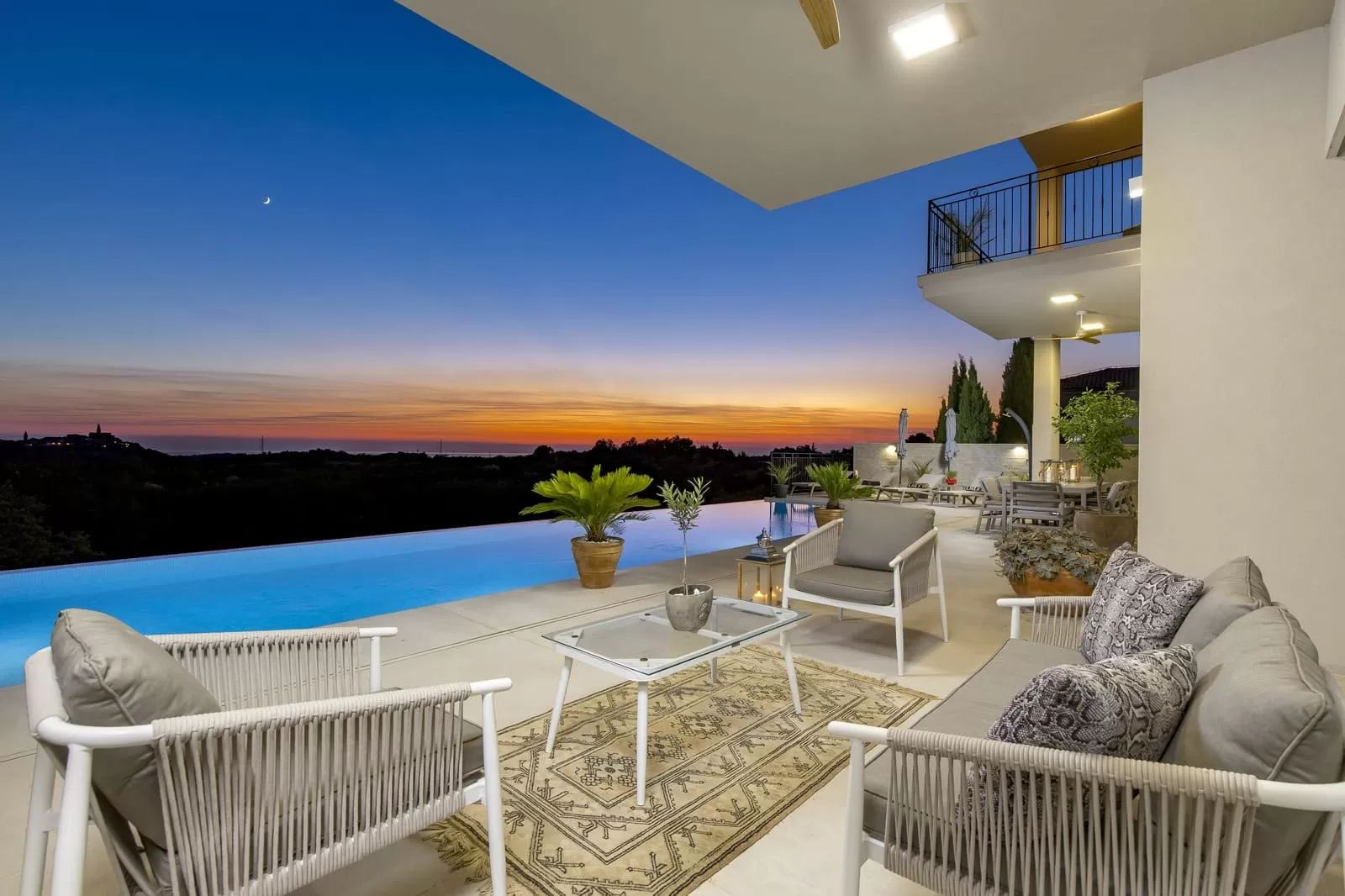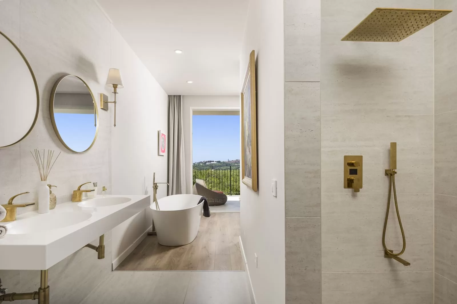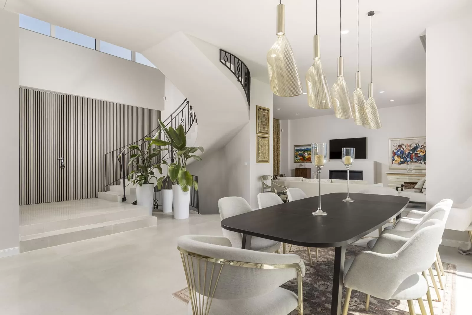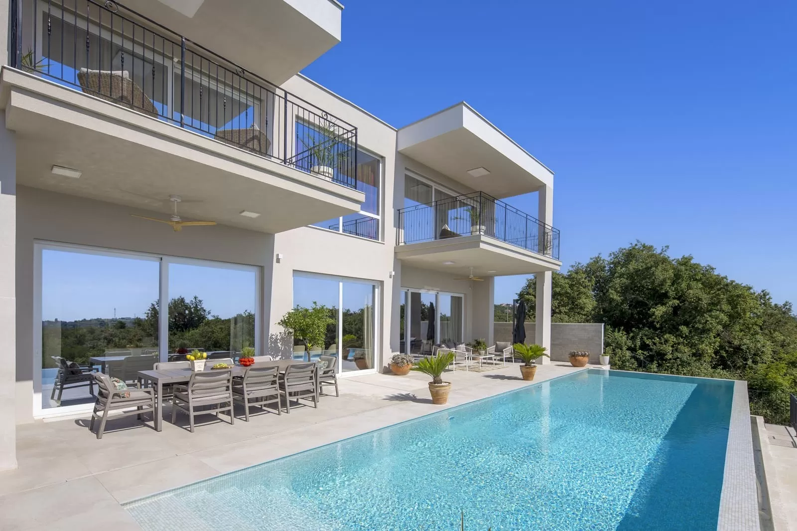 Im Inneren setzt sich die Eleganz fort. Große Glasfronten öffnen den Wohnbereich zur Terrasse und lassen Licht und Landschaft zu einem Teil des Interieurs werden. Das Zusammenspiel aus modernen Linien, hellen Farben und warmen Akzenten verleiht dem Raum eine behagliche und zugleich exklusive Atmosphäre. Eine offene Designerküche mit Kochinsel und hochwertigen Geräten geht fließend in den Essbereich über, von dem aus man einen herrlichen Blick auf den Pool und die umliegende Natur genießt. Das geschwungene Treppenhaus führt in die obere Etage, wo sich vier luxuriös ausgestattete Schlafzimmer befinden – zwei mit Kingsize- und zwei mit Queensize-Betten, jeweils mit eigenem Bad, Klimaanlage, Fernseher und Balkon. Edle Stoffe, dezente Beleuchtung und ausgewählte Accessoires schaffen eine perfekte Balance zwischen Komfort und Stil. Die Badezimmer sind modern und großzügig, mit Stein- und Glaselementen sowie sanfter Beleuchtung, die an ein privates Spa erinnert.