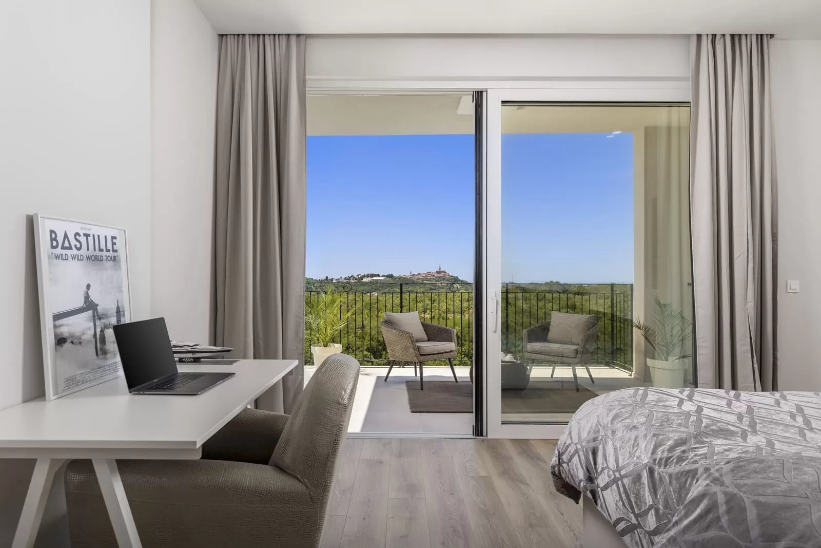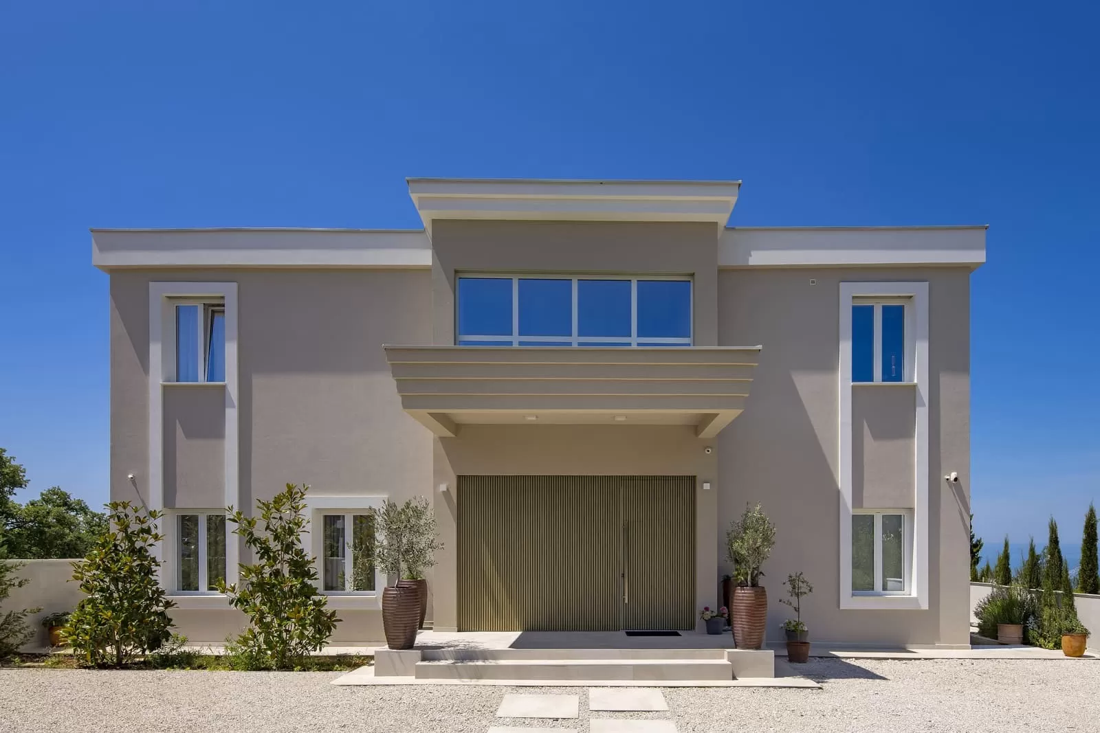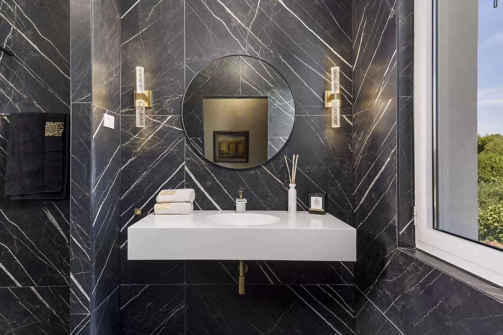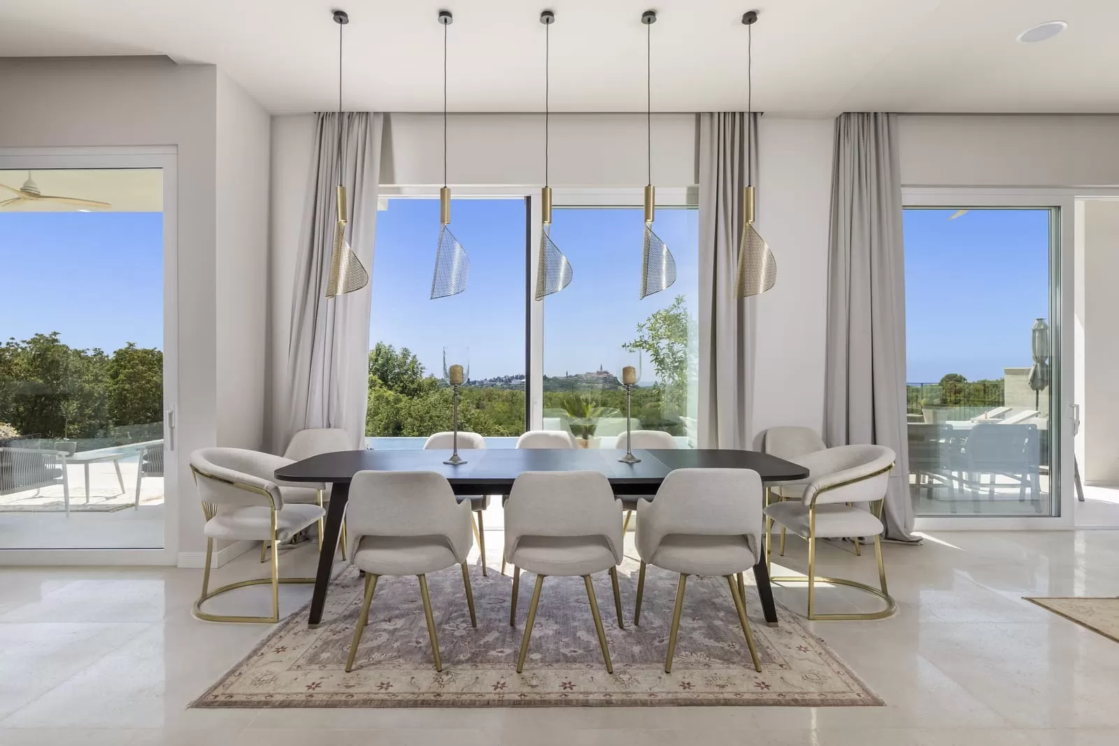 Im Inneren setzt sich die Eleganz fort. Große Glasfronten öffnen den Wohnbereich zur Terrasse und lassen Licht und Landschaft zu einem Teil des Interieurs werden. Das Zusammenspiel aus modernen Linien, hellen Farben und warmen Akzenten verleiht dem Raum eine behagliche und zugleich exklusive Atmosphäre. Eine offene Designerküche mit Kochinsel und hochwertigen Geräten geht fließend in den Essbereich über, von dem aus man einen herrlichen Blick auf den Pool und die umliegende Natur genießt. Das geschwungene Treppenhaus führt in die obere Etage, wo sich vier luxuriös ausgestattete Schlafzimmer befinden – zwei mit Kingsize- und zwei mit Queensize-Betten, jeweils mit eigenem Bad, Klimaanlage, Fernseher und Balkon. Edle Stoffe, dezente Beleuchtung und ausgewählte Accessoires schaffen eine perfekte Balance zwischen Komfort und Stil. Die Badezimmer sind modern und großzügig, mit Stein- und Glaselementen sowie sanfter Beleuchtung, die an ein privates Spa erinnert.