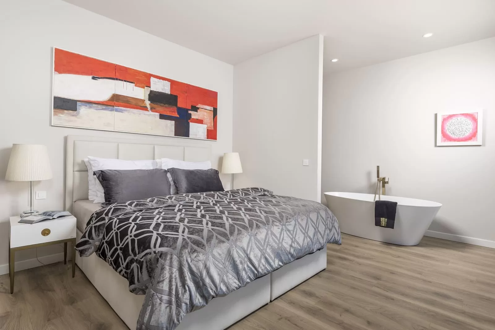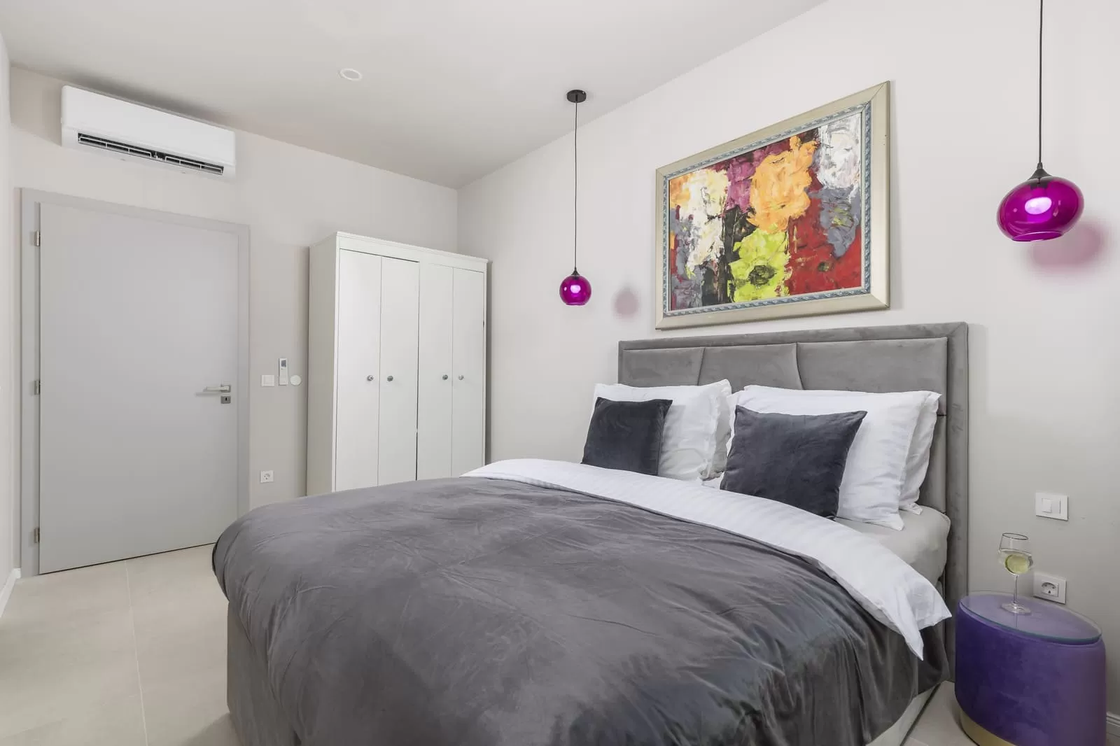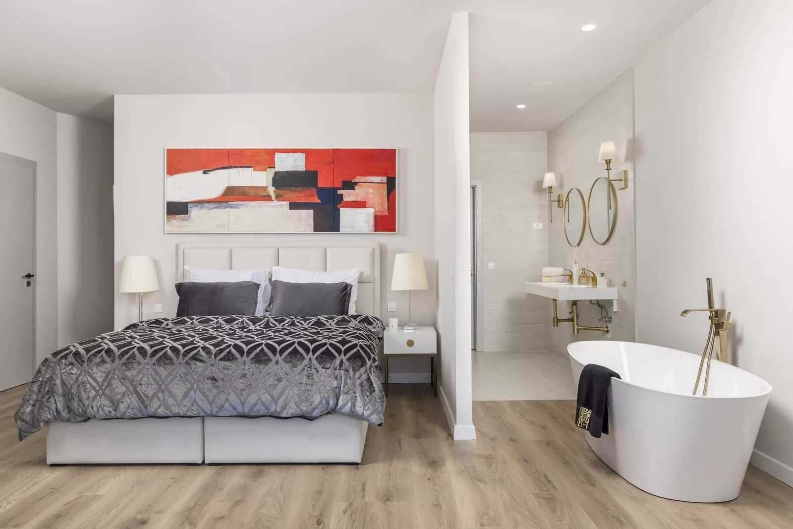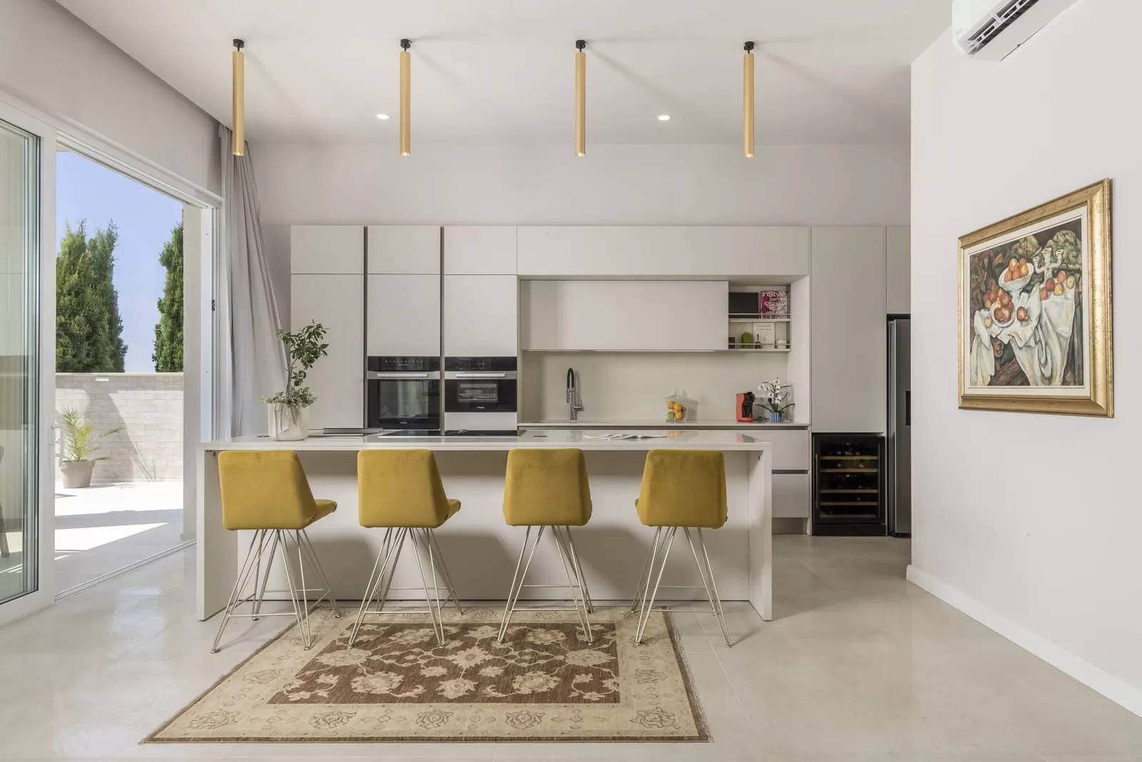 Im Inneren setzt sich die Eleganz fort. Große Glasfronten öffnen den Wohnbereich zur Terrasse und lassen Licht und Landschaft zu einem Teil des Interieurs werden. Das Zusammenspiel aus modernen Linien, hellen Farben und warmen Akzenten verleiht dem Raum eine behagliche und zugleich exklusive Atmosphäre. Eine offene Designerküche mit Kochinsel und hochwertigen Geräten geht fließend in den Essbereich über, von dem aus man einen herrlichen Blick auf den Pool und die umliegende Natur genießt. Das geschwungene Treppenhaus führt in die obere Etage, wo sich vier luxuriös ausgestattete Schlafzimmer befinden – zwei mit Kingsize- und zwei mit Queensize-Betten, jeweils mit eigenem Bad, Klimaanlage, Fernseher und Balkon. Edle Stoffe, dezente Beleuchtung und ausgewählte Accessoires schaffen eine perfekte Balance zwischen Komfort und Stil. Die Badezimmer sind modern und großzügig, mit Stein- und Glaselementen sowie sanfter Beleuchtung, die an ein privates Spa erinnert.