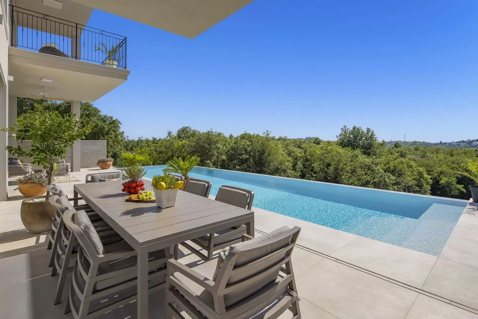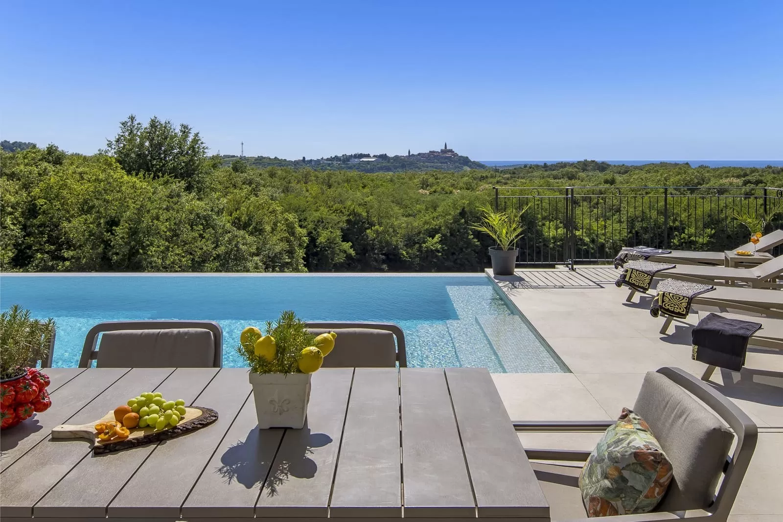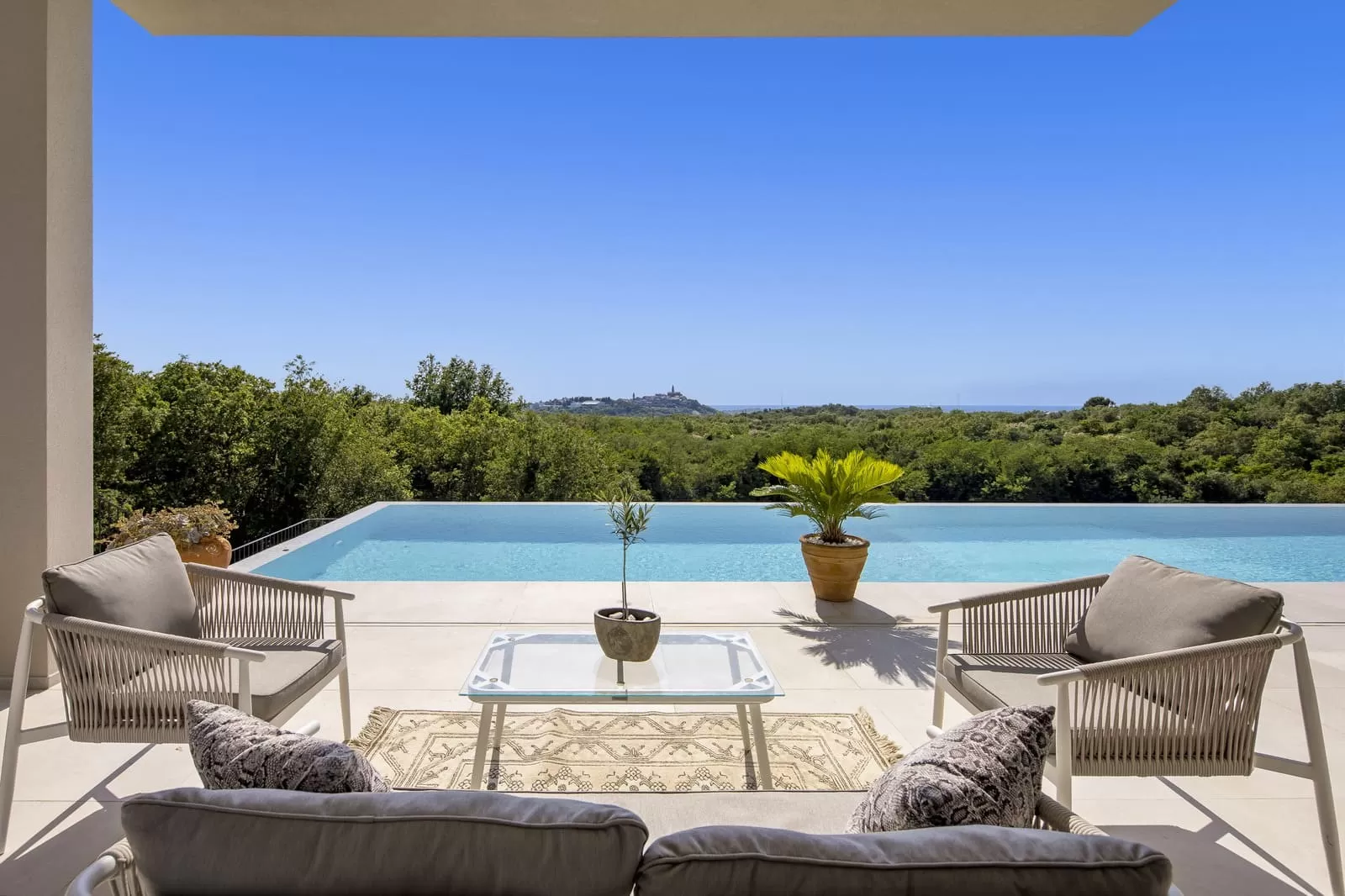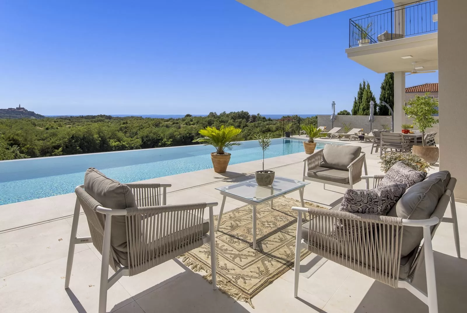 Der Außenbereich lädt zu purer Entspannung ein. Ein beeindruckender Infinity-Pool zieht sich entlang der Terrasse und verschmilzt optisch mit dem Horizont und dem satten Grün der Umgebung. Von hier aus eröffnet sich ein weiter Blick auf den historischen Hügelort in der Ferne, während der Duft von Pinien und Lavendel in der Luft liegt. Bequeme Liegen, stilvolle Lounge-Möbel und große Pflanzenarrangements schaffen eine Atmosphäre voll Leichtigkeit und Komfort. Dank des beheizten Pools lässt sich der Aufenthalt auch außerhalb der Sommersaison in vollen Zügen genießen. Auf der überdachten Terrasse laden große Esstische zu langen Abenden mit istrischem Wein und mediterranen Köstlichkeiten ein. Der gepflegte Rasen unterhalb der Poolterrasse bietet Raum für Freizeit, Entspannung oder stille Momente inmitten der Natur. Eine Sauna vervollständigt das Wellness-Erlebnis und sorgt für vollkommene Erholung. Die gesamte Anlage ist privat und ruhig gelegen, mit einem Panorama, das im Laufe des Tages in unzähligen Farben schimmert.