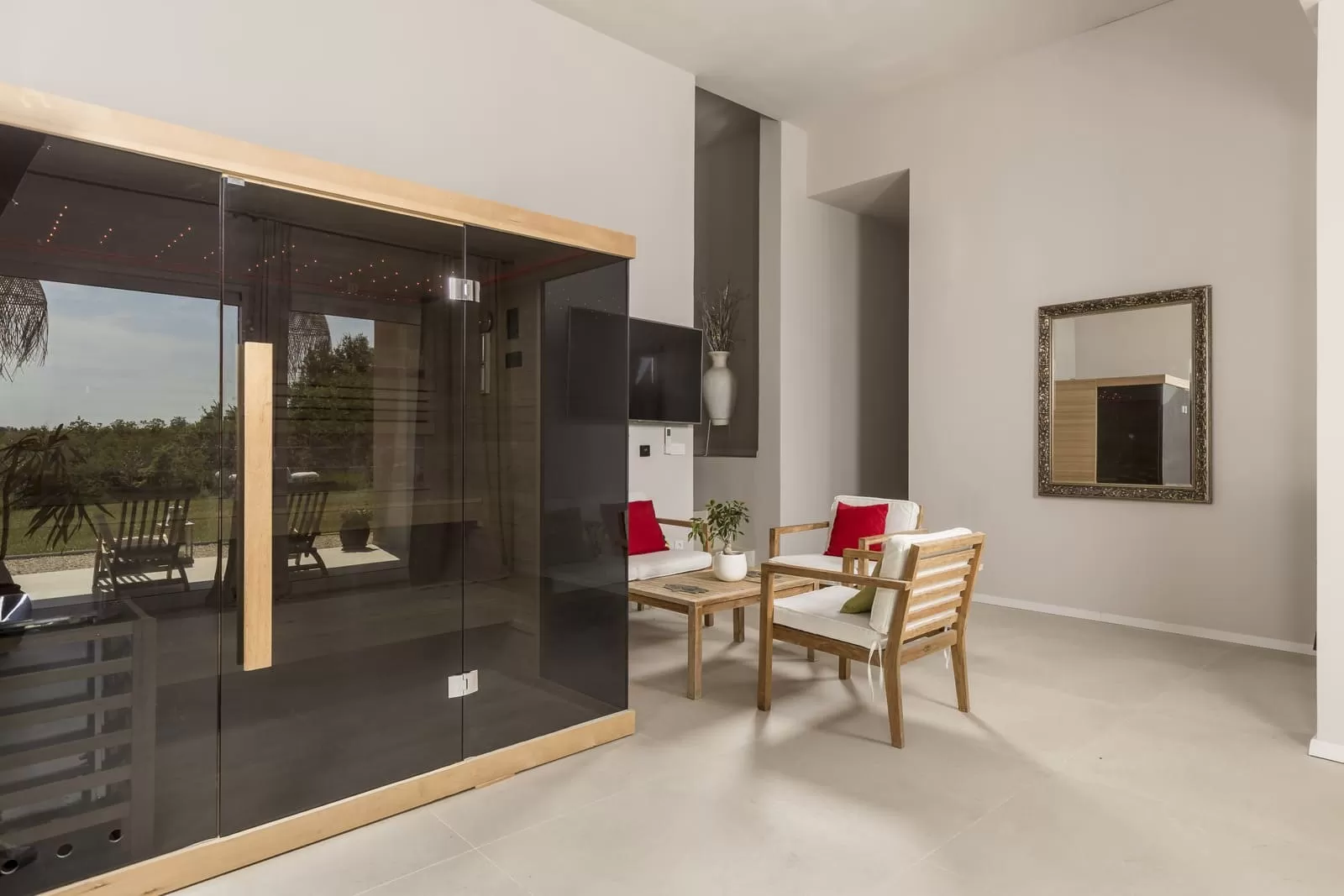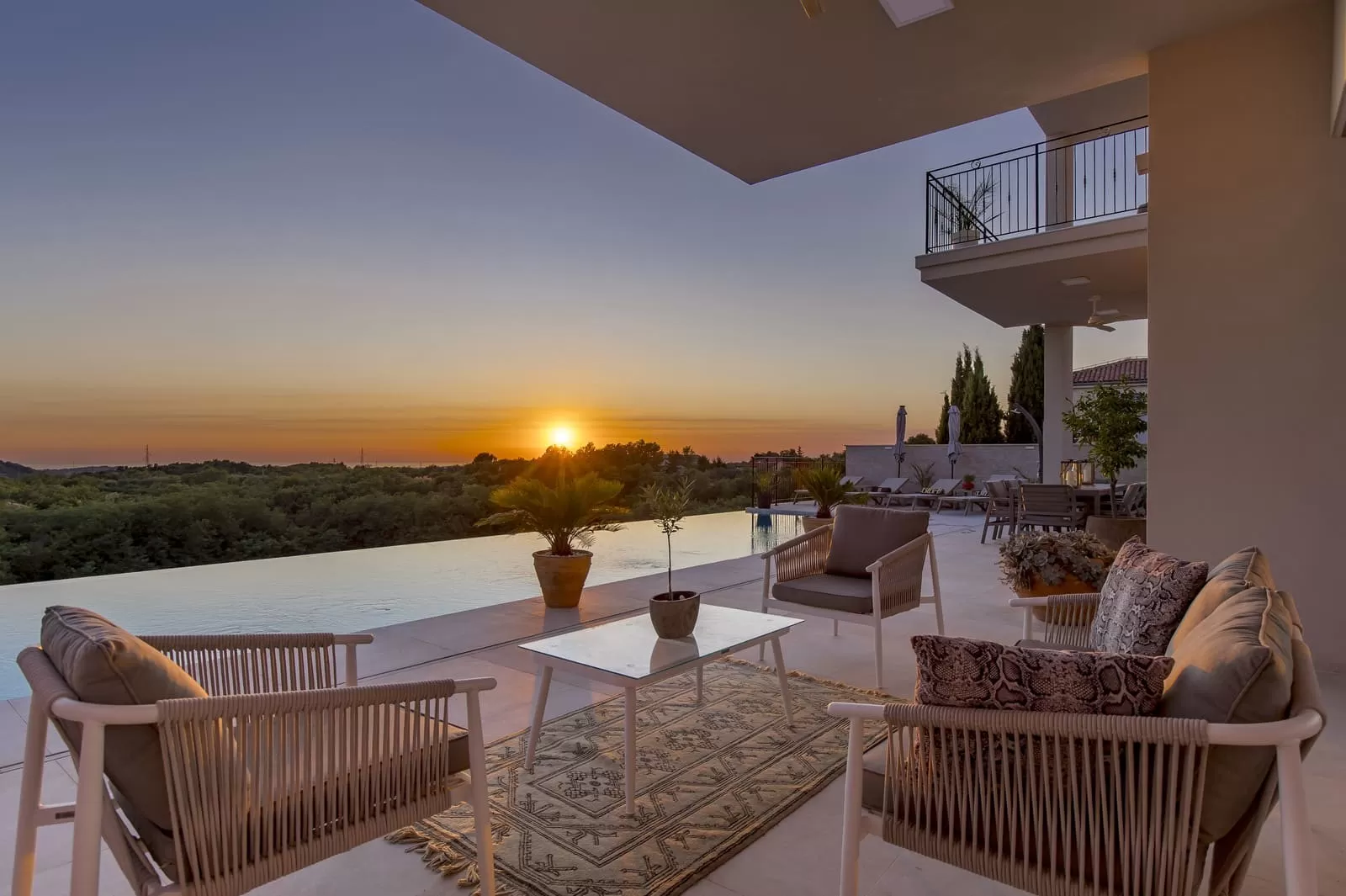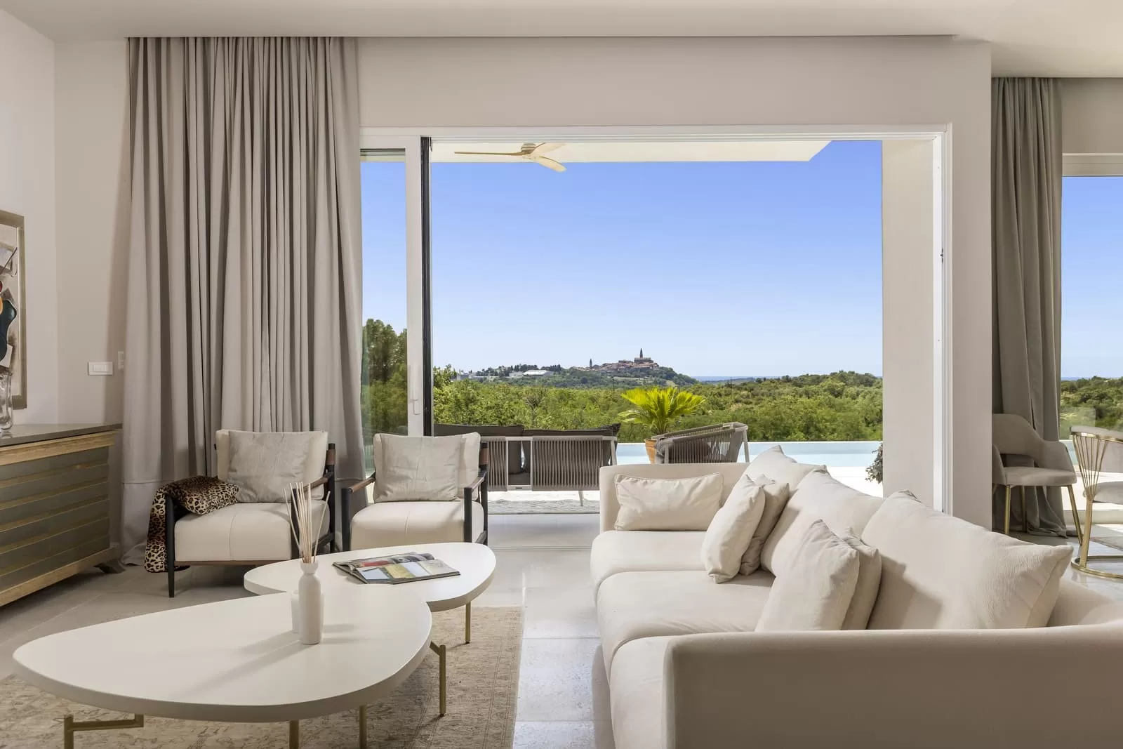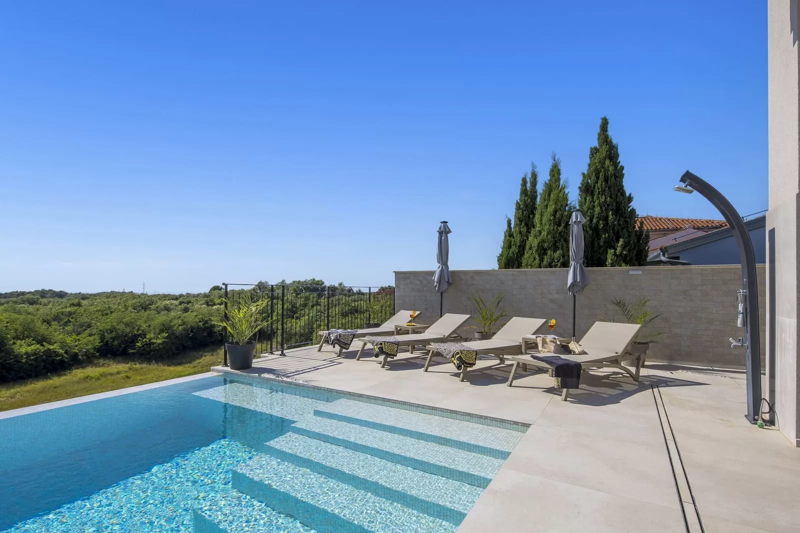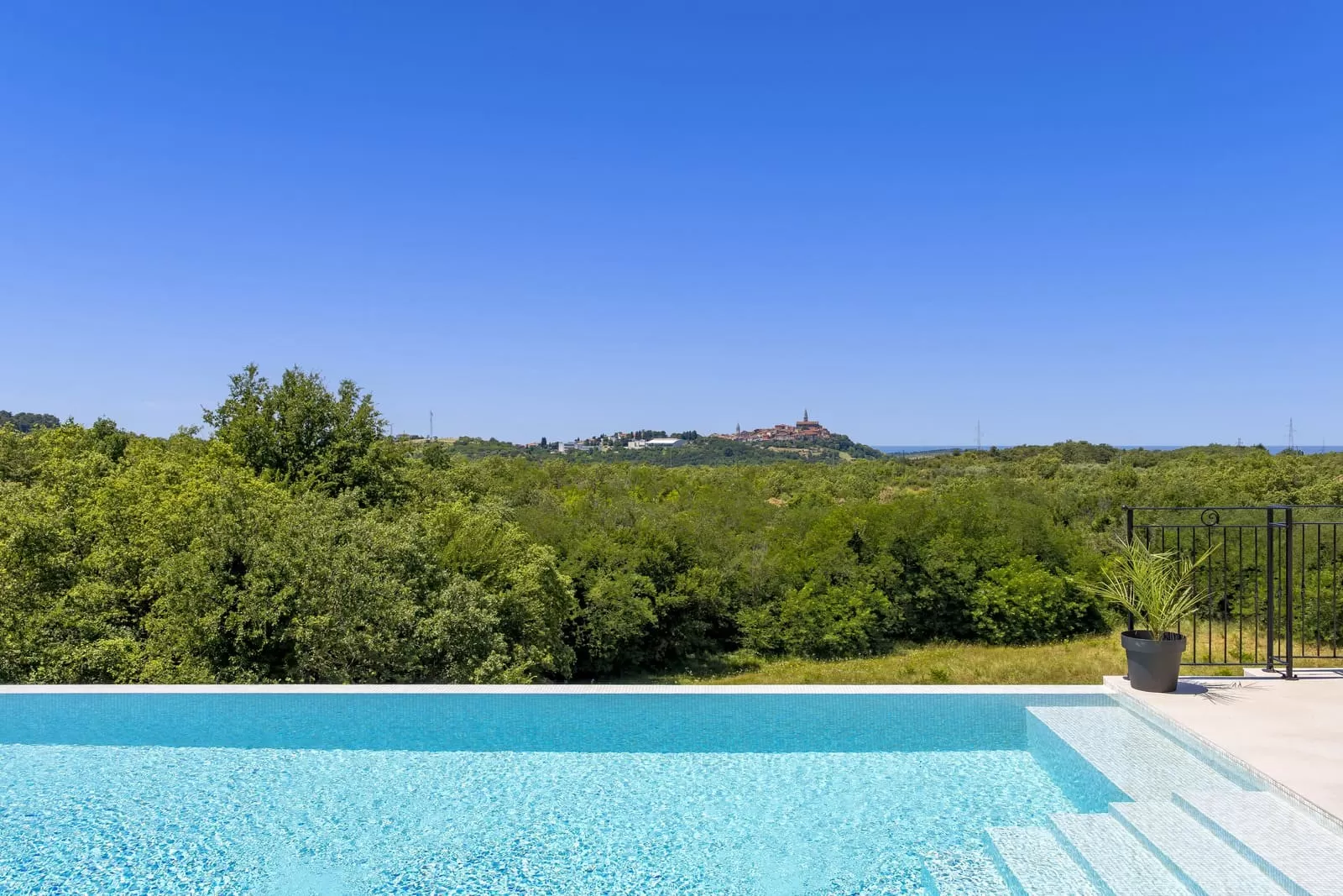 Der Außenbereich lädt zu purer Entspannung ein. Ein beeindruckender Infinity-Pool zieht sich entlang der Terrasse und verschmilzt optisch mit dem Horizont und dem satten Grün der Umgebung. Von hier aus eröffnet sich ein weiter Blick auf den historischen Hügelort in der Ferne, während der Duft von Pinien und Lavendel in der Luft liegt. Bequeme Liegen, stilvolle Lounge-Möbel und große Pflanzenarrangements schaffen eine Atmosphäre voll Leichtigkeit und Komfort. Dank des beheizten Pools lässt sich der Aufenthalt auch außerhalb der Sommersaison in vollen Zügen genießen. Auf der überdachten Terrasse laden große Esstische zu langen Abenden mit istrischem Wein und mediterranen Köstlichkeiten ein. Der gepflegte Rasen unterhalb der Poolterrasse bietet Raum für Freizeit, Entspannung oder stille Momente inmitten der Natur. Eine Sauna vervollständigt das Wellness-Erlebnis und sorgt für vollkommene Erholung. Die gesamte Anlage ist privat und ruhig gelegen, mit einem Panorama, das im Laufe des Tages in unzähligen Farben schimmert.