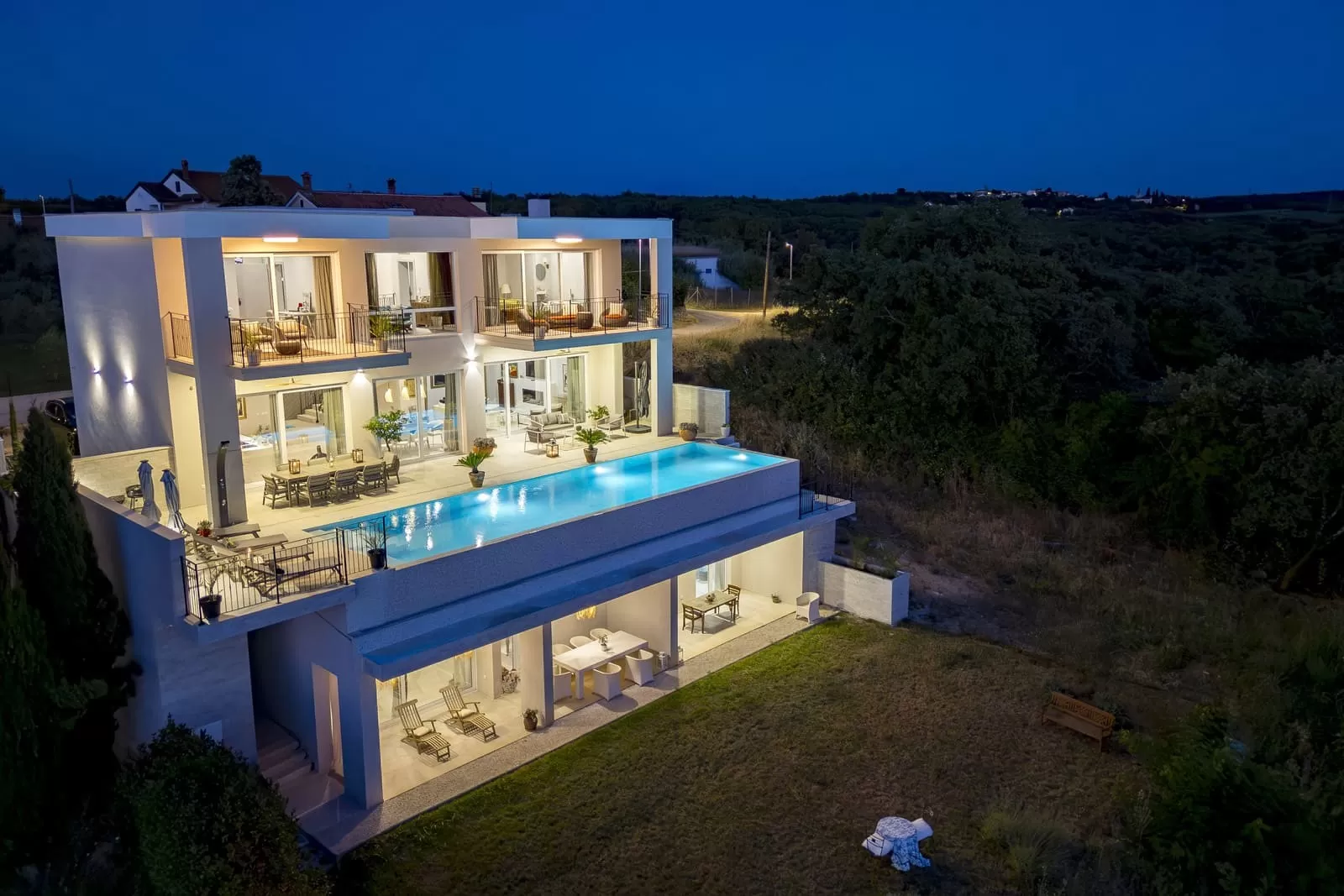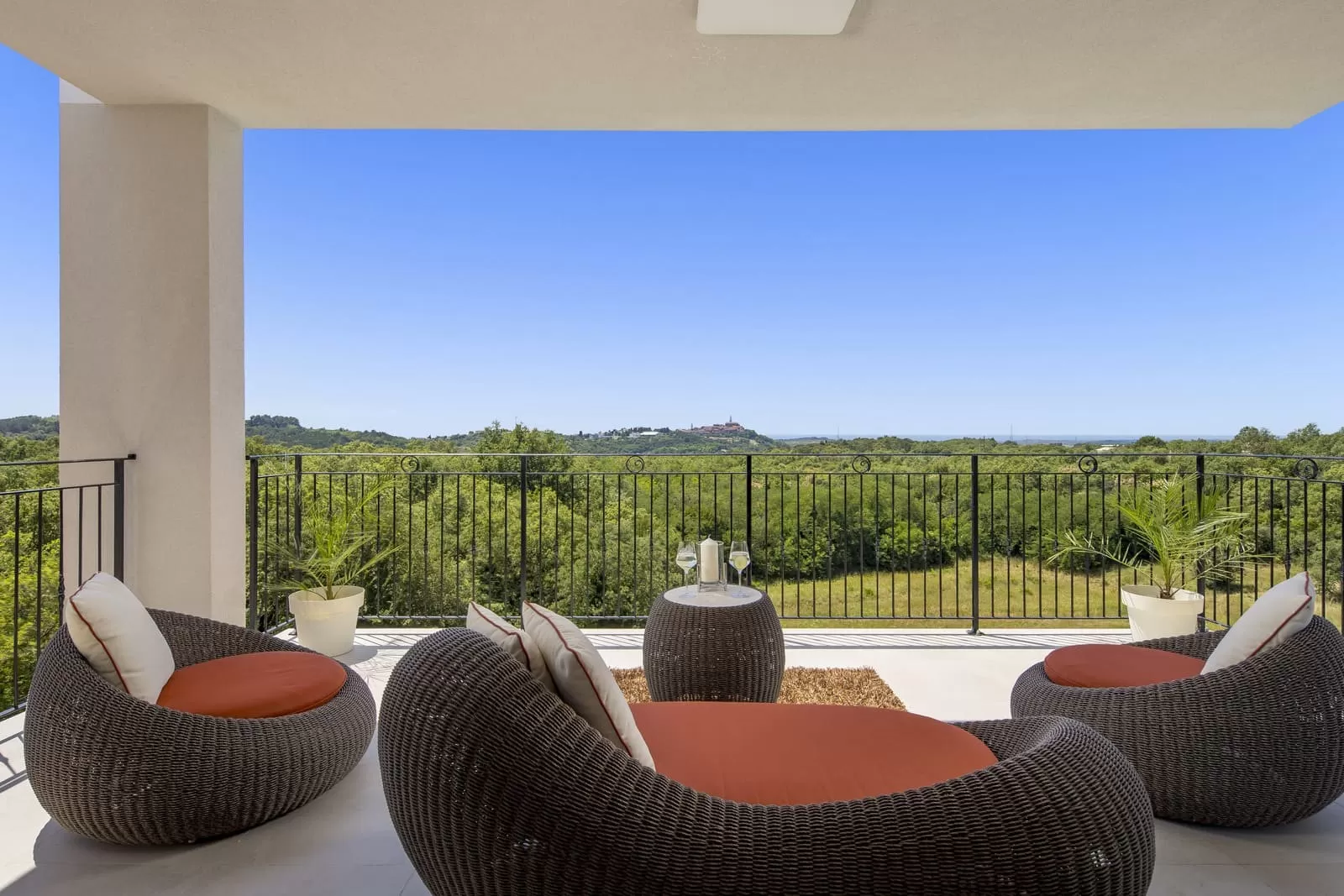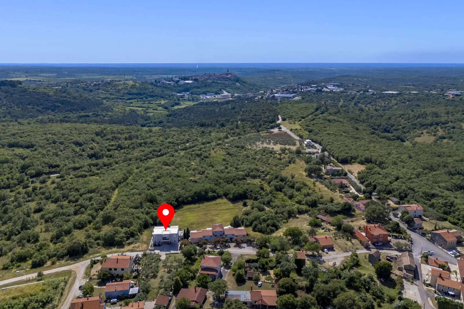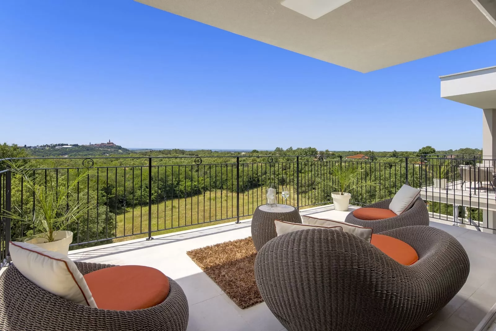 Der Außenbereich lädt zu purer Entspannung ein. Ein beeindruckender Infinity-Pool zieht sich entlang der Terrasse und verschmilzt optisch mit dem Horizont und dem satten Grün der Umgebung. Von hier aus eröffnet sich ein weiter Blick auf den historischen Hügelort in der Ferne, während der Duft von Pinien und Lavendel in der Luft liegt. Bequeme Liegen, stilvolle Lounge-Möbel und große Pflanzenarrangements schaffen eine Atmosphäre voll Leichtigkeit und Komfort. Dank des beheizten Pools lässt sich der Aufenthalt auch außerhalb der Sommersaison in vollen Zügen genießen. Auf der überdachten Terrasse laden große Esstische zu langen Abenden mit istrischem Wein und mediterranen Köstlichkeiten ein. Der gepflegte Rasen unterhalb der Poolterrasse bietet Raum für Freizeit, Entspannung oder stille Momente inmitten der Natur. Eine Sauna vervollständigt das Wellness-Erlebnis und sorgt für vollkommene Erholung. Die gesamte Anlage ist privat und ruhig gelegen, mit einem Panorama, das im Laufe des Tages in unzähligen Farben schimmert.