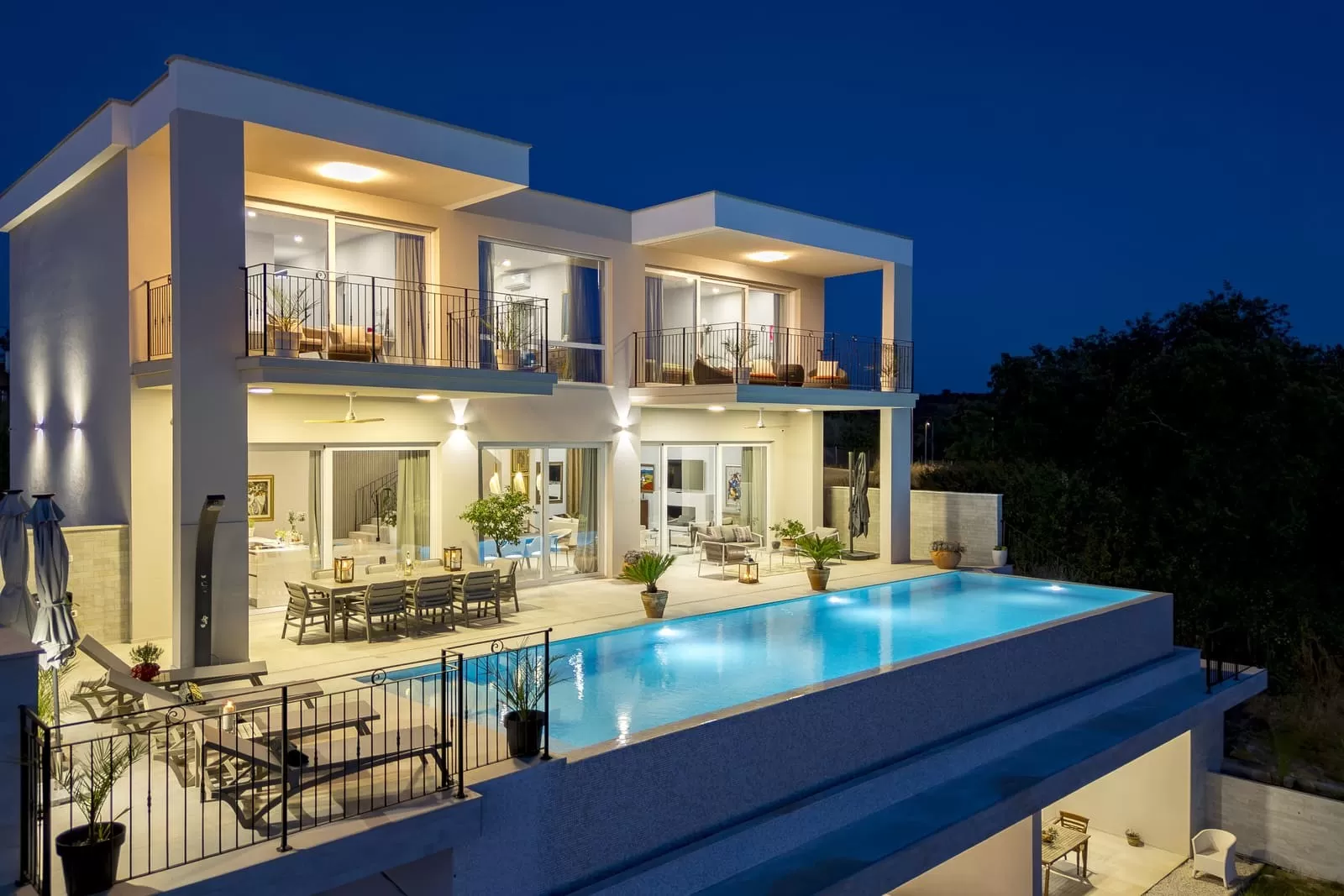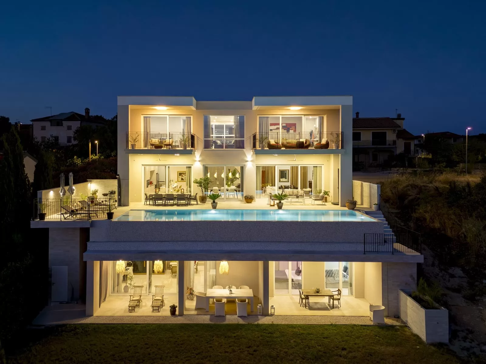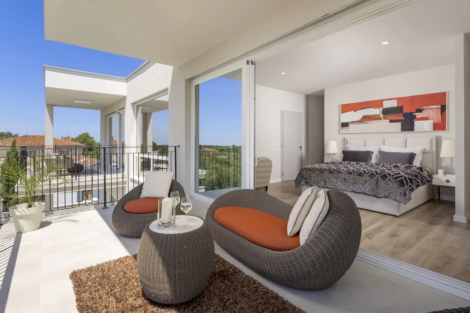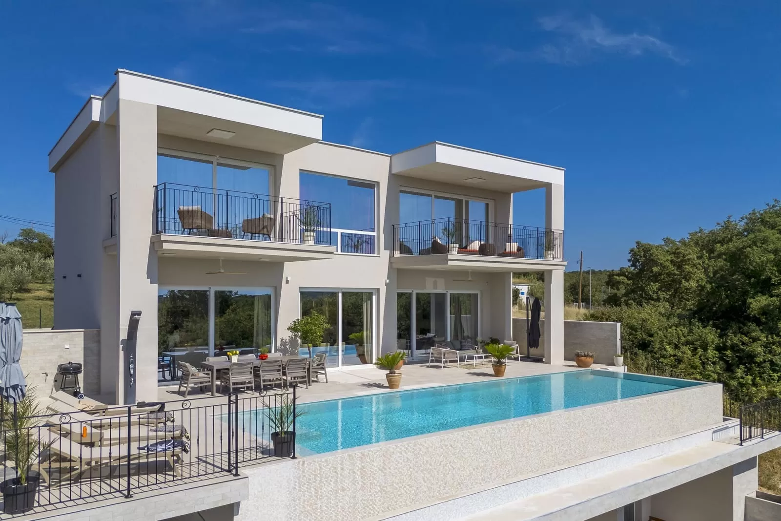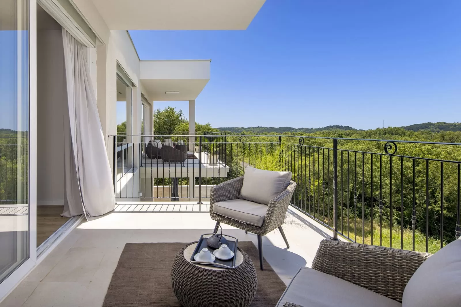 Der Außenbereich lädt zu purer Entspannung ein. Ein beeindruckender Infinity-Pool zieht sich entlang der Terrasse und verschmilzt optisch mit dem Horizont und dem satten Grün der Umgebung. Von hier aus eröffnet sich ein weiter Blick auf den historischen Hügelort in der Ferne, während der Duft von Pinien und Lavendel in der Luft liegt. Bequeme Liegen, stilvolle Lounge-Möbel und große Pflanzenarrangements schaffen eine Atmosphäre voll Leichtigkeit und Komfort. Dank des beheizten Pools lässt sich der Aufenthalt auch außerhalb der Sommersaison in vollen Zügen genießen. Auf der überdachten Terrasse laden große Esstische zu langen Abenden mit istrischem Wein und mediterranen Köstlichkeiten ein. Der gepflegte Rasen unterhalb der Poolterrasse bietet Raum für Freizeit, Entspannung oder stille Momente inmitten der Natur. Eine Sauna vervollständigt das Wellness-Erlebnis und sorgt für vollkommene Erholung. Die gesamte Anlage ist privat und ruhig gelegen, mit einem Panorama, das im Laufe des Tages in unzähligen Farben schimmert.