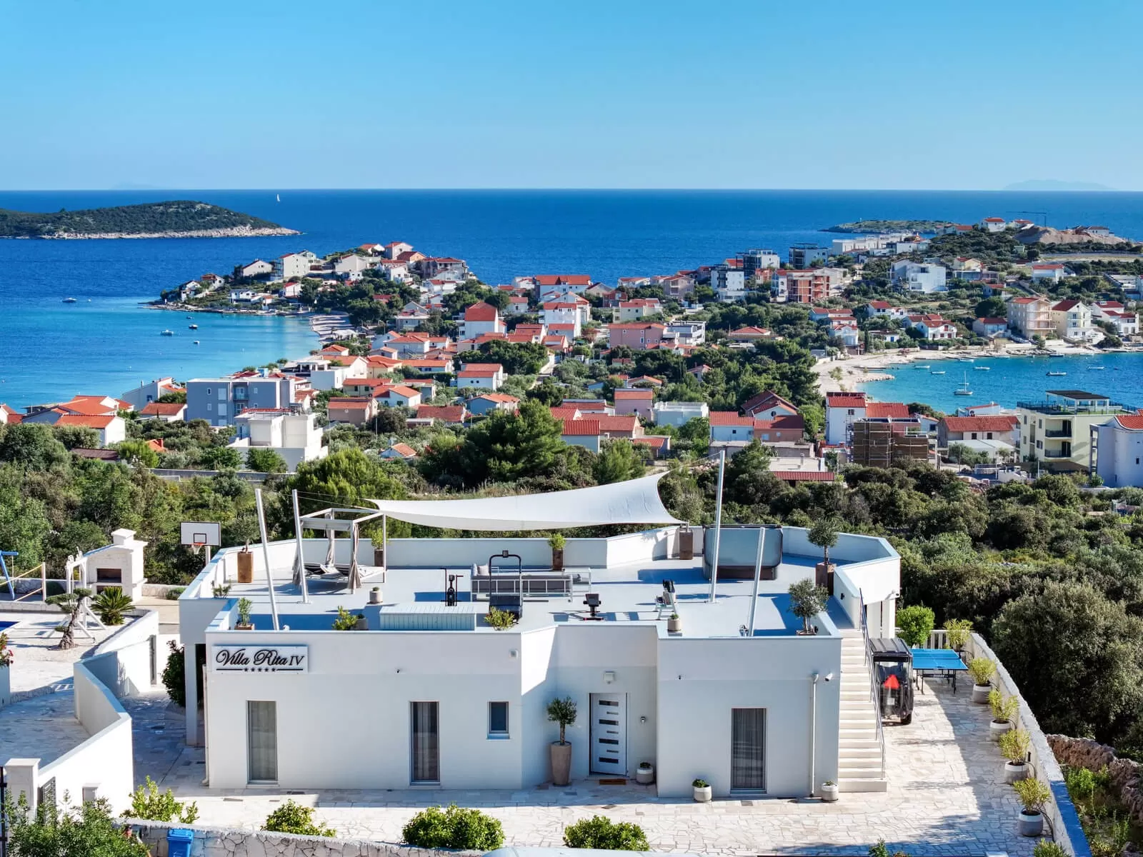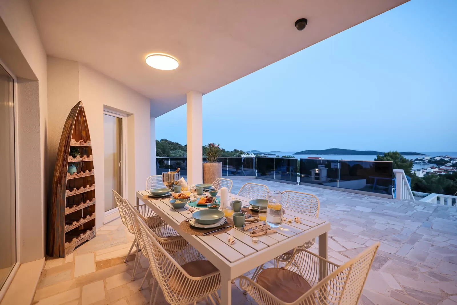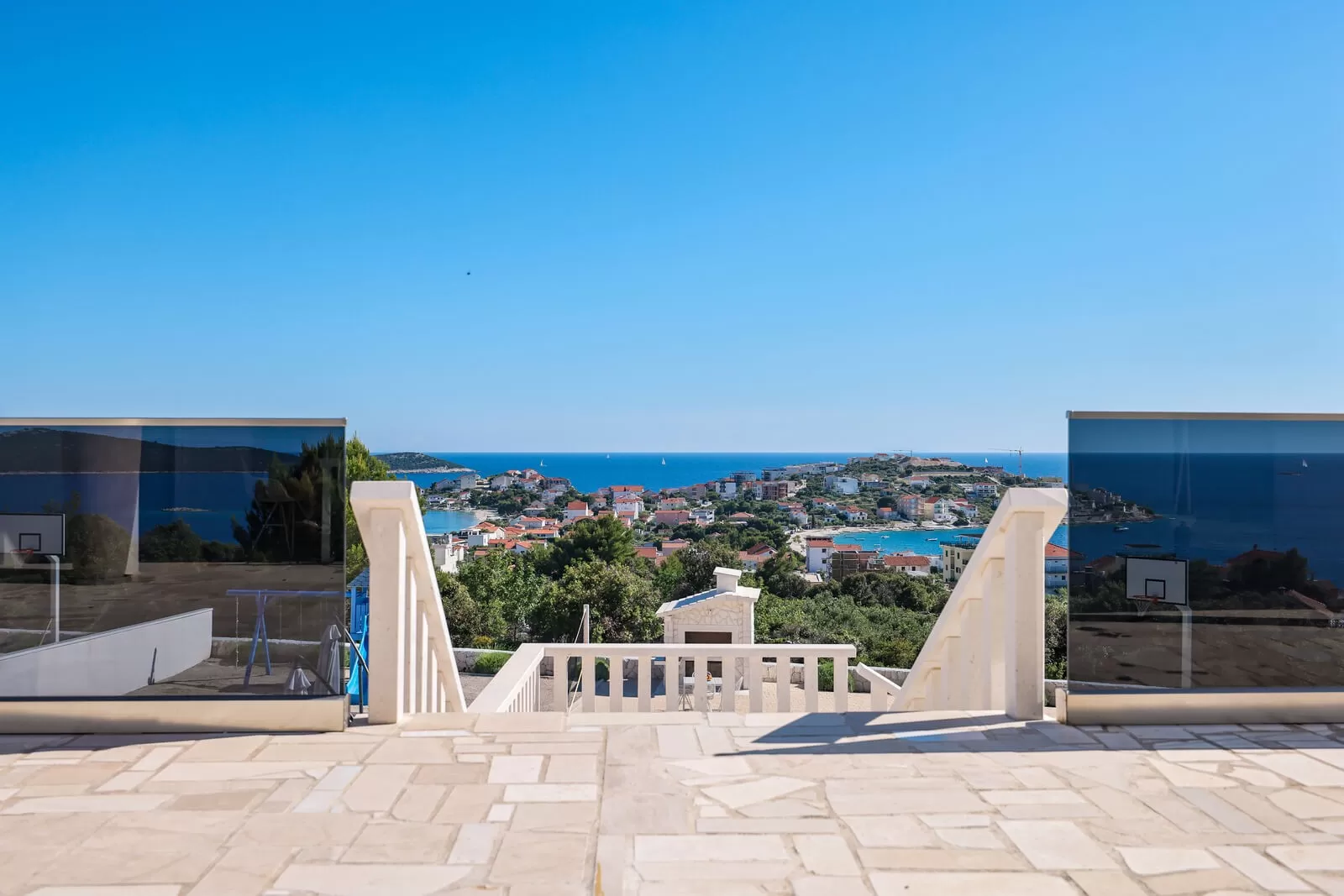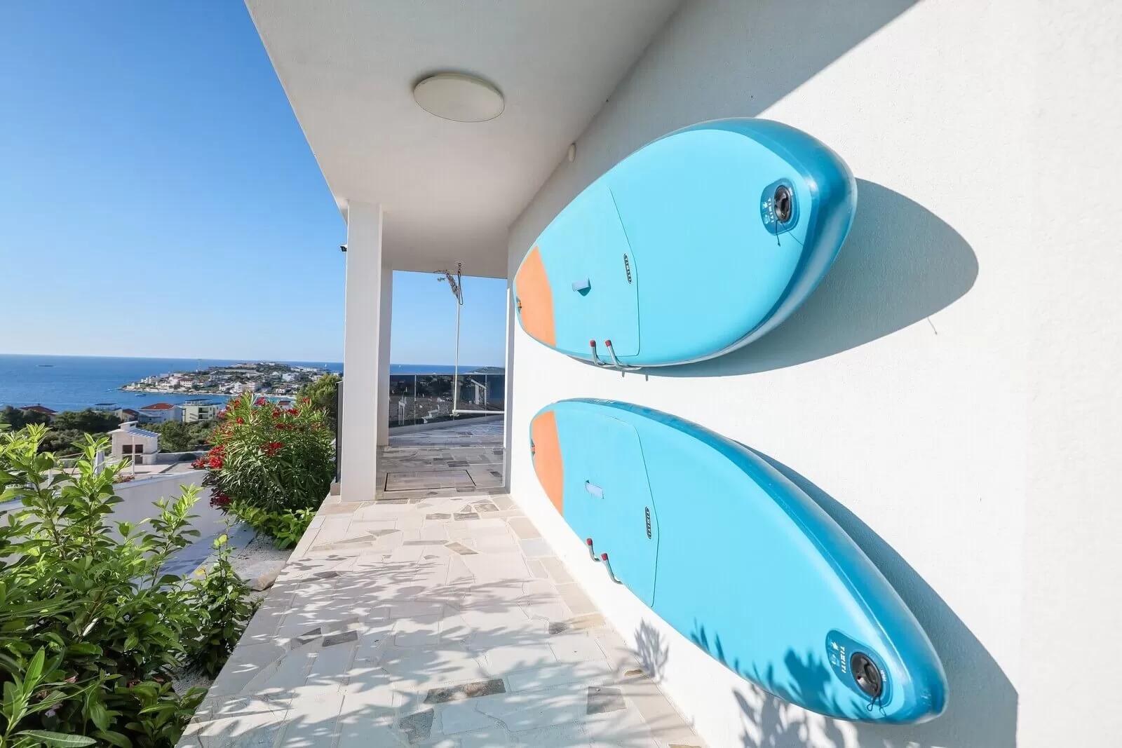 Villa Lumi nimmt eine prestigeträchtige Position als Symbol des Luxus entlang der wunderschönen Küste Dalmatiens ein und sticht mit ihrer imposanten Präsenz auf einem großzügigen 1500 Quadratmeter großen Grundstück hervor. Im Jahr 2020 erbaut, fasziniert diese luxuriöse Residenz durch ihre zeitgenössische Architektur und spektakuläre Aussicht auf das endlose Blau der Adria. Mit drei geräumigen Schlafzimmern, von denen jedes über ein eigenes Bad verfügt, bietet Villa Lumi unvergleichlichen Komfort und Privatsphäre für sechs bis acht Gäste. Der Außenbereich der Villa Lumi ist eine wahre Oase der Entspannung und Unterhaltung. Die großzügige Terrasse mit Pool bietet eine unwiderstehliche Gelegenheit zur Erfrischung im kristallklaren Wasser und gleichzeitig einen spektakulären Panoramablick auf die Adria. Auf der zweiten Ebene der Terrasse können die Gäste verschiedene Aktivitäten wie Beachvolleyball, Tischtennis oder Basketball genießen, während die Abende mit köstlichen Mahlzeiten vom Grill oder entspannten Momenten auf dem Kinderspielplatz verbracht werden können.