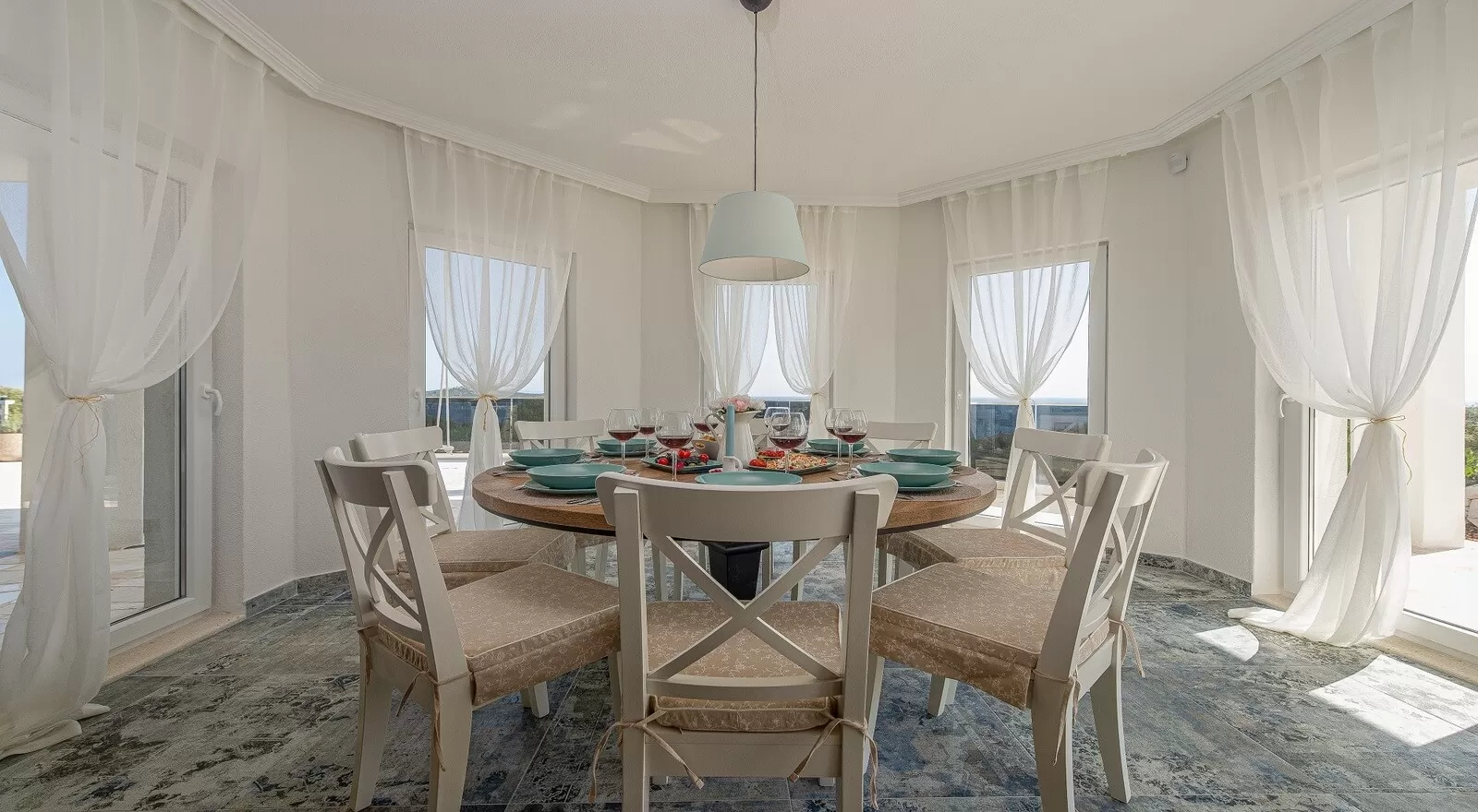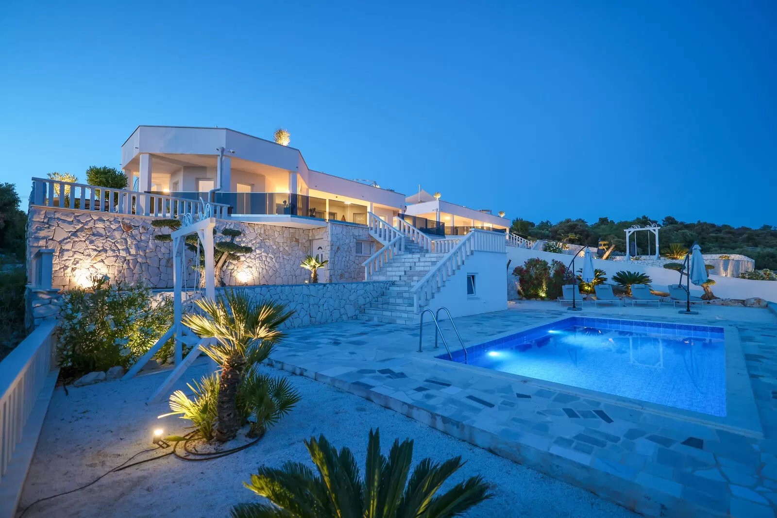 Im Inneren der Villa Lumi finden die Gäste einen Raum vor, der Eleganz und Komfort ausstrahlt. Das Wohnzimmer erstreckt sich als faszinierende Bühne für Entspannung, mit einer luftigen Atmosphäre, die durch bequeme Ledersofas in warmen Tönen bereichert wird. Große Fenster lassen viel Tageslicht herein und bieten spektakuläre Ausblicke auf die umliegende Landschaft. Diese Oase der Entspannung wird durch künstlerische Details, Pflanzen und geschmückte Wände weiter bereichert. Die Küche ist funktional und ästhetisch gestaltet, ausgestattet mit modernen Geräten und eleganten Holzelementen, die eine angenehme Umgebung zum Kochen und geselligen Beisammensein schaffen. Der Essbereich bietet eine intime Atmosphäre für Familienmahlzeiten oder Abendveranstaltungen und ermöglicht es den Gästen, kulinarische Genüsse bei einem wunderschönen Blick auf das Meer durch bodentiefe Fenster zu genießen. Der Außenbereich der Villa Lumi strahlt Eleganz und Harmonie mit der Umgebung aus und schafft eine wahre Oase für die Seele und den Körper. Die großzügige, sonnenverwöhnte Terrasse lädt zu unvergesslichen Momenten der Entspannung und des Genusses ein. Der Pool, wie ein Juwel inmitten der Natur, bietet Erfrischung und Unterhaltung unter dem funkelnden dalmatinischen Himmel. Das sandige Volleyballfeld, umgeben von viel Grün, wird zu einem Ort, an dem Sport, Gelächter und Freundschaft zusammenkommen. Der Außenessbereich, von der Sonne beleuchtet, die auf den Wellen tanzt, bietet die ideale Kulisse für zauberhafte Abende mit dem Duft des Mittelmeers und dem Klang der Wellen. Mit dem Glitzern des Whirlpools unter dem Sternenhimmel wird jeder Moment zu einem besonderen Erlebnis, und jeder Blick wird zu einem Bild, das das Herz bewahrt.