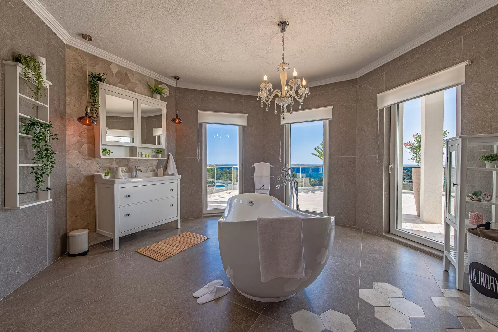 Villa Lumi bietet nicht nur unglaubliche Annehmlichkeiten innerhalb ihrer Mauern, sondern befindet sich auch in unmittelbarer Nähe einer Fülle von Attraktionen und Sehenswürdigkeiten, die Dalmatien zu einem unwiderstehlichen Reiseziel machen. Für Geschichtsliebhaber liegt die charmante Stadt Trogir, ein UNESCO-Weltkulturerbe, nur eine kurze Autofahrt entfernt und bietet eine wunderschöne Architektur, enge Gassen und den unverwechselbaren mediterranen Geist. Die Insel Čiovo, die mit dem Festland durch eine Brücke verbunden ist, lockt Besucher mit ihren malerischen Stränden, versteckten Buchten und kristallklarem Meer. Für Abenteuerlustige bietet der Nationalpark Krka mit seinen üppigen Wasserfällen und der unberührten Natur ein unvergessliches Erlebnis der Natur. Auf der anderen Seite begeistert die gastronomische Szene Dalmatiens den Gaumen mit einer Vielzahl von Gerichten, von frischem Meeresfrüchten bis hin zu traditionellen dalmatinischen Spezialitäten. All dies macht Villa Lumi zur idealen Wahl für Reisende, die eine Mischung aus Luxus, Komfort und authentischem mediterranem Erlebnis im zauberhaften Kroatien suchen.