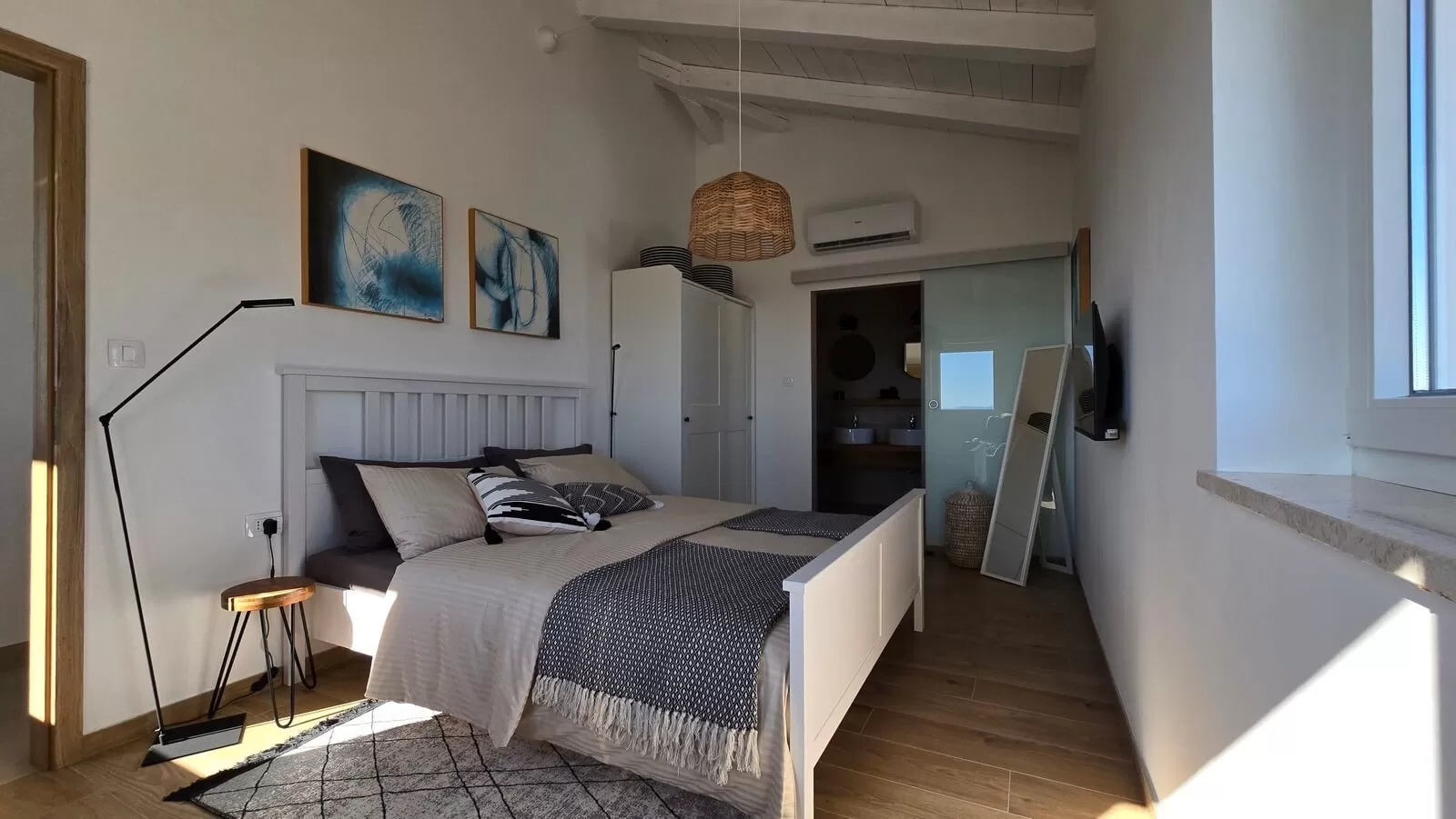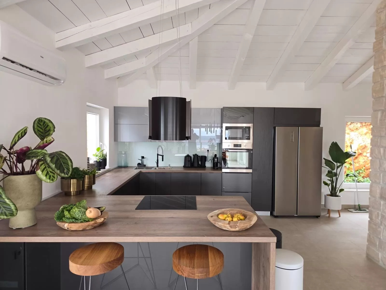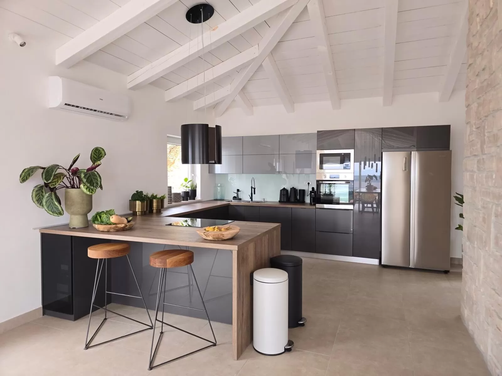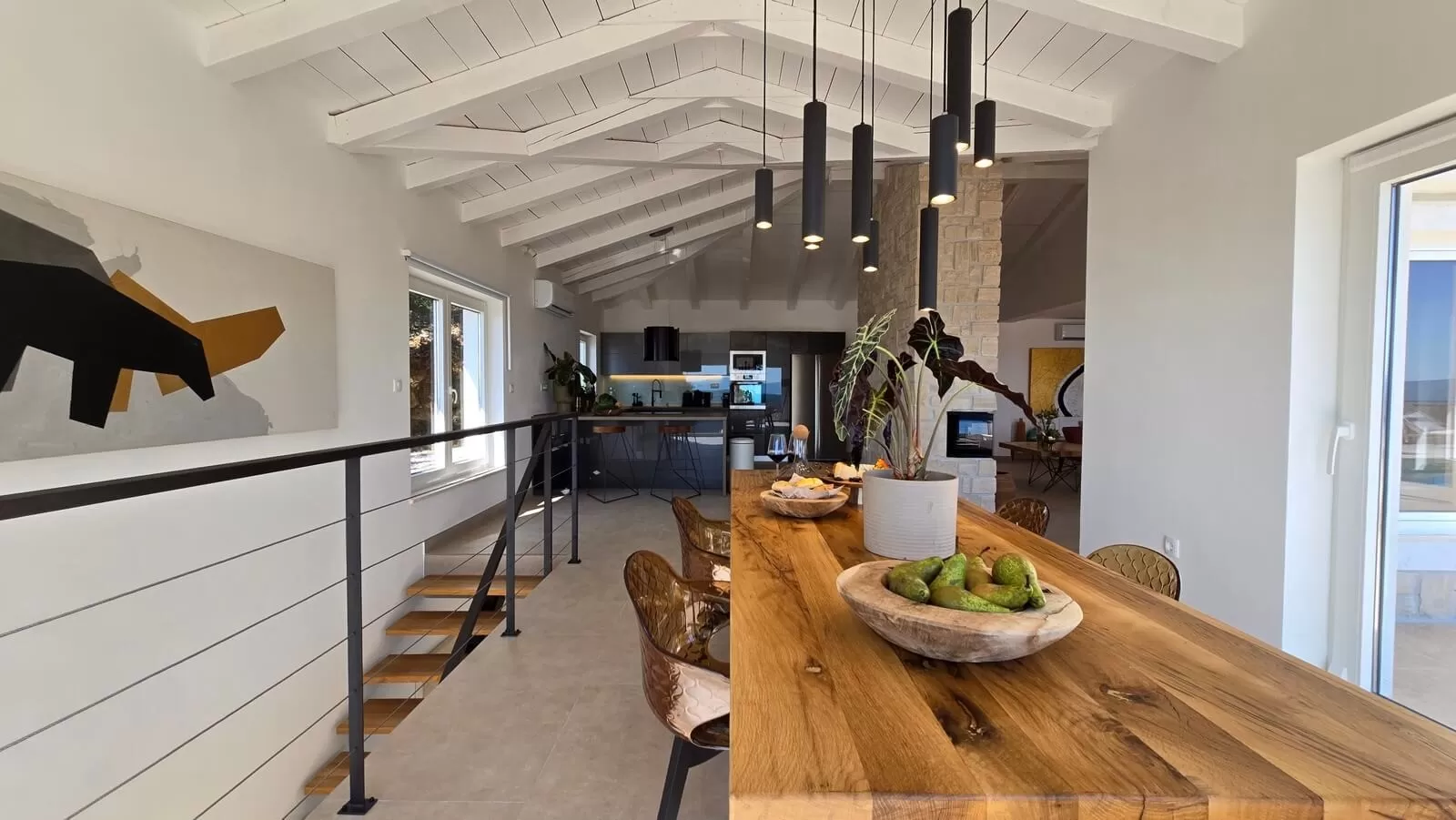 Im Inneren begeistert die Villa Luminosa mit ihrer modernen Schlichtheit und wohnlichen Wärme. Großzügige Fenster lassen das Tageslicht ungehindert hereinströmen und betonen die Verbindung zwischen Architektur und Natur. Der offene Wohnbereich kombiniert klare Linien mit natürlichen Akzenten – sanfte Beige- und Holztöne, stilvolle Kunstwerke und hochwertige Möbel schaffen ein Ambiente, das Ruhe und Eleganz ausstrahlt. Die voll ausgestattete Küche mit Kochinsel geht fließend in den Essbereich über, dessen großer Holztisch einen herrlichen Blick auf das Meer bietet. Das Wohnzimmer mit modernen Sofas und minimalistischen Details ist der ideale Ort, um den Tag bei einem Glas Wein ausklingen zu lassen. Drei Schlafzimmer, jeweils mit eigenem Bad, Klimaanlage und Fernseher, garantieren Komfort und Privatsphäre. Hochwertige Bettwäsche, sorgfältig ausgewählte Accessoires und natürliche Materialien schaffen ein Gefühl von entspannter Eleganz. Die Badezimmer sind modern und stilvoll, mit Glasduschen, Steinfliesen und sanfter Beleuchtung, die an ein Spa erinnert.