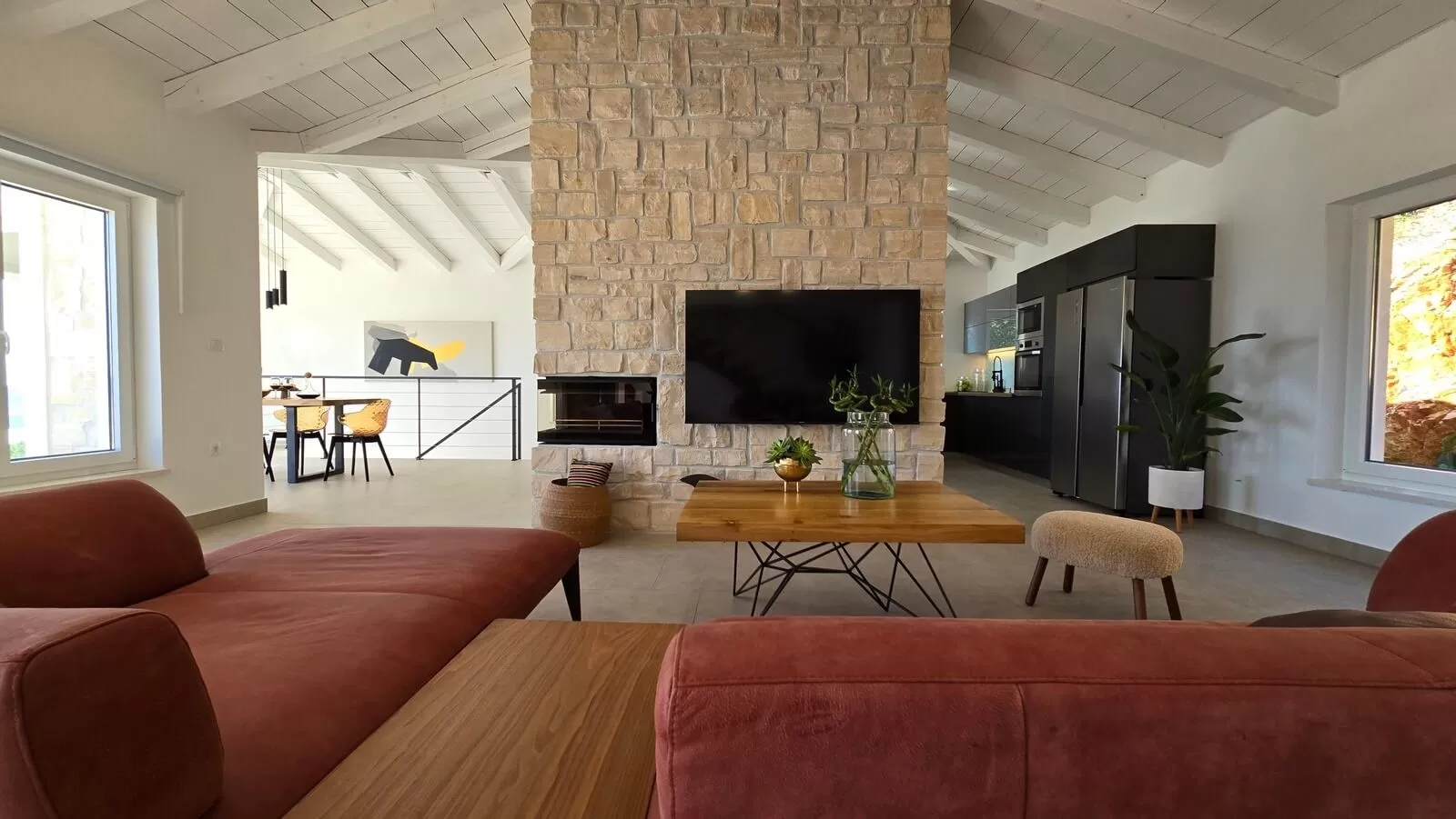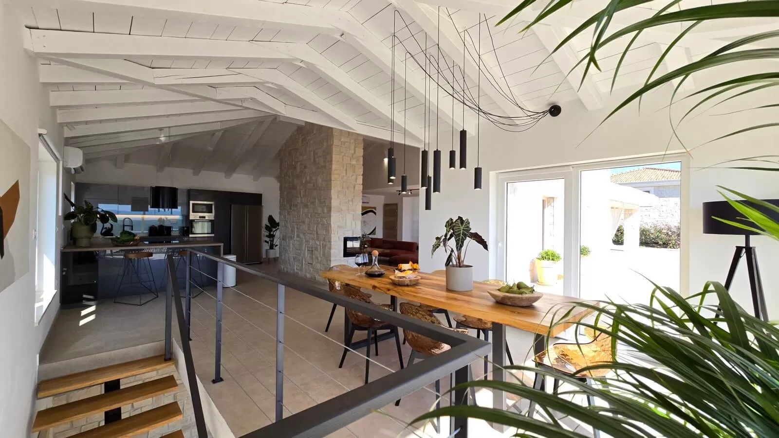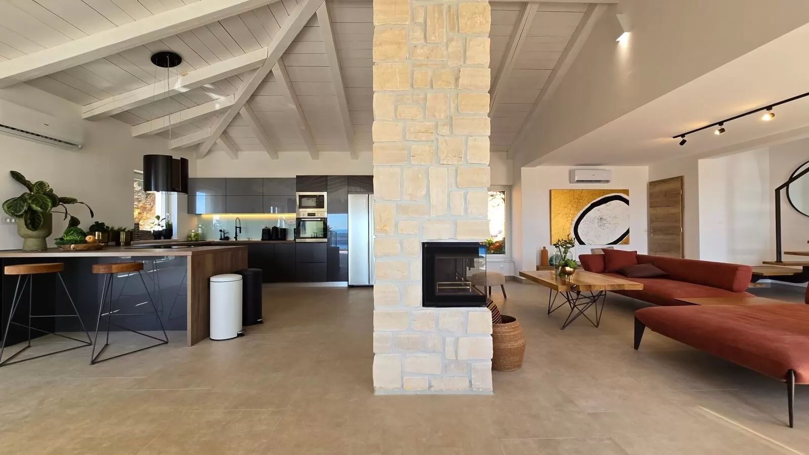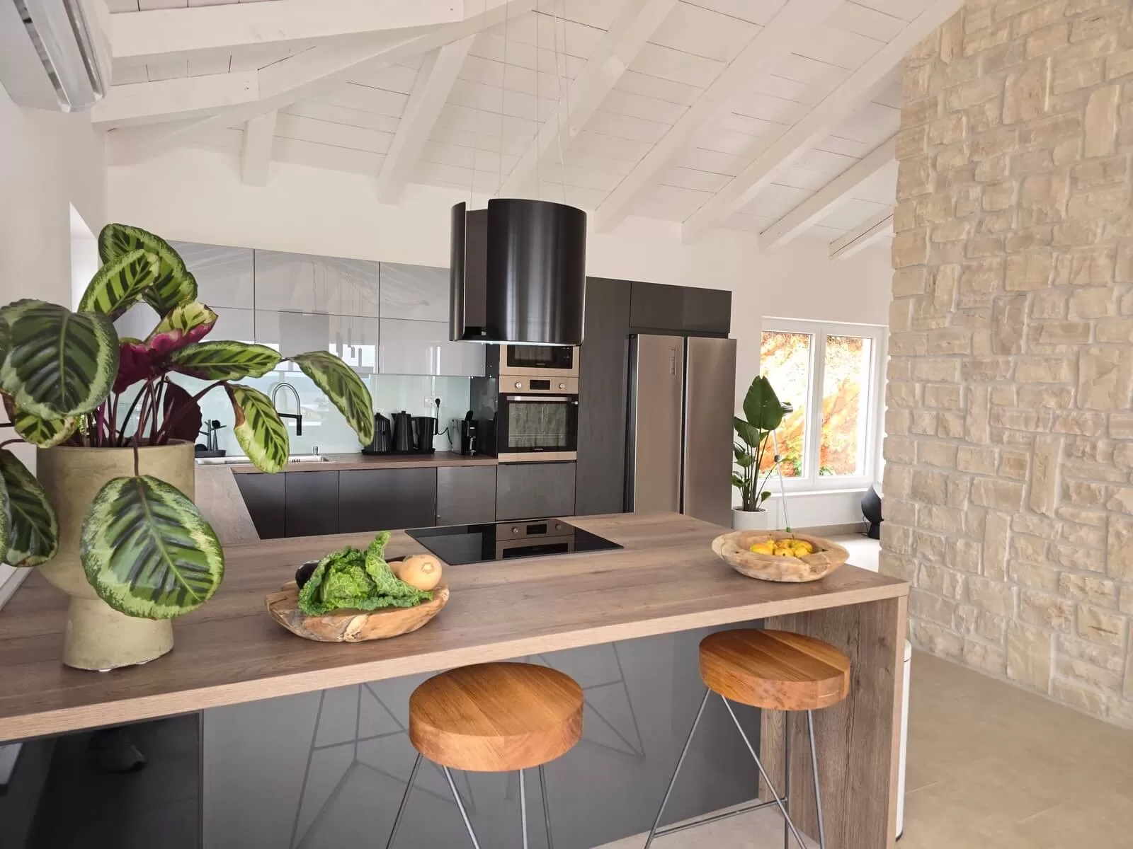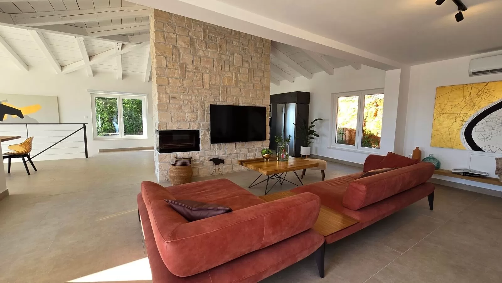Im Inneren begeistert die Villa Luminosa mit ihrer modernen Schlichtheit und wohnlichen Wärme. Großzügige Fenster lassen das Tageslicht ungehindert hereinströmen und betonen die Verbindung zwischen Architektur und Natur. Der offene Wohnbereich kombiniert klare Linien mit natürlichen Akzenten – sanfte Beige- und Holztöne, stilvolle Kunstwerke und hochwertige Möbel schaffen ein Ambiente, das Ruhe und Eleganz ausstrahlt. Die voll ausgestattete Küche mit Kochinsel geht fließend in den Essbereich über, dessen großer Holztisch einen herrlichen Blick auf das Meer bietet. Das Wohnzimmer mit modernen Sofas und minimalistischen Details ist der ideale Ort, um den Tag bei einem Glas Wein ausklingen zu lassen. Drei Schlafzimmer, jeweils mit eigenem Bad, Klimaanlage und Fernseher, garantieren Komfort und Privatsphäre. Hochwertige Bettwäsche, sorgfältig ausgewählte Accessoires und natürliche Materialien schaffen ein Gefühl von entspannter Eleganz. Die Badezimmer sind modern und stilvoll, mit Glasduschen, Steinfliesen und sanfter Beleuchtung, die an ein Spa erinnert.