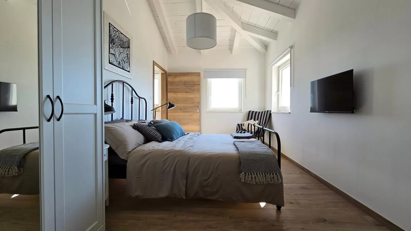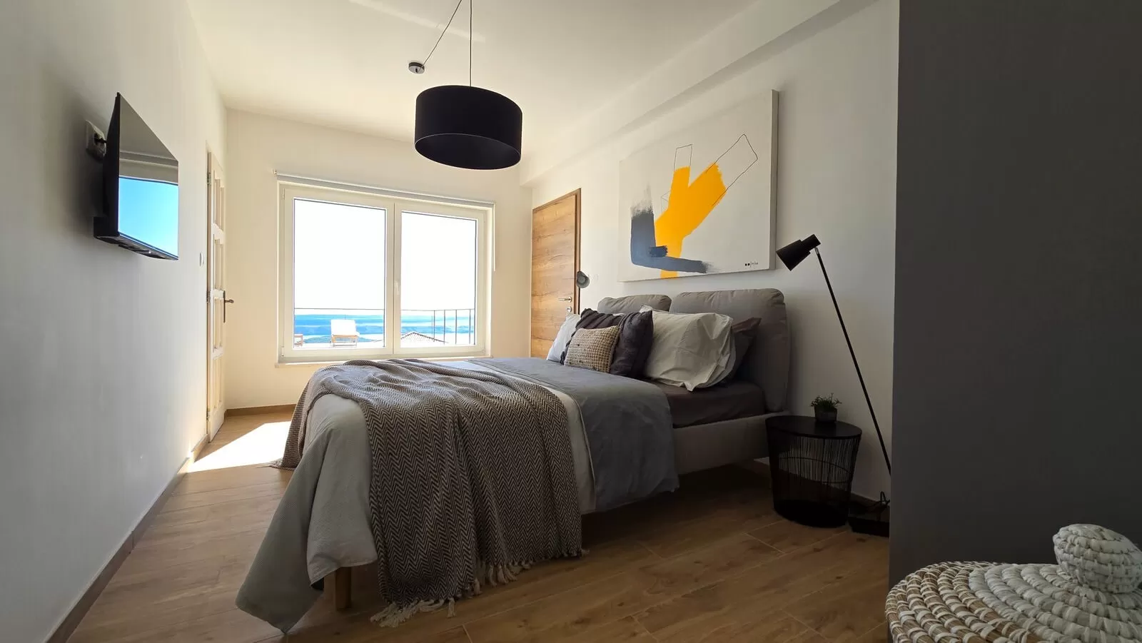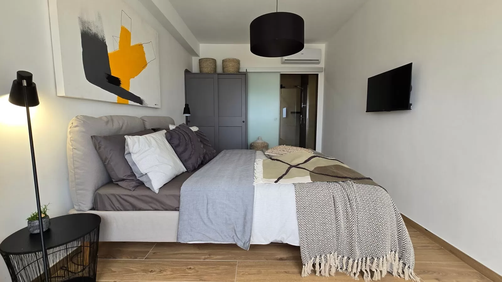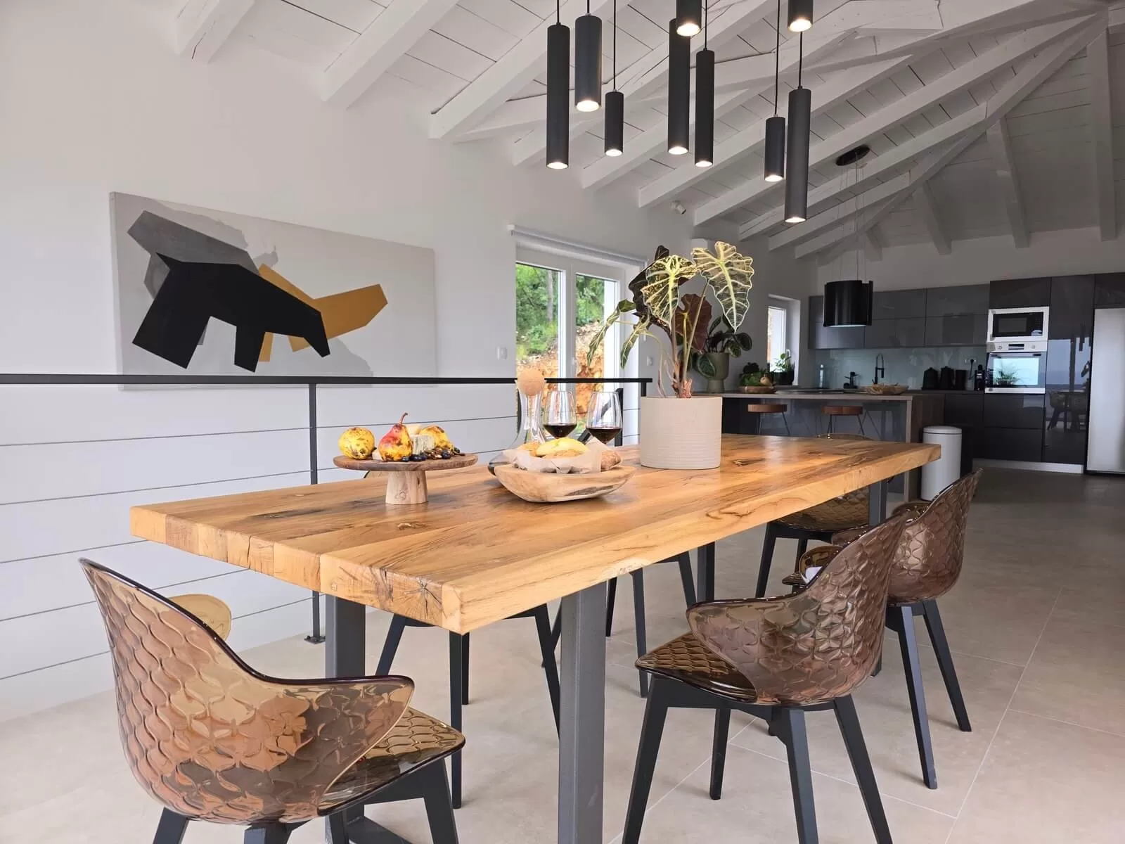Im Inneren begeistert die Villa Luminosa mit ihrer modernen Schlichtheit und wohnlichen Wärme. Großzügige Fenster lassen das Tageslicht ungehindert hereinströmen und betonen die Verbindung zwischen Architektur und Natur. Der offene Wohnbereich kombiniert klare Linien mit natürlichen Akzenten – sanfte Beige- und Holztöne, stilvolle Kunstwerke und hochwertige Möbel schaffen ein Ambiente, das Ruhe und Eleganz ausstrahlt. Die voll ausgestattete Küche mit Kochinsel geht fließend in den Essbereich über, dessen großer Holztisch einen herrlichen Blick auf das Meer bietet. Das Wohnzimmer mit modernen Sofas und minimalistischen Details ist der ideale Ort, um den Tag bei einem Glas Wein ausklingen zu lassen. Drei Schlafzimmer, jeweils mit eigenem Bad, Klimaanlage und Fernseher, garantieren Komfort und Privatsphäre. Hochwertige Bettwäsche, sorgfältig ausgewählte Accessoires und natürliche Materialien schaffen ein Gefühl von entspannter Eleganz. Die Badezimmer sind modern und stilvoll, mit Glasduschen, Steinfliesen und sanfter Beleuchtung, die an ein Spa erinnert.