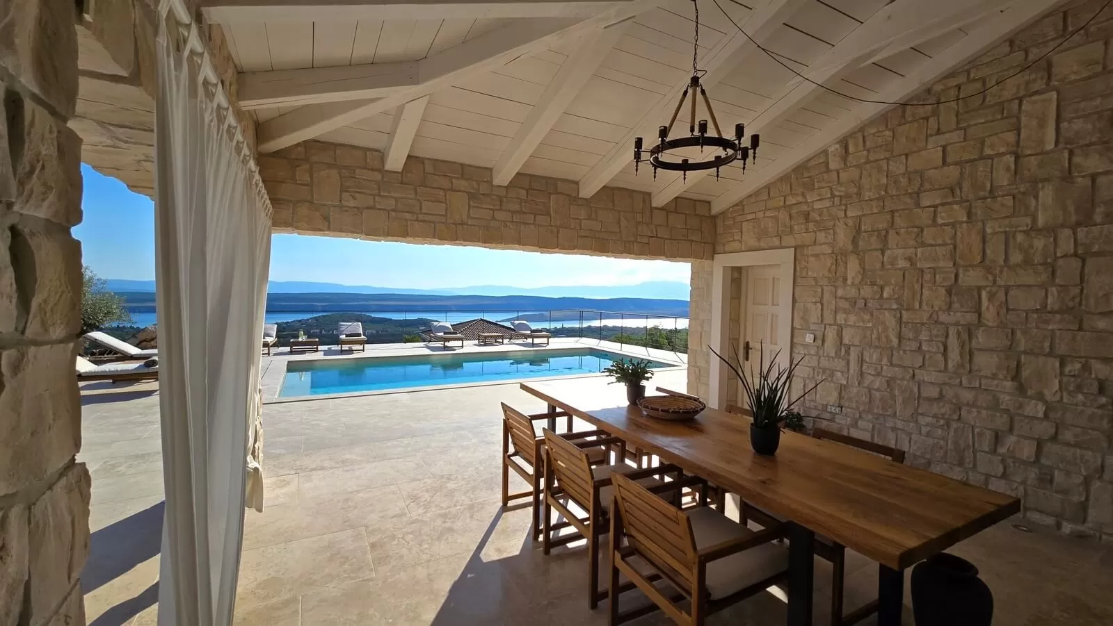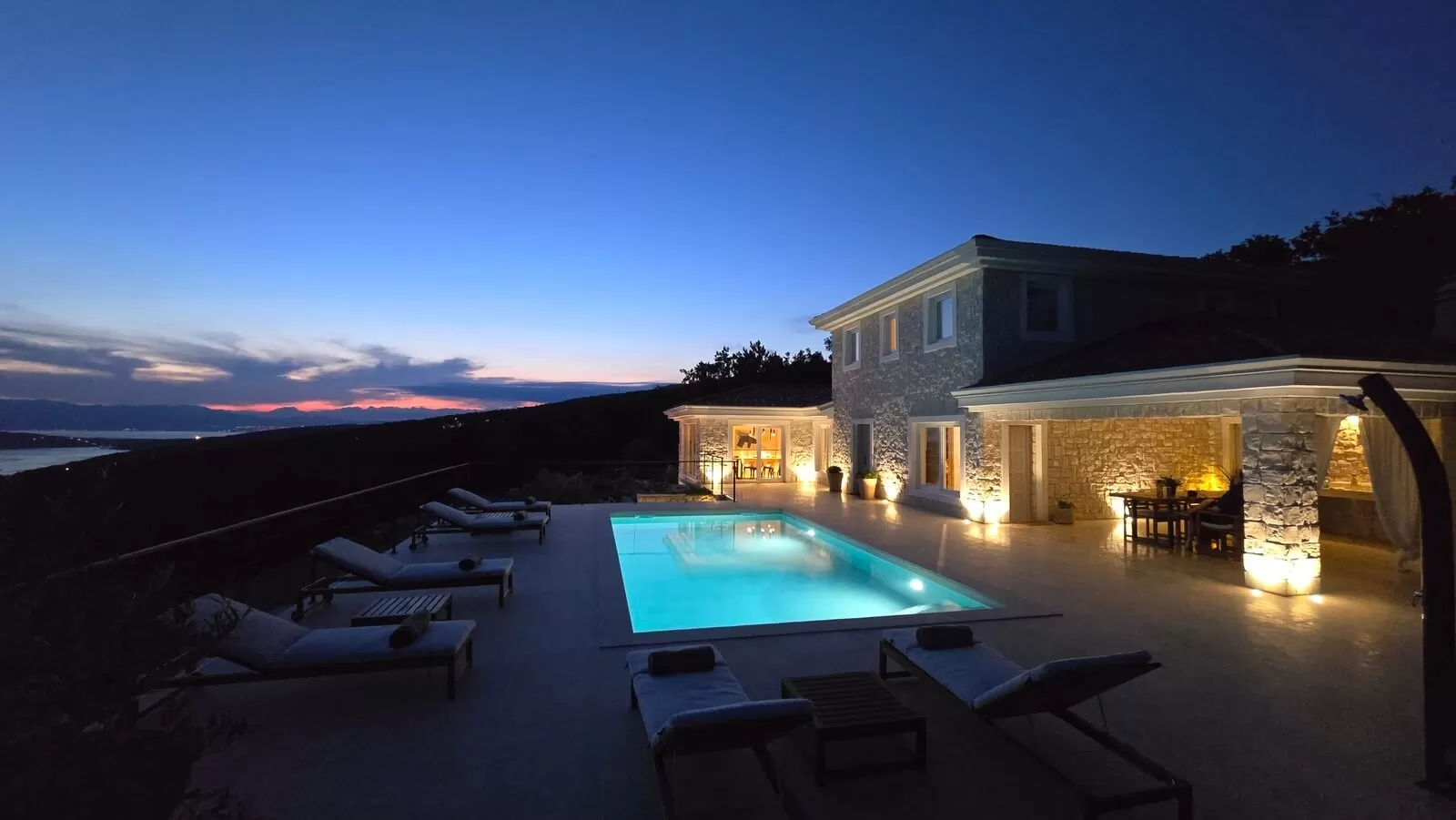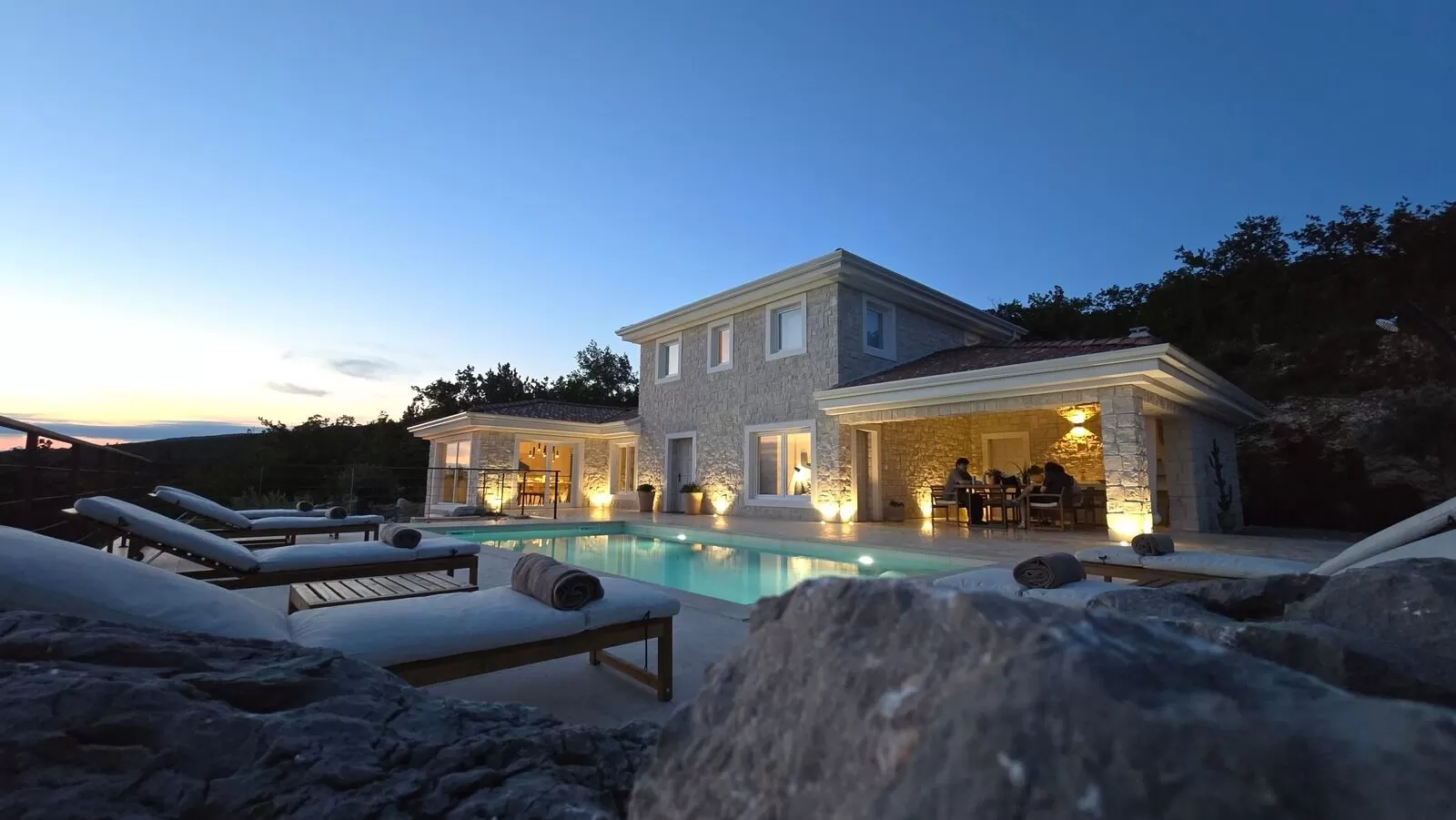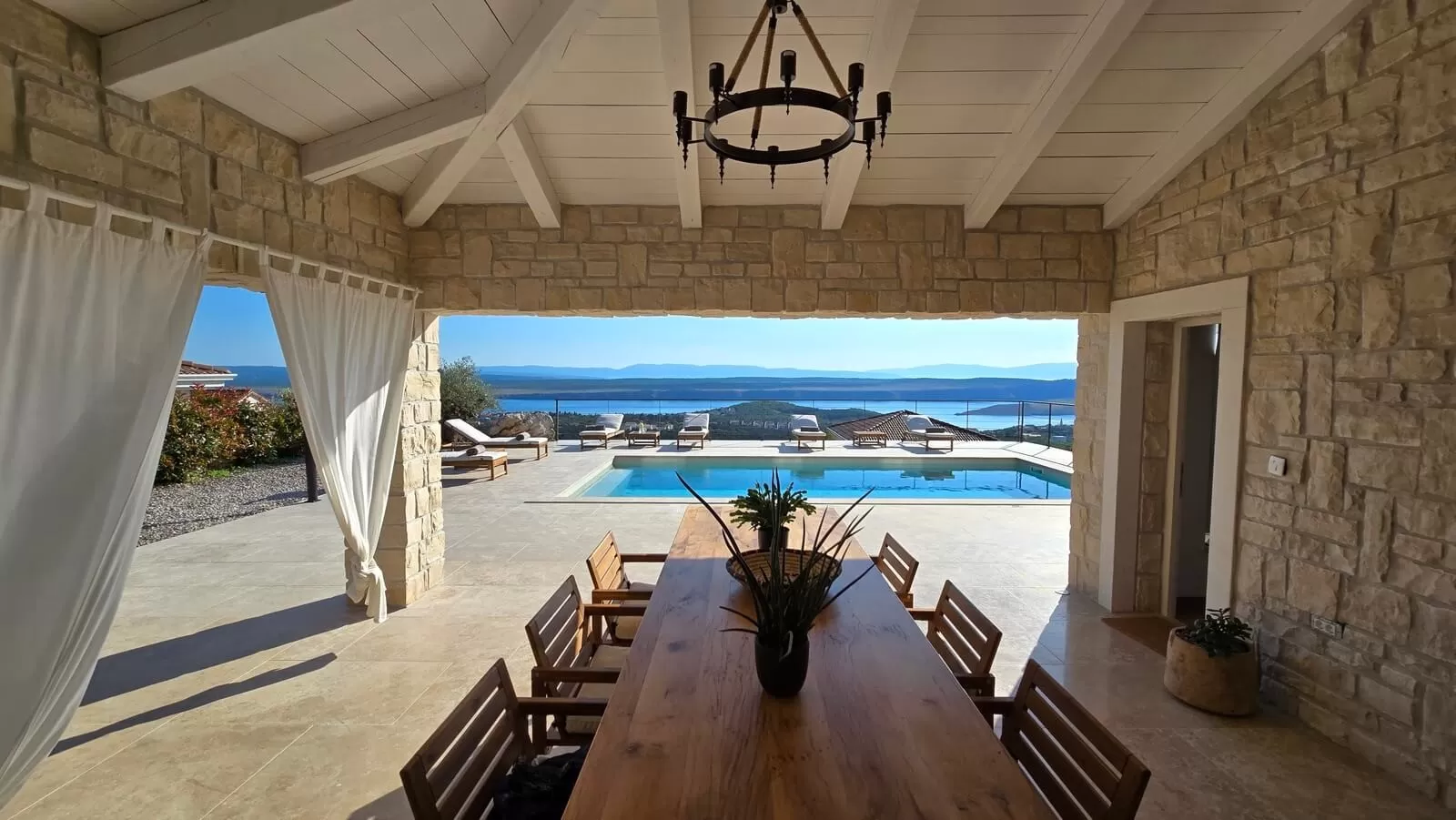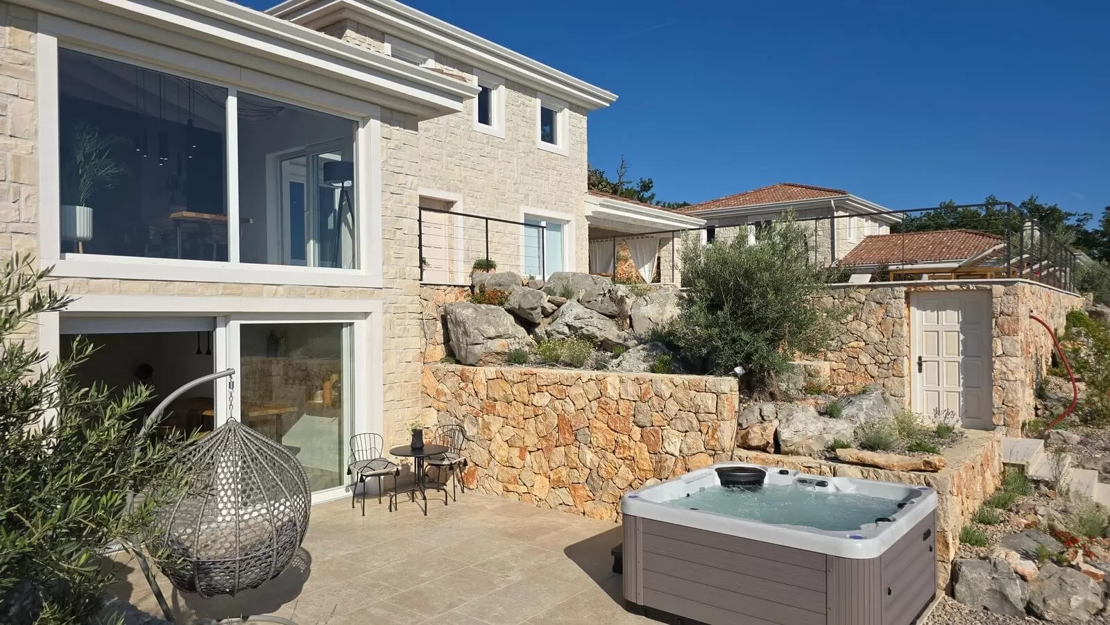 Der Außenbereich ist ein Paradies der Entspannung. Die großzügige Terrasse aus hellem Stein öffnet sich zum Kvarner, mit einem atemberaubenden Blick über das Meer bis zum Horizont. Der elegante Pool glitzert im Sonnenlicht und lädt zu erfrischenden Momenten ein, umgeben von bequemen Holzliegen und mediterranen Pflanzen. Die überdachte Außenterrasse mit Esstisch ist ideal für gemütliche Mahlzeiten im Freien – ob beim Frühstück in der Morgensonne oder beim Abendessen unter dem Sternenhimmel. Ein Whirlpool im Freien sorgt für zusätzlichen Luxus, während das harmonische Zusammenspiel von Stein, Holz und Grün eine natürliche Eleganz ausstrahlt. Das vollständig umzäunte Grundstück bietet maximale Privatsphäre sowie Parkplätze für drei Fahrzeuge. Wenn die Sonne über dem Meer untergeht, verwandeln warme Goldtöne die Umgebung in ein unvergessliches Schauspiel.