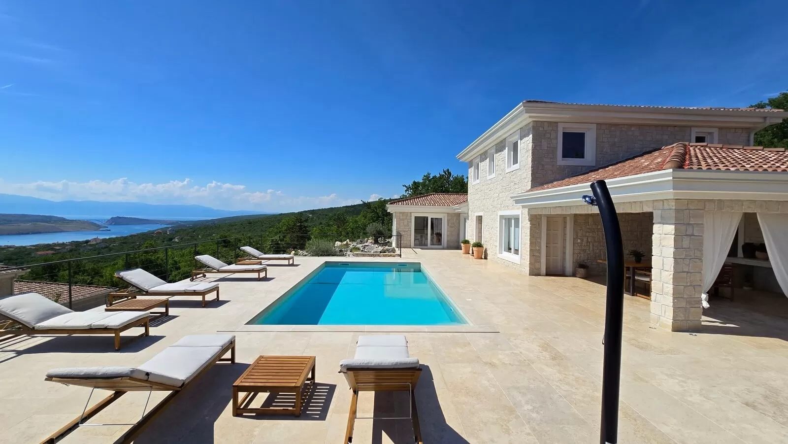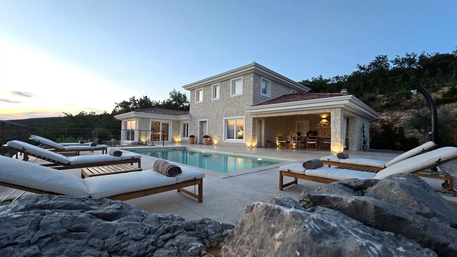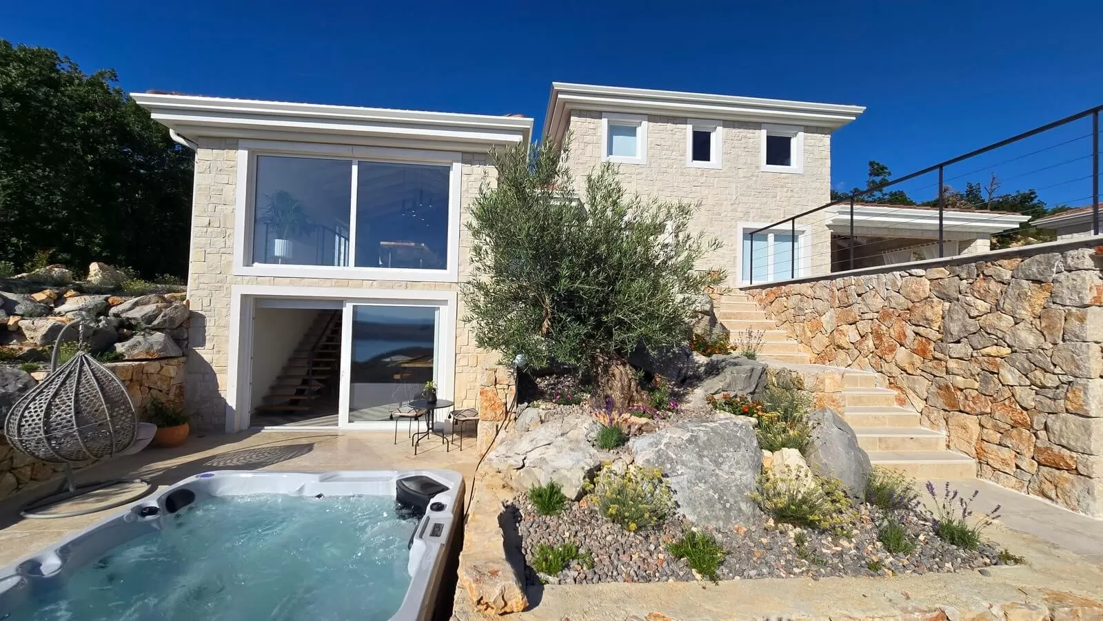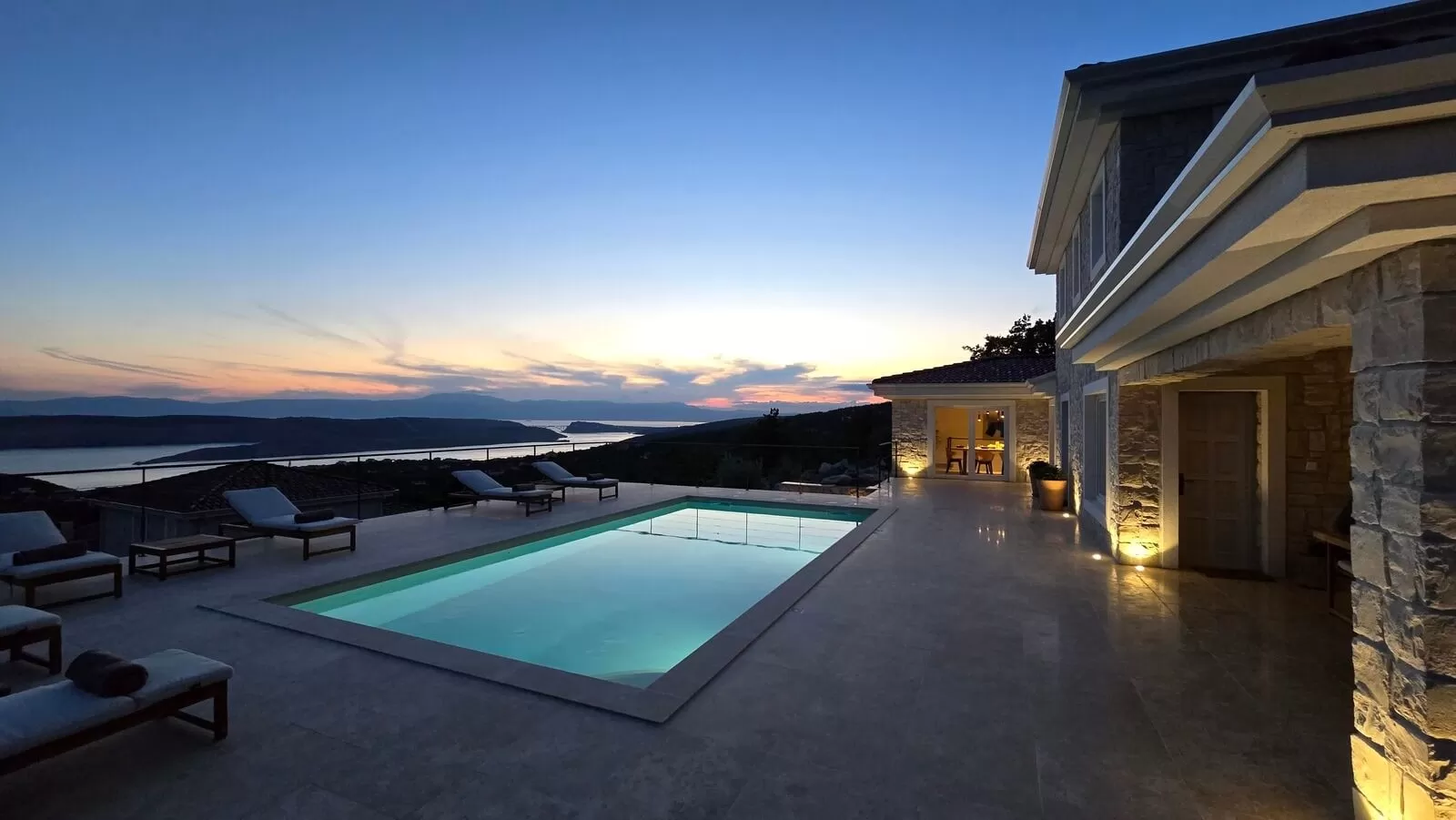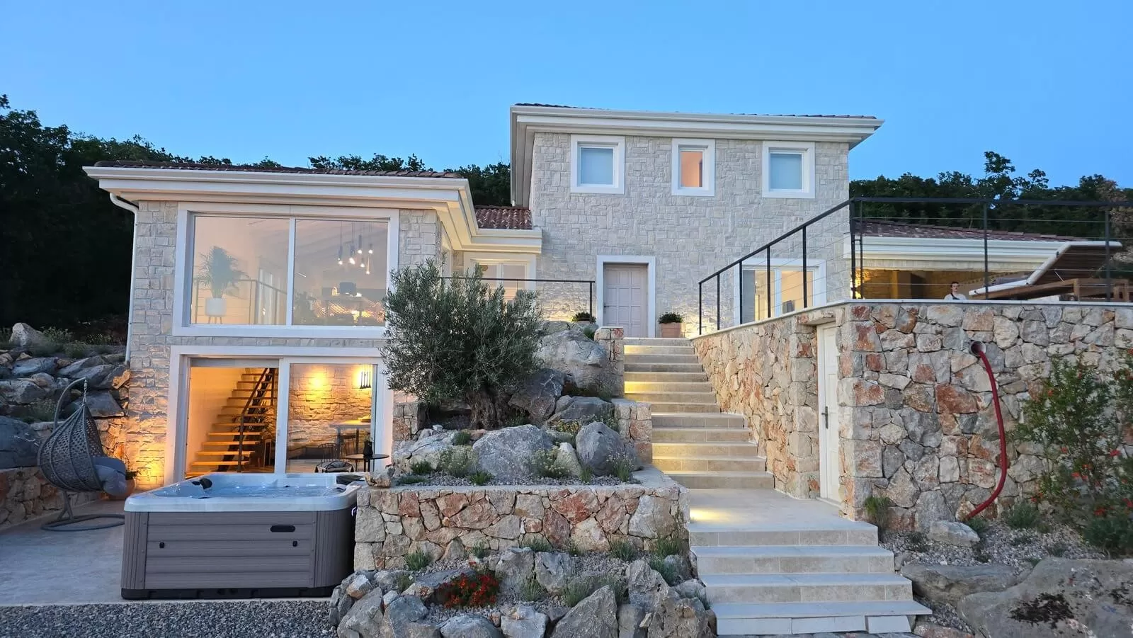 Der Außenbereich ist ein Paradies der Entspannung. Die großzügige Terrasse aus hellem Stein öffnet sich zum Kvarner, mit einem atemberaubenden Blick über das Meer bis zum Horizont. Der elegante Pool glitzert im Sonnenlicht und lädt zu erfrischenden Momenten ein, umgeben von bequemen Holzliegen und mediterranen Pflanzen. Die überdachte Außenterrasse mit Esstisch ist ideal für gemütliche Mahlzeiten im Freien – ob beim Frühstück in der Morgensonne oder beim Abendessen unter dem Sternenhimmel. Ein Whirlpool im Freien sorgt für zusätzlichen Luxus, während das harmonische Zusammenspiel von Stein, Holz und Grün eine natürliche Eleganz ausstrahlt. Das vollständig umzäunte Grundstück bietet maximale Privatsphäre sowie Parkplätze für drei Fahrzeuge. Wenn die Sonne über dem Meer untergeht, verwandeln warme Goldtöne die Umgebung in ein unvergessliches Schauspiel.