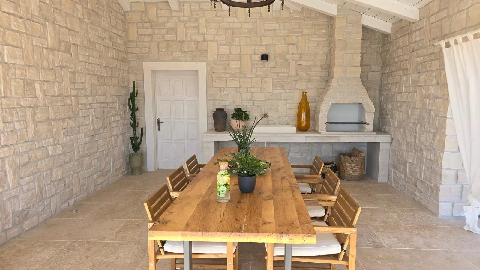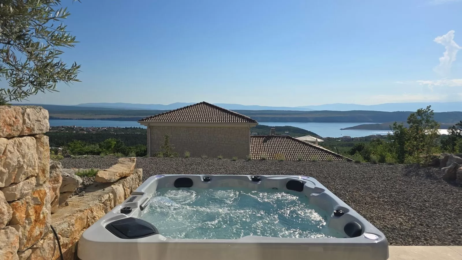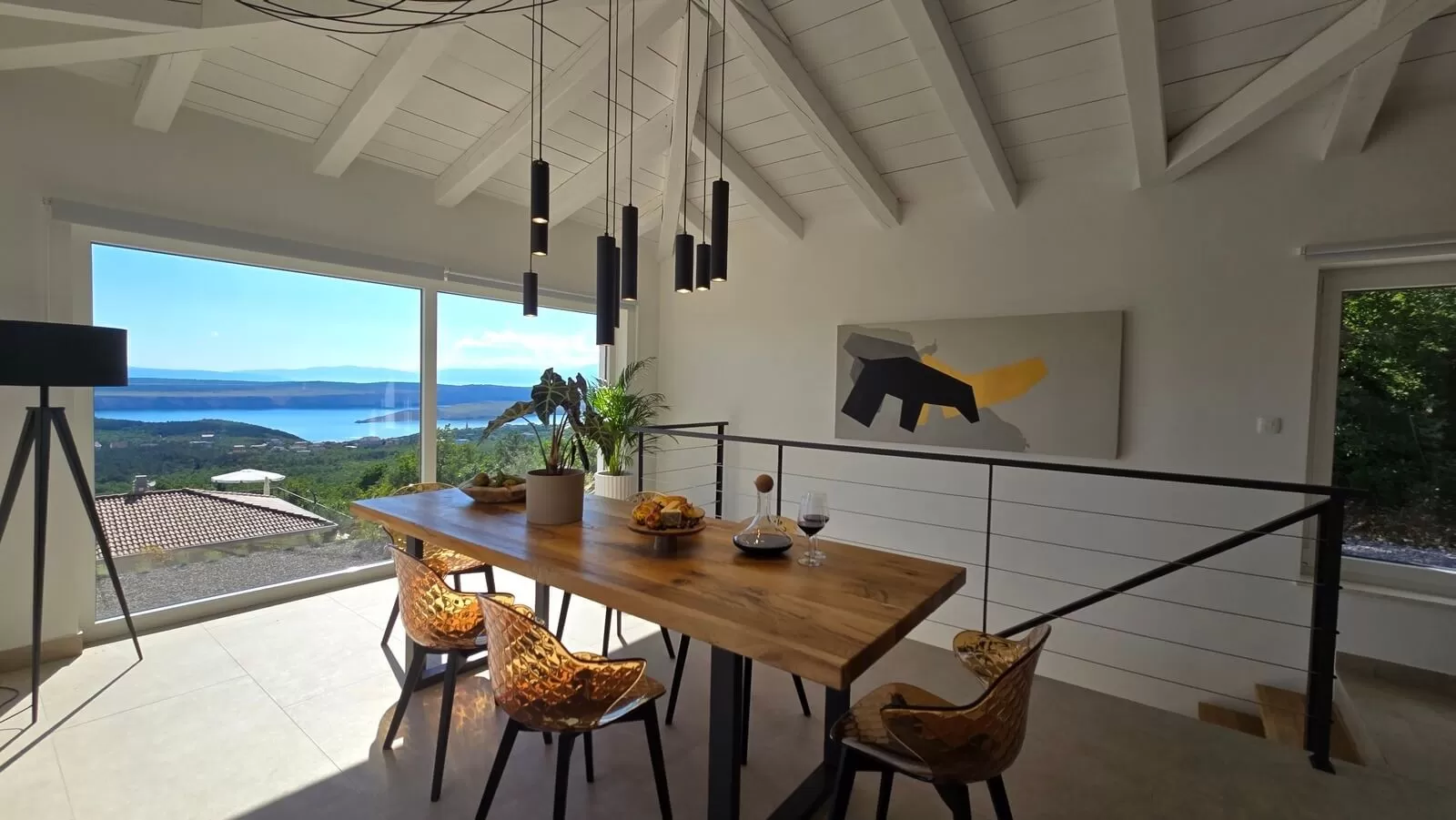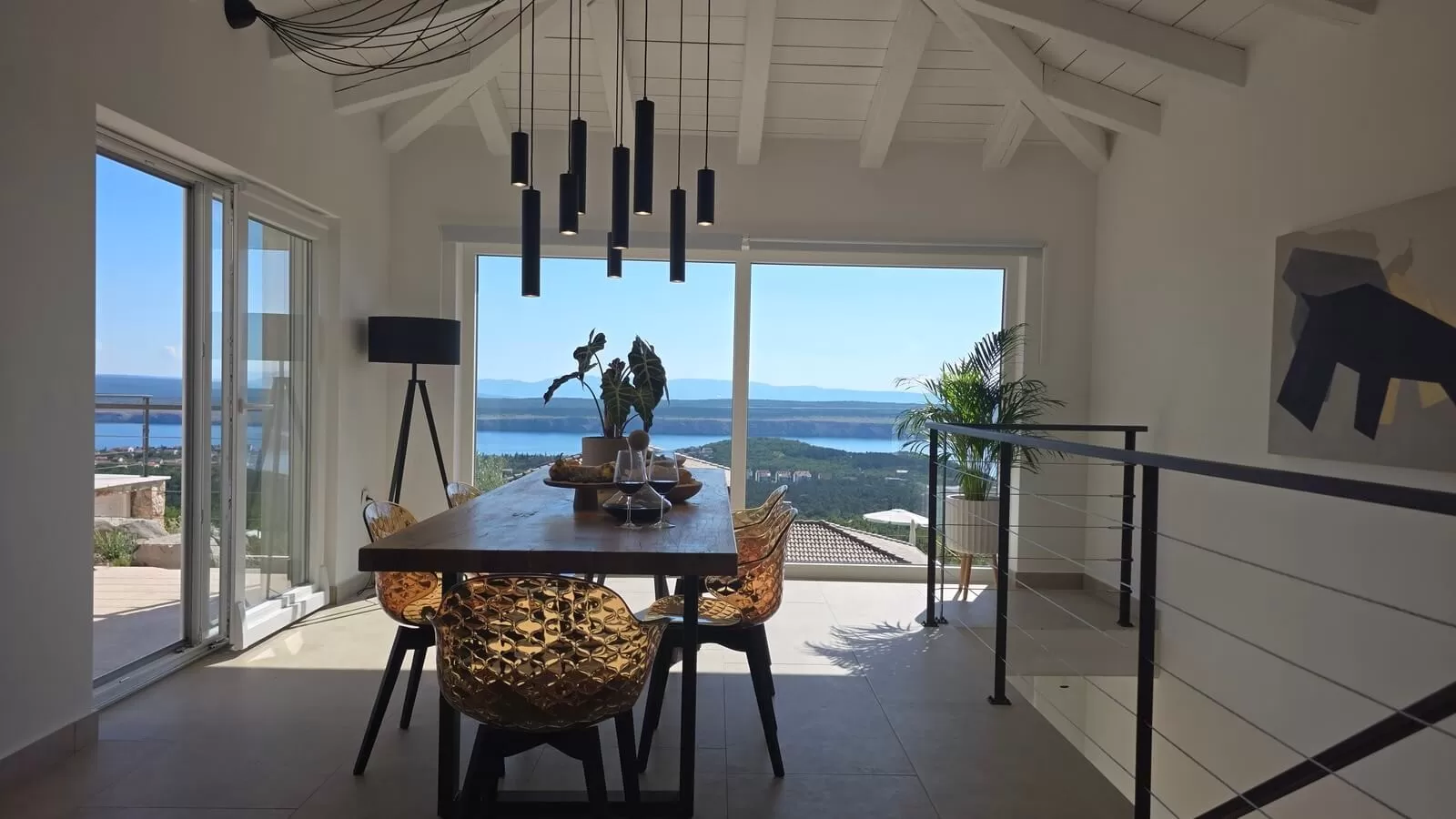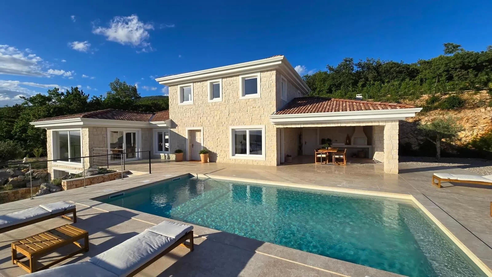 Der Außenbereich ist ein Paradies der Entspannung. Die großzügige Terrasse aus hellem Stein öffnet sich zum Kvarner, mit einem atemberaubenden Blick über das Meer bis zum Horizont. Der elegante Pool glitzert im Sonnenlicht und lädt zu erfrischenden Momenten ein, umgeben von bequemen Holzliegen und mediterranen Pflanzen. Die überdachte Außenterrasse mit Esstisch ist ideal für gemütliche Mahlzeiten im Freien – ob beim Frühstück in der Morgensonne oder beim Abendessen unter dem Sternenhimmel. Ein Whirlpool im Freien sorgt für zusätzlichen Luxus, während das harmonische Zusammenspiel von Stein, Holz und Grün eine natürliche Eleganz ausstrahlt. Das vollständig umzäunte Grundstück bietet maximale Privatsphäre sowie Parkplätze für drei Fahrzeuge. Wenn die Sonne über dem Meer untergeht, verwandeln warme Goldtöne die Umgebung in ein unvergessliches Schauspiel.