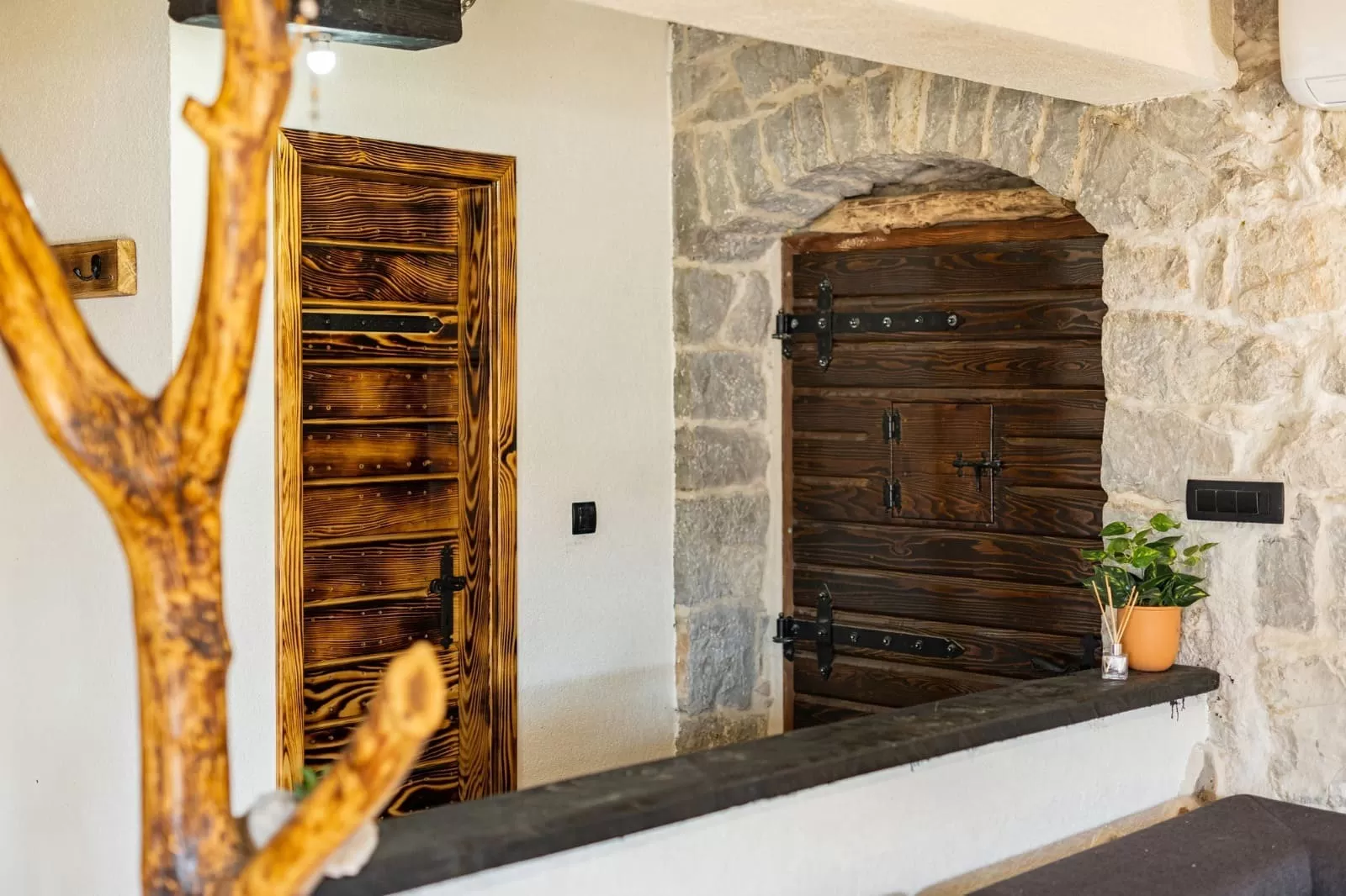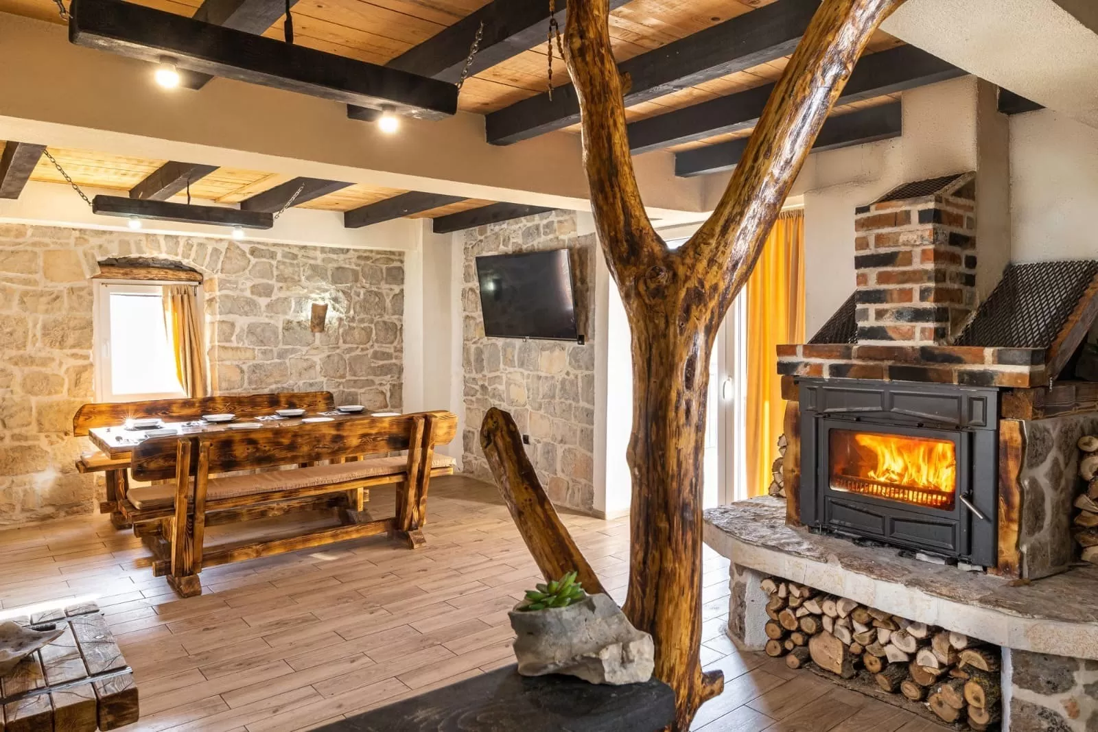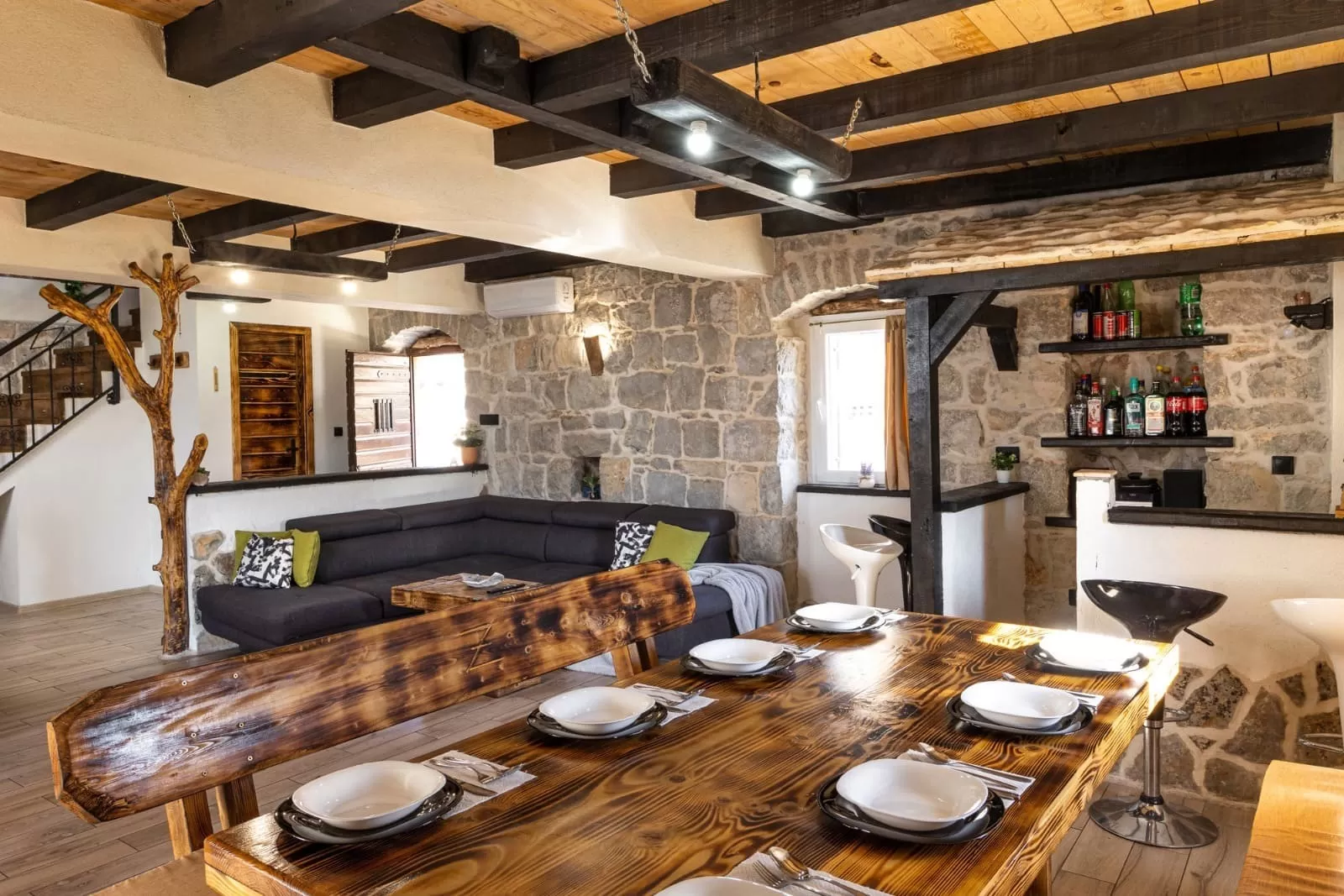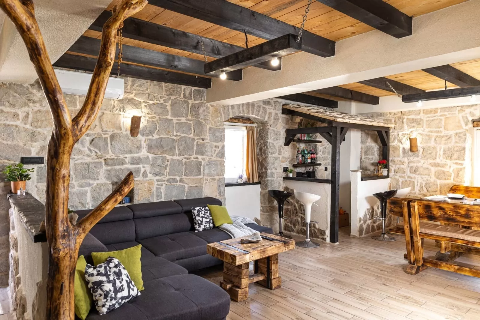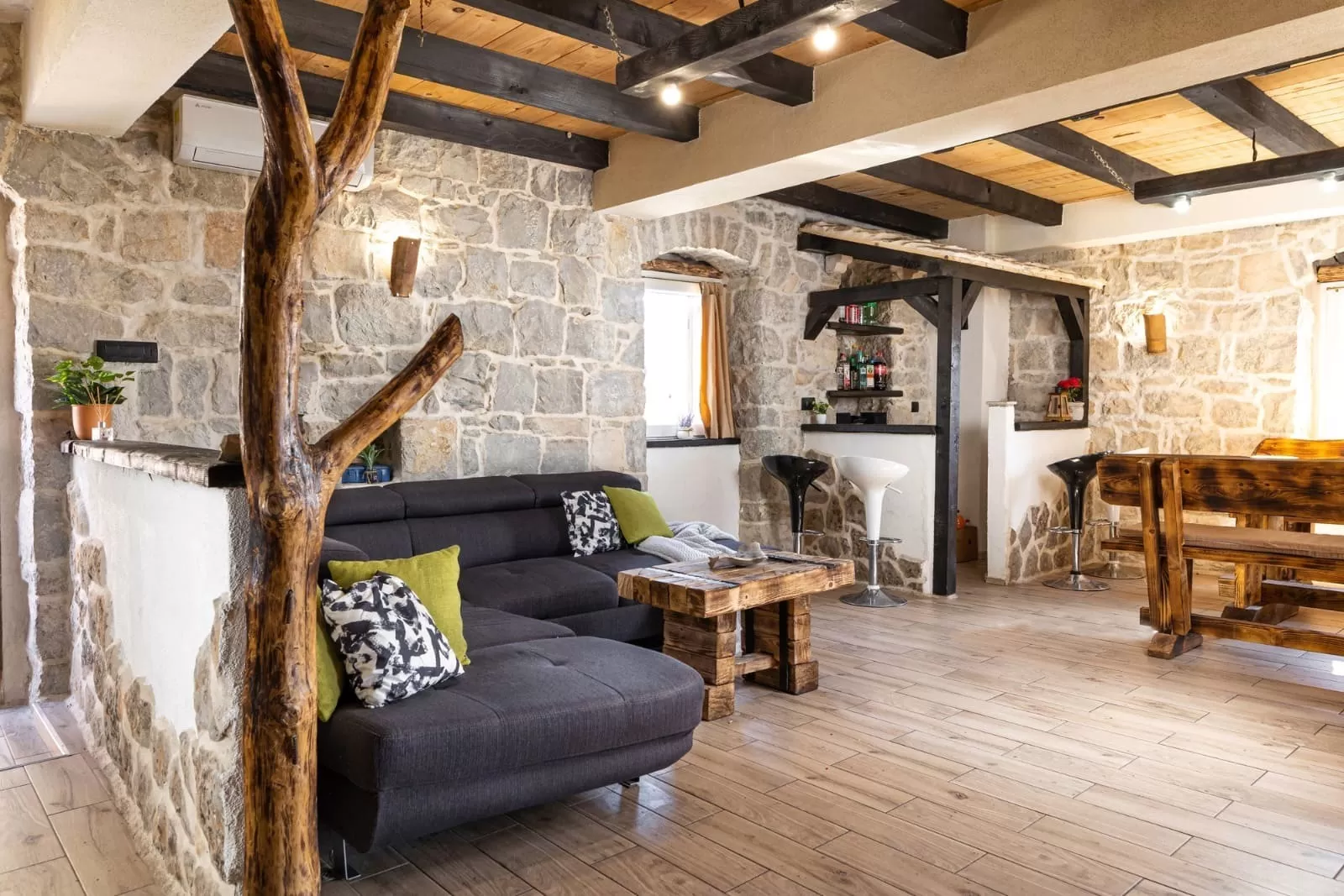 Das Innere der Villa strahlt Wärme, Charakter und eine besondere Kombination aus rustikalem Charme und modernen Details aus. Stein und Holz dominieren den Raum und schaffen eine authentische dalmatinische Atmosphäre mit einem hohen Maß an Komfort. Das geräumige Wohnzimmer ist mit einer modernen Eckcouch, einem Holztisch und einem Kamin ausgestattet – perfekt zum Entspannen an kühleren Abenden. Einzigartige Elemente wie der integrierte Baum und freiliegende Holzbalken verleihen dem Raum eine natürliche Eleganz. Die handgefertigte Küche aus rustikalem Holz und Ziegeln ist ideal zum Kochen in gemütlicher, heimeliger Atmosphäre. Die Schlafzimmer sind schlicht und stilvoll eingerichtet, und ein besonderes Highlight ist die romantische Badewanne im Hauptschlafzimmer – ideal für entspannte Stunden bei Kerzenschein und einem Glas Wein. Jeder Winkel der Villa wurde mit Liebe zum Detail gestaltet, um ein Gefühl von Komfort, Privatsphäre und Luxus zu vermitteln. Das Interieur ist ideal für alle, die einen authentischen Urlaub in Kroatien mit einem Hauch von Eleganz und Natur erleben möchten.