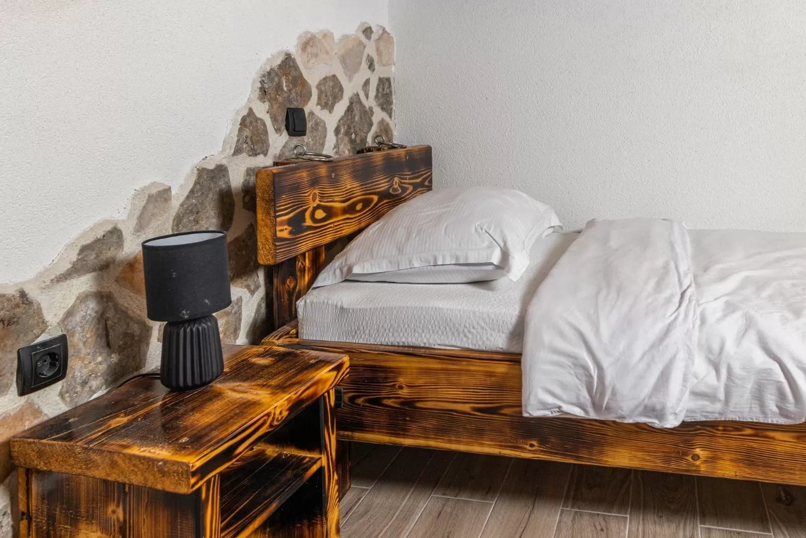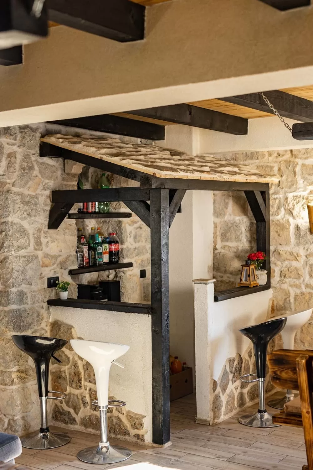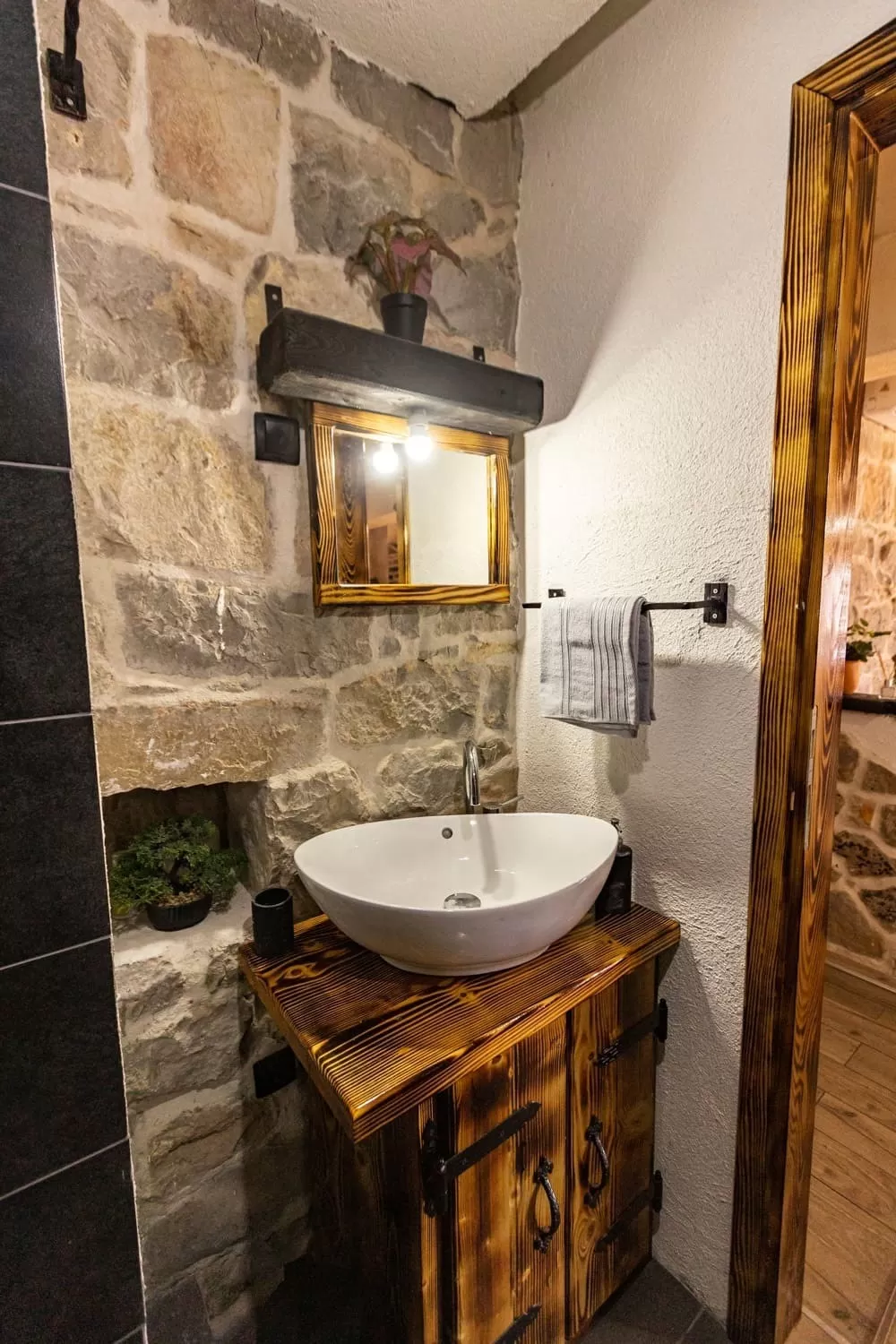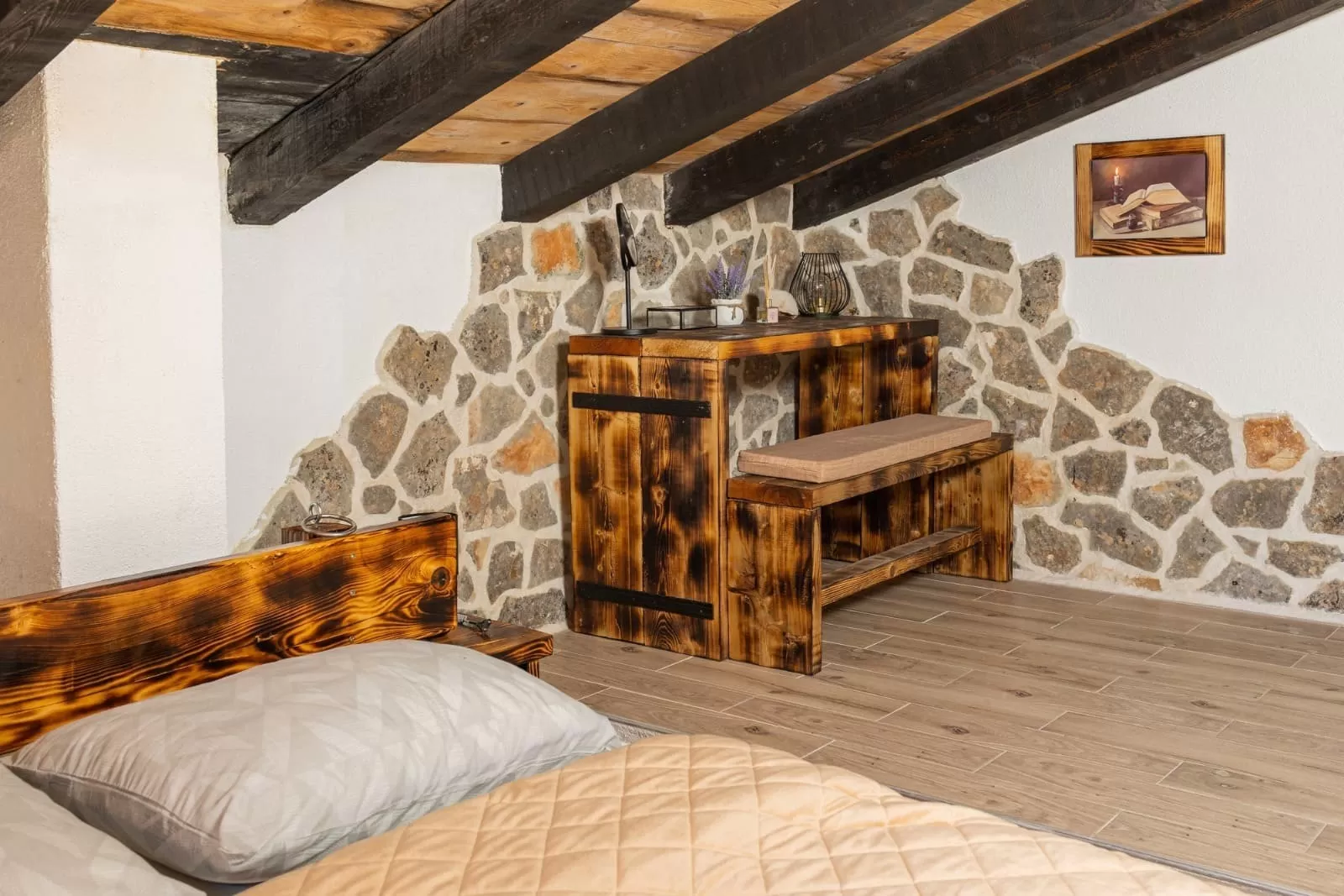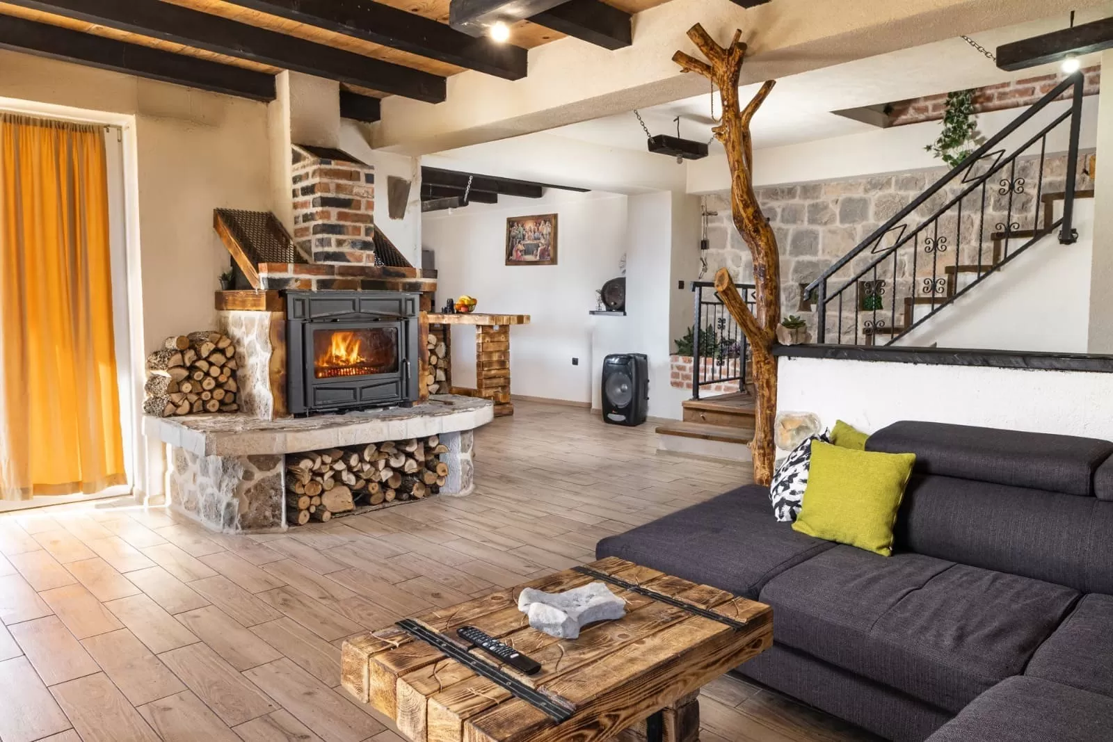 Das Innere der Villa strahlt Wärme, Charakter und eine besondere Kombination aus rustikalem Charme und modernen Details aus. Stein und Holz dominieren den Raum und schaffen eine authentische dalmatinische Atmosphäre mit einem hohen Maß an Komfort. Das geräumige Wohnzimmer ist mit einer modernen Eckcouch, einem Holztisch und einem Kamin ausgestattet – perfekt zum Entspannen an kühleren Abenden. Einzigartige Elemente wie der integrierte Baum und freiliegende Holzbalken verleihen dem Raum eine natürliche Eleganz. Die handgefertigte Küche aus rustikalem Holz und Ziegeln ist ideal zum Kochen in gemütlicher, heimeliger Atmosphäre. Die Schlafzimmer sind schlicht und stilvoll eingerichtet, und ein besonderes Highlight ist die romantische Badewanne im Hauptschlafzimmer – ideal für entspannte Stunden bei Kerzenschein und einem Glas Wein. Jeder Winkel der Villa wurde mit Liebe zum Detail gestaltet, um ein Gefühl von Komfort, Privatsphäre und Luxus zu vermitteln. Das Interieur ist ideal für alle, die einen authentischen Urlaub in Kroatien mit einem Hauch von Eleganz und Natur erleben möchten.