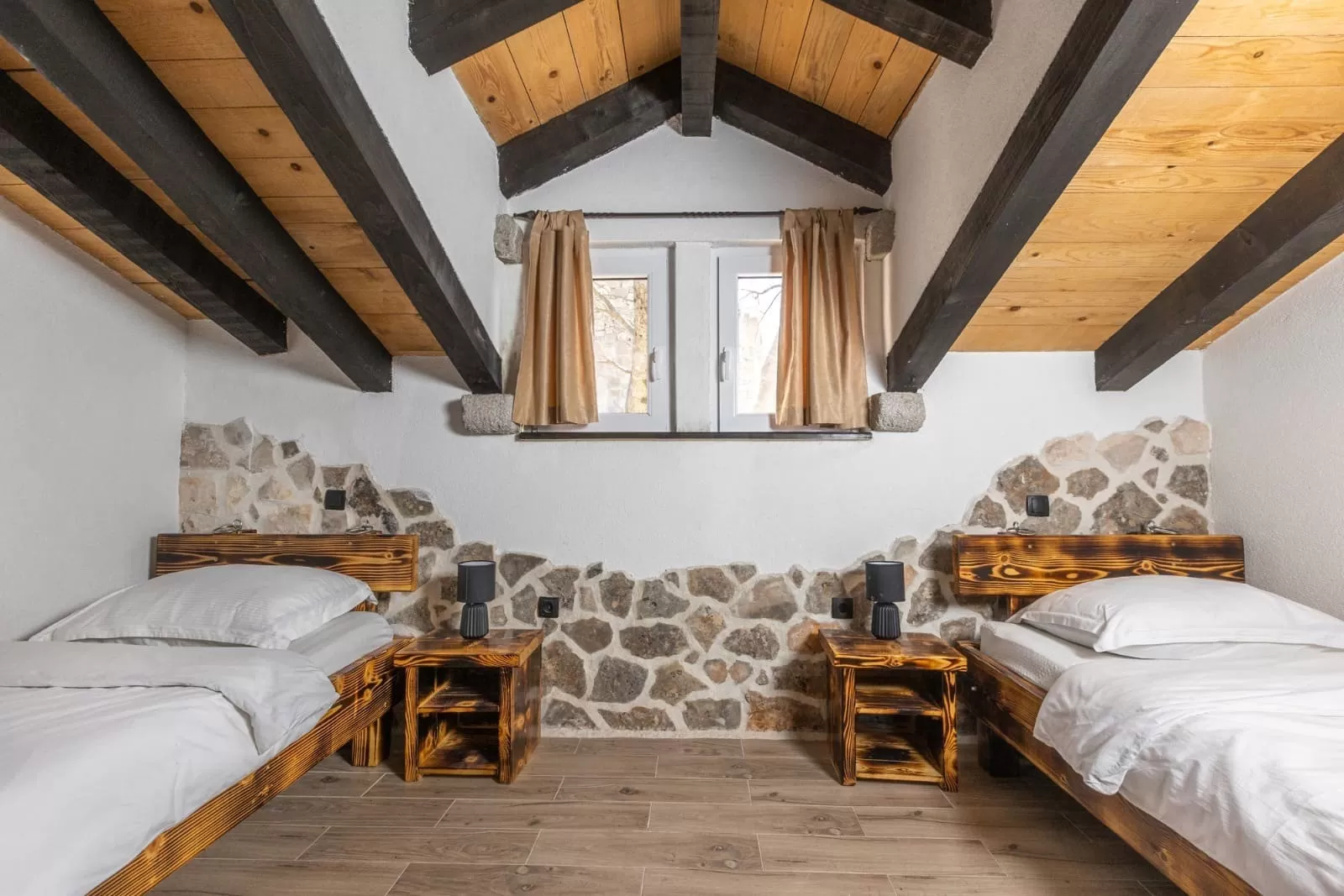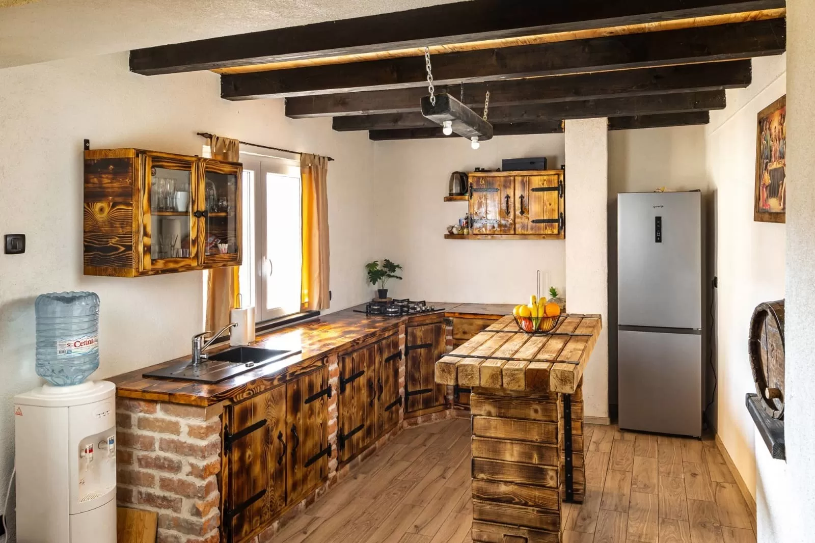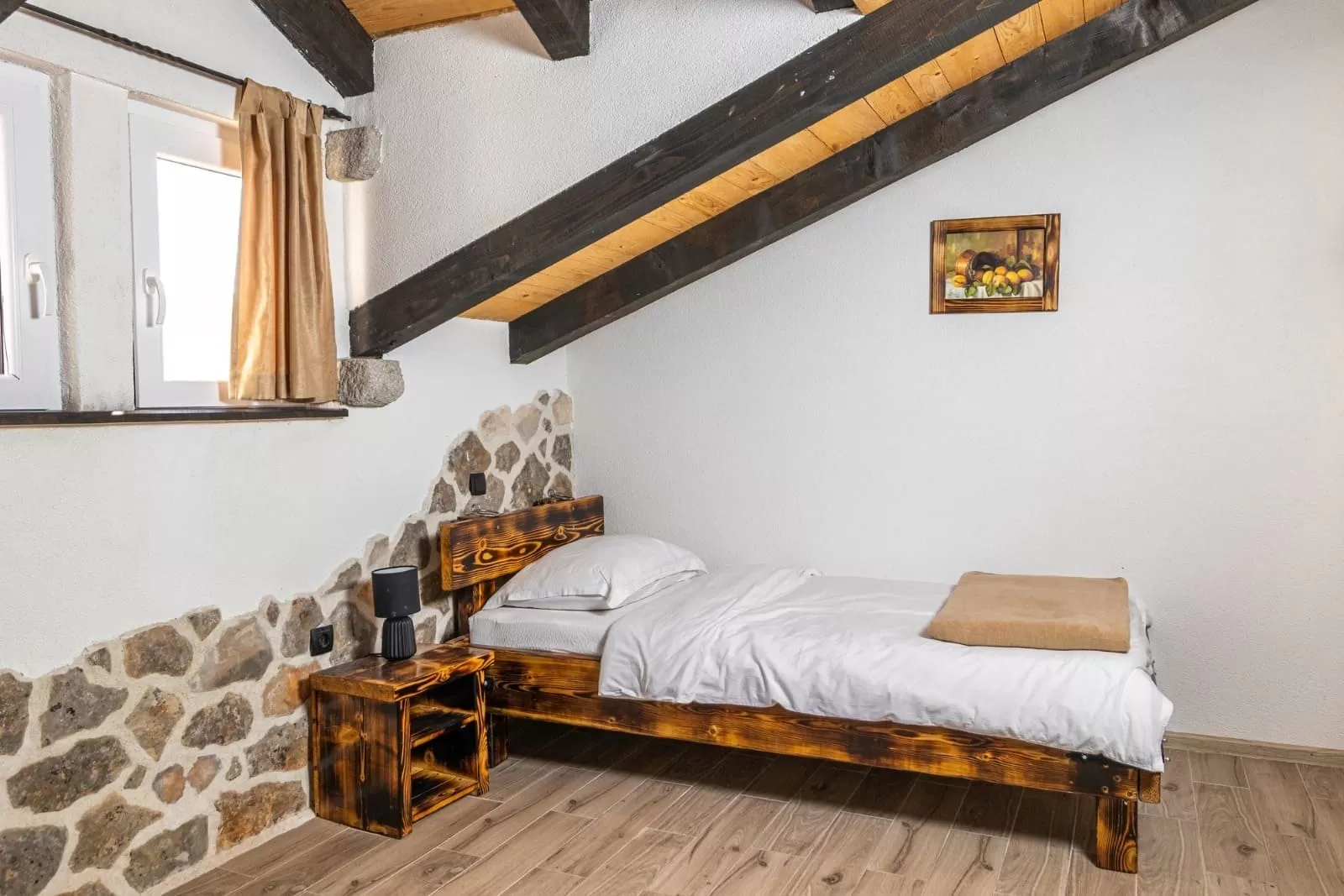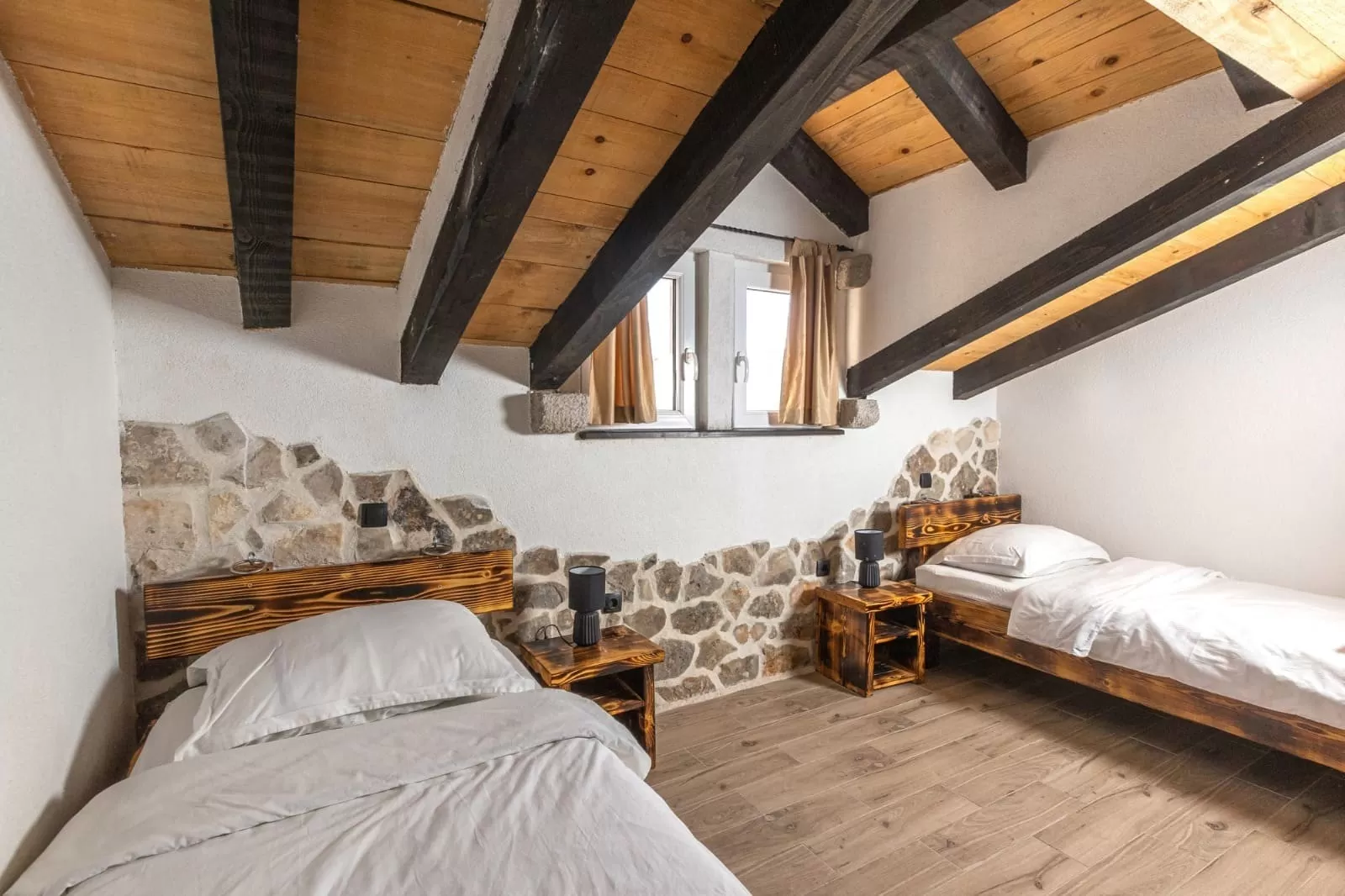 Das Innere der Villa strahlt Wärme, Charakter und eine besondere Kombination aus rustikalem Charme und modernen Details aus. Stein und Holz dominieren den Raum und schaffen eine authentische dalmatinische Atmosphäre mit einem hohen Maß an Komfort. Das geräumige Wohnzimmer ist mit einer modernen Eckcouch, einem Holztisch und einem Kamin ausgestattet – perfekt zum Entspannen an kühleren Abenden. Einzigartige Elemente wie der integrierte Baum und freiliegende Holzbalken verleihen dem Raum eine natürliche Eleganz. Die handgefertigte Küche aus rustikalem Holz und Ziegeln ist ideal zum Kochen in gemütlicher, heimeliger Atmosphäre. Die Schlafzimmer sind schlicht und stilvoll eingerichtet, und ein besonderes Highlight ist die romantische Badewanne im Hauptschlafzimmer – ideal für entspannte Stunden bei Kerzenschein und einem Glas Wein. Jeder Winkel der Villa wurde mit Liebe zum Detail gestaltet, um ein Gefühl von Komfort, Privatsphäre und Luxus zu vermitteln. Das Interieur ist ideal für alle, die einen authentischen Urlaub in Kroatien mit einem Hauch von Eleganz und Natur erleben möchten.