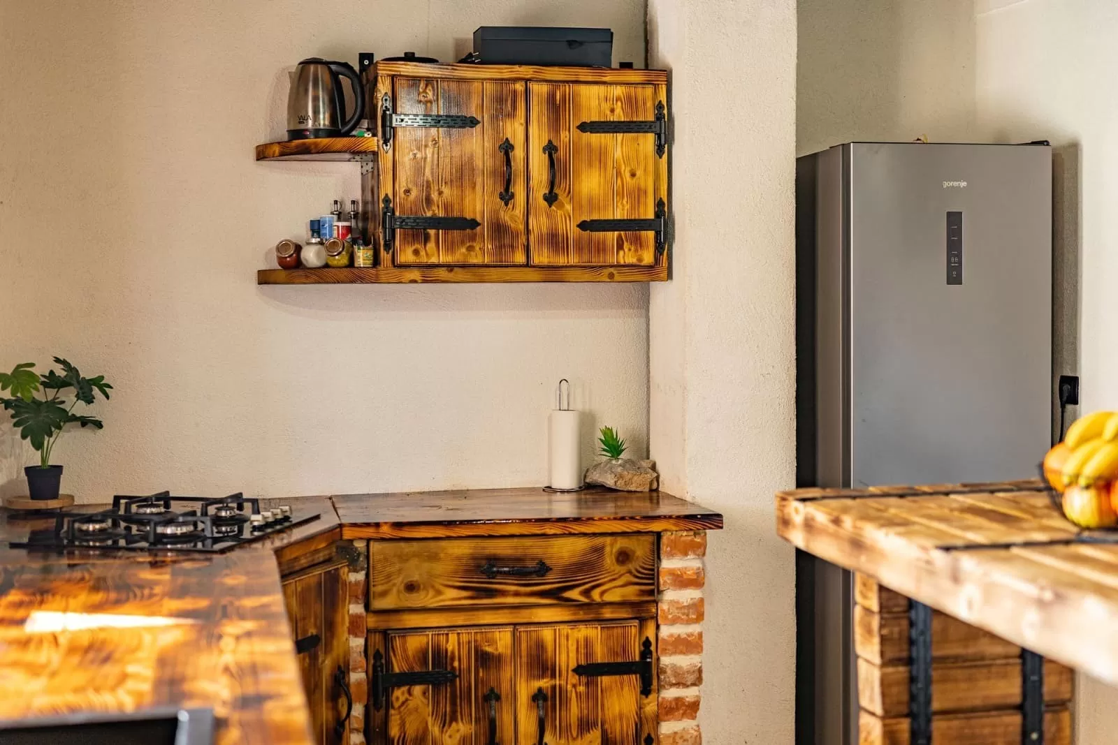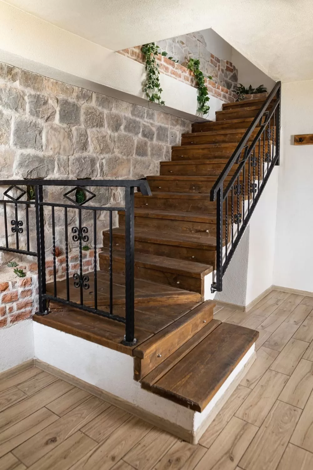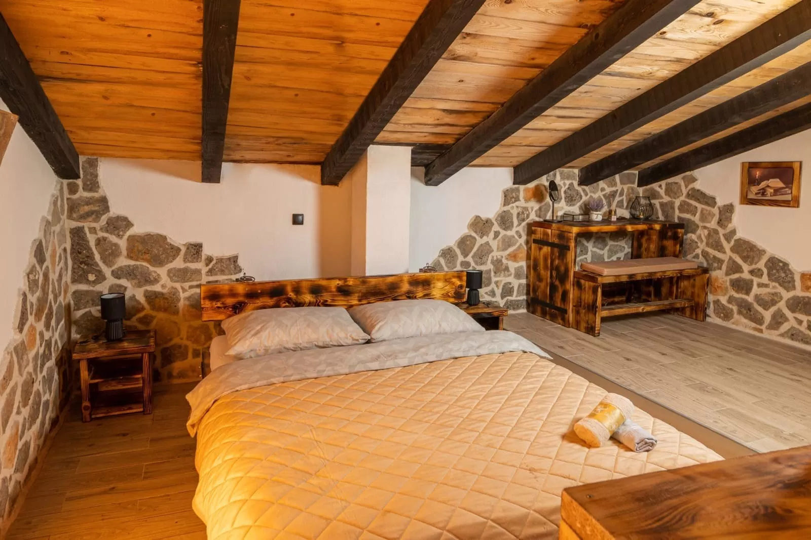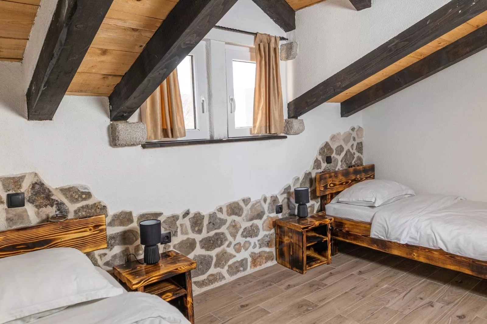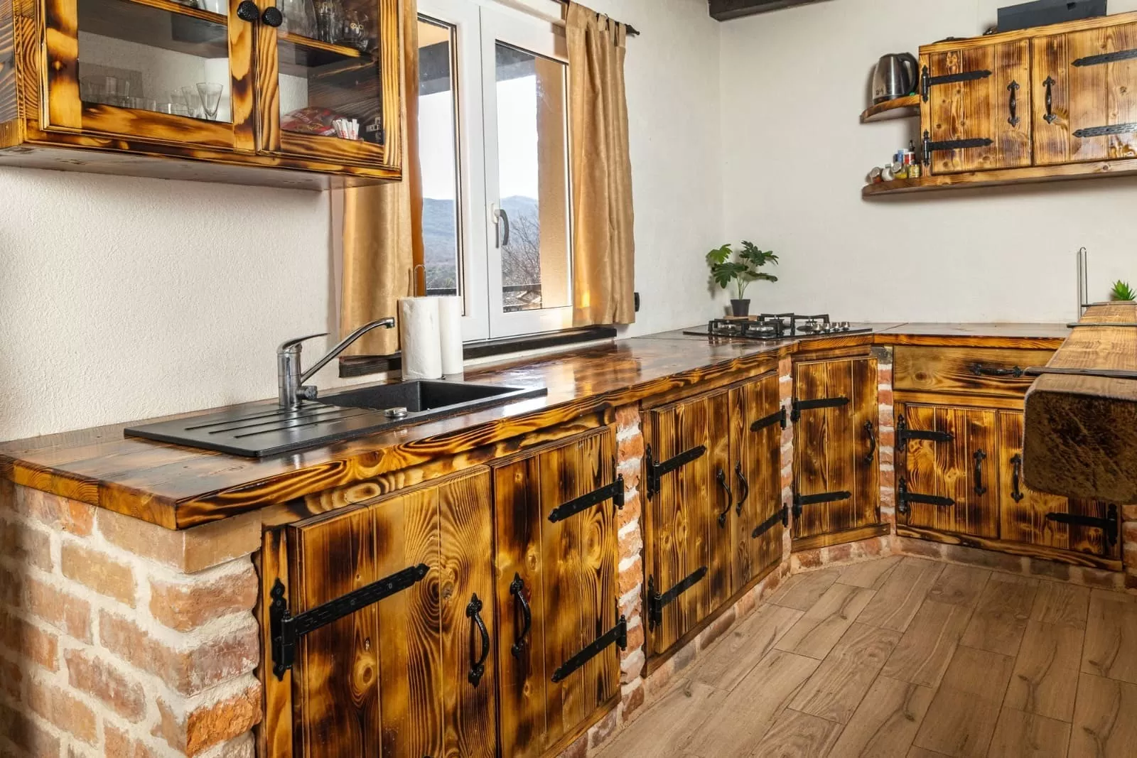 Das Innere der Villa strahlt Wärme, Charakter und eine besondere Kombination aus rustikalem Charme und modernen Details aus. Stein und Holz dominieren den Raum und schaffen eine authentische dalmatinische Atmosphäre mit einem hohen Maß an Komfort. Das geräumige Wohnzimmer ist mit einer modernen Eckcouch, einem Holztisch und einem Kamin ausgestattet – perfekt zum Entspannen an kühleren Abenden. Einzigartige Elemente wie der integrierte Baum und freiliegende Holzbalken verleihen dem Raum eine natürliche Eleganz. Die handgefertigte Küche aus rustikalem Holz und Ziegeln ist ideal zum Kochen in gemütlicher, heimeliger Atmosphäre. Die Schlafzimmer sind schlicht und stilvoll eingerichtet, und ein besonderes Highlight ist die romantische Badewanne im Hauptschlafzimmer – ideal für entspannte Stunden bei Kerzenschein und einem Glas Wein. Jeder Winkel der Villa wurde mit Liebe zum Detail gestaltet, um ein Gefühl von Komfort, Privatsphäre und Luxus zu vermitteln. Das Interieur ist ideal für alle, die einen authentischen Urlaub in Kroatien mit einem Hauch von Eleganz und Natur erleben möchten.