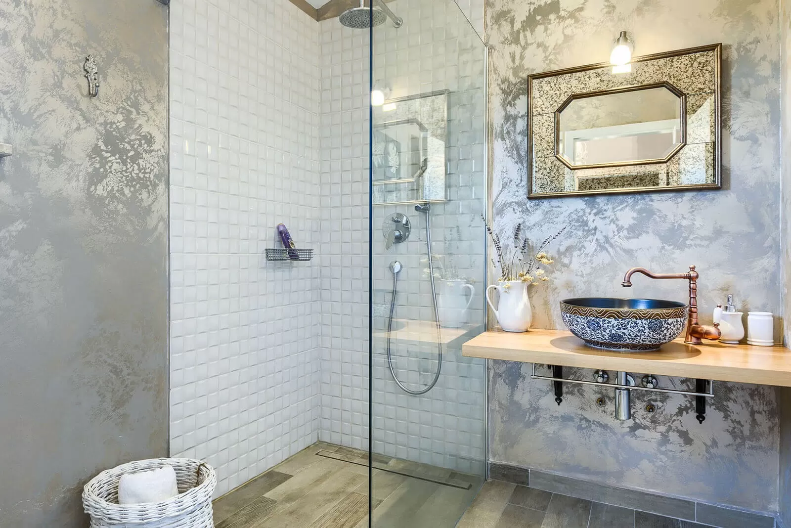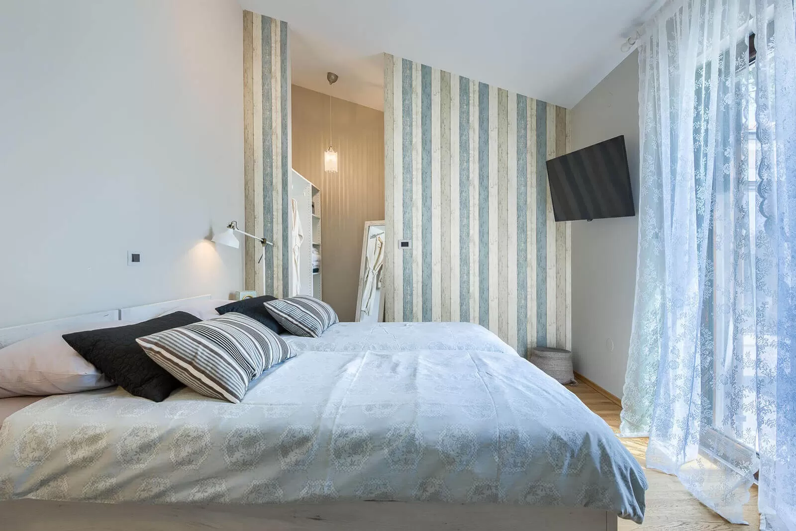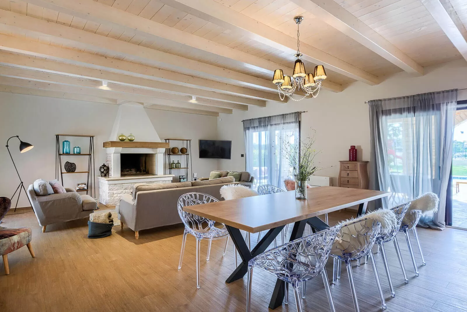 Im Inneren dominieren Wärme und Raffinesse: Moderne Linien verschmelzen mit natürlichen Materialien und schaffen eine harmonische und einladende Atmosphäre. Das helle, großzügige Wohnzimmer verbindet sich durch Glasfronten mit dem Außenbereich und betont das Gefühl von Offenheit und Nähe zur Natur. Die elegante Küche ist mit hochwertigen Geräten und großzügigen Arbeitsflächen ausgestattet – perfekt, um gemeinsam mit Familie oder Freunden Mahlzeiten zuzubereiten. Großzügige Essbereiche bieten einen einladenden Rahmen für gemeinsame Momente und kulinarische Genüsse. Jedes Schlafzimmer ist als privates Refugium konzipiert, mit komfortablen King- oder Queen-Size-Betten, eigenem Bad, Klimaanlage und TV, einige Zimmer verfügen zudem über einen Balkon mit Blick auf Garten und Umgebung. Für zusätzliche Entspannung stehen den Gästen eine Sauna und ein Indoor-Whirlpool zur Verfügung – ideal nach einem aktiven Tag. Die Einrichtung folgt einer modernen Ästhetik in neutralen Tönen mit subtilen Farbakzenten und Texturen, während hochwertige Materialien den Luxus und die Langlebigkeit der Villa unterstreichen. Die Raumaufteilung fördert Gemeinschaft, bietet jedoch auch genügend Privatsphäre für jeden Gast.