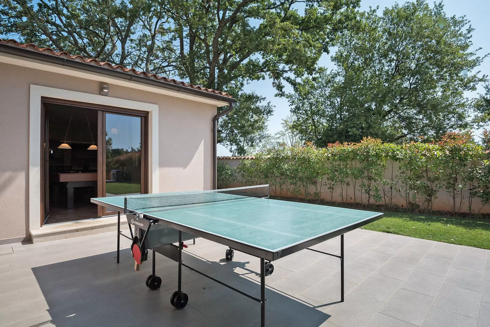 Draußen umgeben üppiges Grün und duftende mediterrane Pflanzen die Villa und schaffen eine natürliche Kulisse für Entspannung und geselliges Beisammensein. Der große Swimmingpool bietet an heißen Tagen eine perfekte Erfrischung, und dank der Heizfunktion ist Badevergnügen auch außerhalb der Sommersaison garantiert. Die großzügige Terrasse mit eleganten Liegestühlen lädt zum Sonnenbaden oder Entspannen im Schatten mit einem erfrischenden Getränk ein, während der Außen-Whirlpool zusätzliche Privatsphäre und Genuss bietet. Das vollständig eingezäunte Grundstück sorgt für Sicherheit und Ruhe, besonders für Familien mit Kindern. Ein privater Spielplatz für die Kleinsten, Fahrräder zur Erkundung der Umgebung sowie Plätze für Tennis, Badminton oder Tischtennis gestalten jeden Moment aktiv und abwechslungsreich. Gäste können zudem Billard spielen oder auf der PlayStation entspannen und gemütliche Abende mit Freunden verbringen. Die Gärten und Außenbereiche eignen sich ideal für Familienessen oder Dinner im Freien, während der private Parkplatz für vier Autos zusätzlichen Komfort bietet. Jeder Winkel des Außenbereichs vermittelt ein Gefühl von Ruhe, Freiheit und Luxus, das man selten an einem Ort findet.