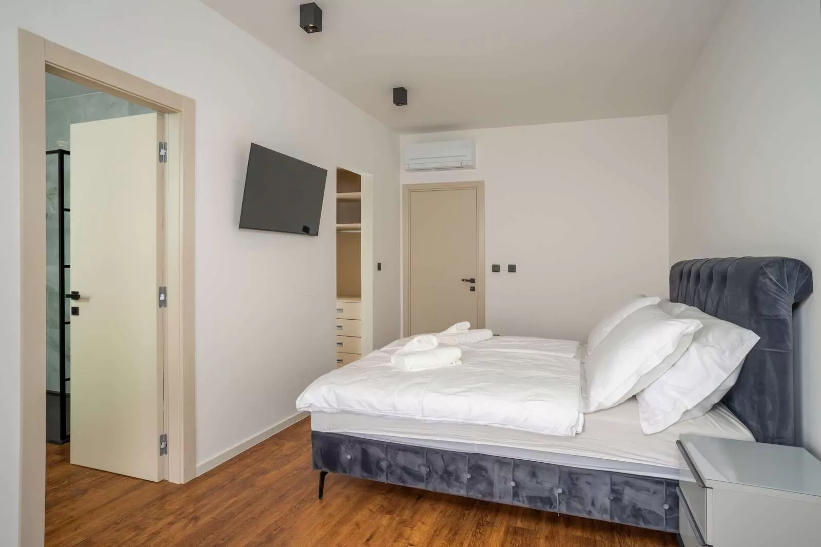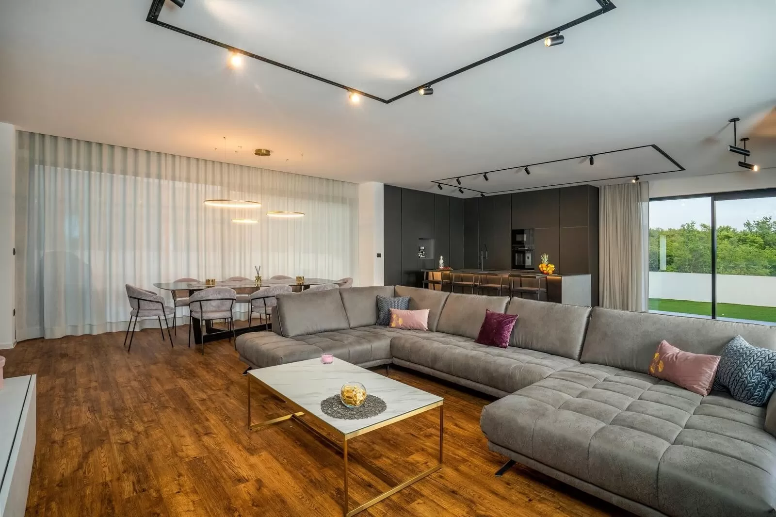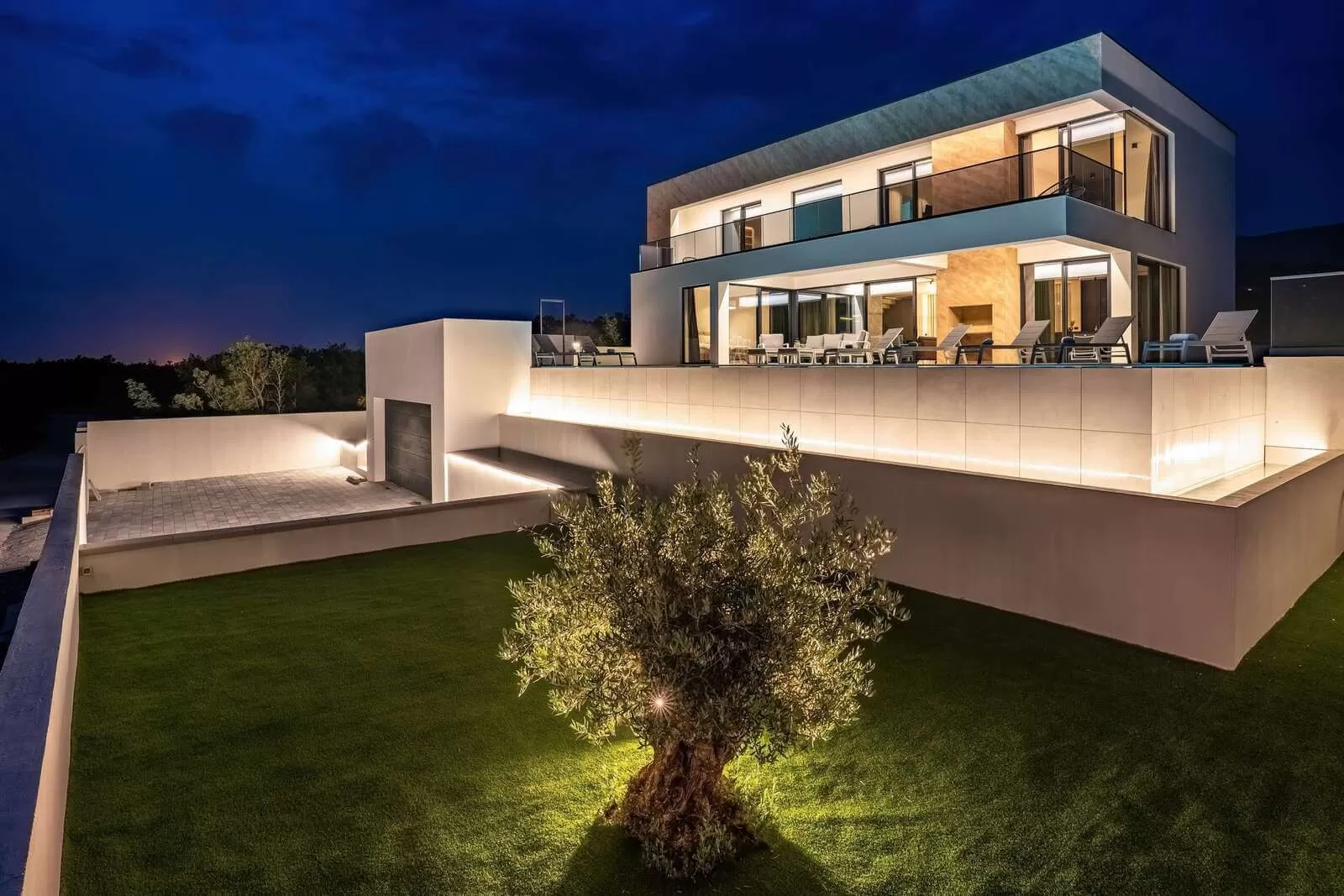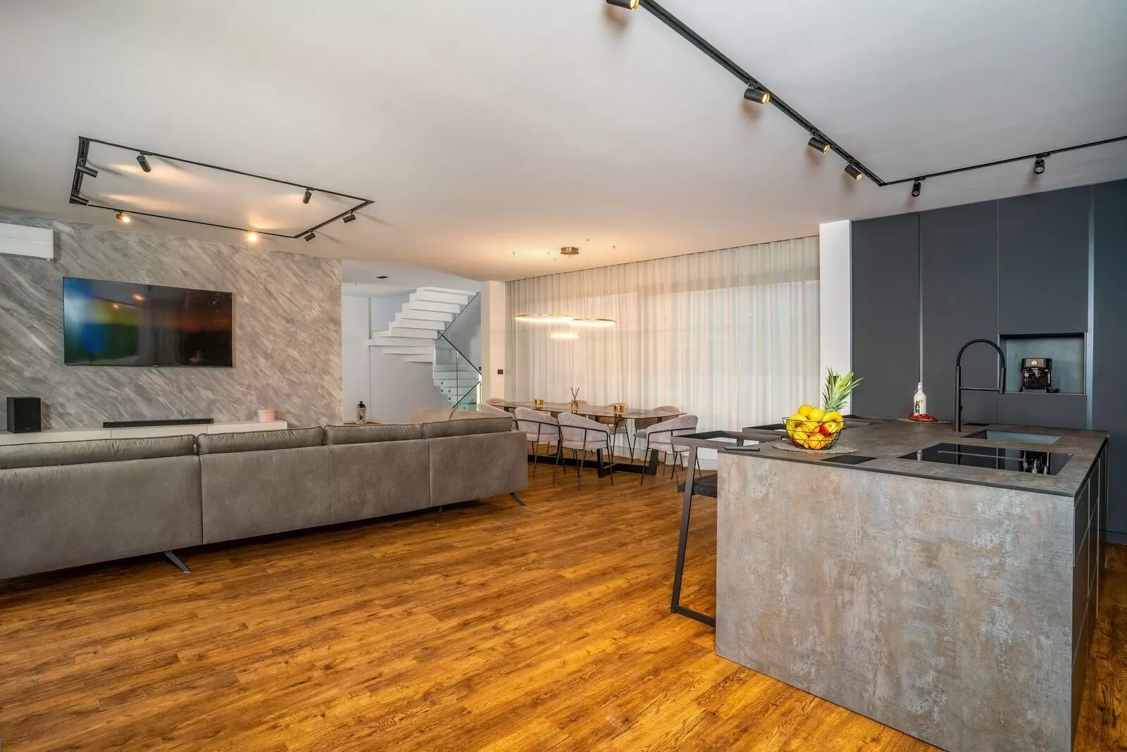 Bereits bei der Ankunft erkennen Sie die elegante Raffinesse von Villa Sky. Das geräumige 400 m² große Interieur empfängt Sie sofort mit der Wärme der Sonne, die durch große Glaswände strömt, und der Raum ist mit einer perfekten Balance aus modernen Möbeln und raffinierten Details erfüllt. Jedes Zimmer spiegelt die perfekte Mischung aus Stil und Funktionalität wider und schafft den Eindruck eines luxuriösen Zuhauses. Die Schlafzimmer sind wahre Oasen der Entspannung. Jedes der vier Schlafzimmer ist mit einem King-Size-Bett, einem eigenen Badezimmer und hochwertiger Klimaanlage ausgestattet und perfekt für romantische Abende oder Morgen mit dem Duft des Meeres. Luxuriöse Samt-Möbel, moderne Fernseher, begehbare Kleiderschränke und elegante Schminktische machen diese Räume nicht nur funktional, sondern auch bezaubernd schön. Jedes Schlafzimmer verfügt über einen Balkon, auf dem Sie unvergessliche Ausblicke auf die Adria genießen können, während das Geräusch der Wellen Sie in den Schlaf wiegt. Mit einem atemberaubenden Ausblick tauchen Sie in Entspannung und friedliche Momente ein, jeder Tag wird mit Freude und Erinnerungen vermerkt, die ein Leben lang bleiben. Der Außenbereich der Villa ist wirklich ein Paradies. Stellen Sie sich vor, Sie liegen auf der Sonnenterrasse am beheizten Pool, trinken Ihren Lieblingscocktail oder genießen ein Bad in der Sonne, alles mit einem Panorama-Blick auf das Meer. Der Pool ist perfekt positioniert und von einer Terrasse umgeben, die ideal zum Entspannen, Sonnenbaden oder für den Genuss von Abendsonnenuntergängen ist. Wenn Sie auf der Suche nach etwas aktiverer Unterhaltung sind, finden Sie hier alles, was Sie für Entspannung und Spaß brauchen. Für diejenigen, die Technologie genießen oder sich bei Gesellschaftsspielen entspannen möchten, gibt es einen separaten Raum mit Fitnessgeräten, einem Tischtennistisch, PlayStation, einem großen Sofa mit Fernseher und einem Heimkino. Der perfekte Ort, um sich nach einem Tag in der Sonne zu entspannen oder abends Filme im Komfort Ihres privaten Raums zu genießen. Diese Kombination aus Spaß, Komfort und Luxus sorgt dafür, dass jeder Moment in Villa Sky unvergesslich wird.