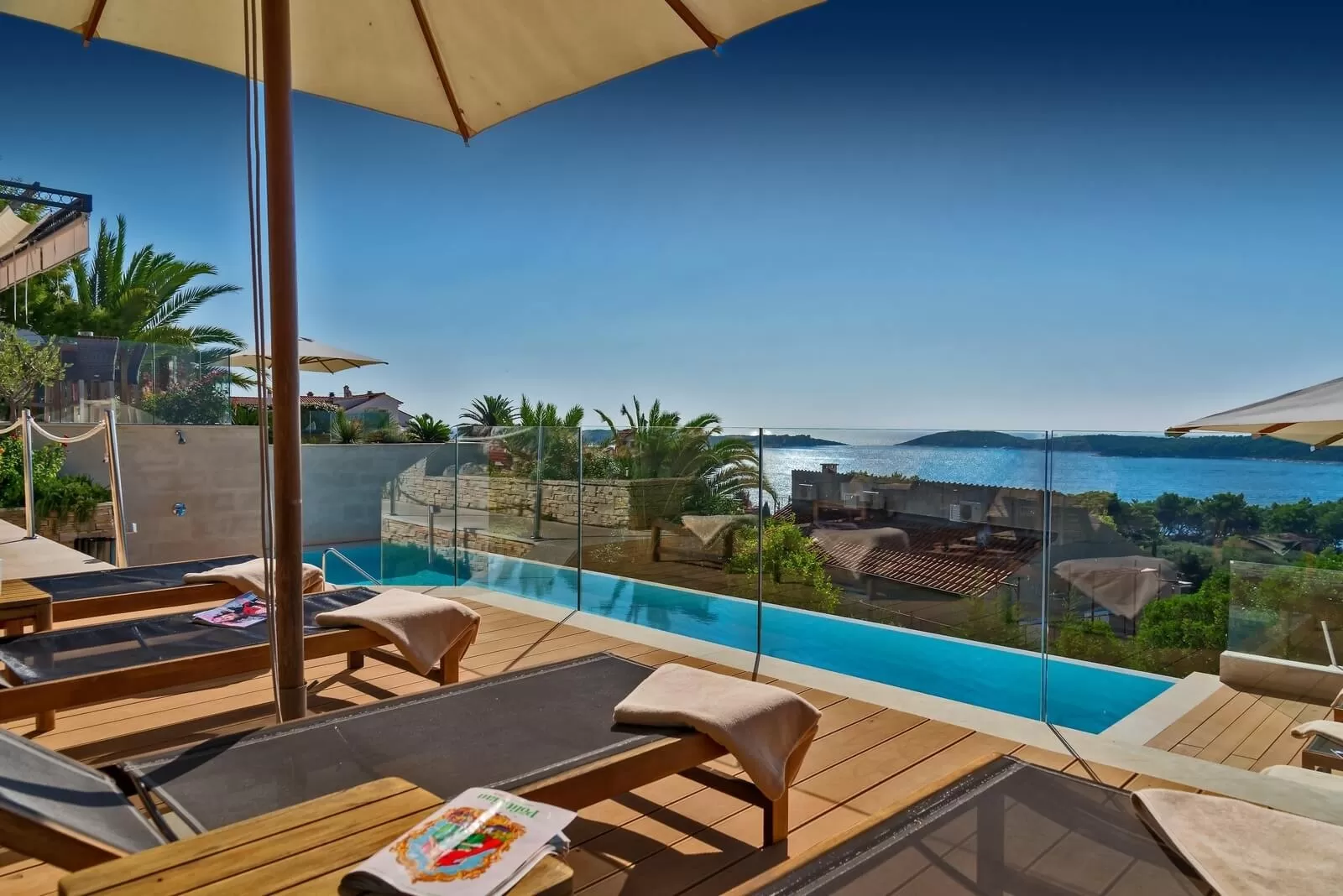 Villa Aida is located on the most famous Croatian island, Hvar. The sunny island of Hvar is unique and an excellent choice for a vacation. Surrounded by lots of greenery, Villa Aida has a wonderful view of the sea and offers complete peace and privacy. Only 50 meters away from the sea, it offers guests to enjoy the beach and the sun with beautiful clean air whenever they want. While enjoying the spacious terrace and drinking your morning coffee, you can smell the Mediterranean air, and the large swimming pool, which is surrounded by sunbeds and umbrellas, is a great choice for family gatherings and enjoying summer days. If you want to hide from the sun and enjoy food, there is a spacious covered terrace at your disposal, which is great for socializing. The fenced property of the villa offers guests privacy and a carefree vacation. As the evening approaches, you can enjoy a night swim in the illuminated pool or a glass of good wine and relax with a wonderful view of the sea.