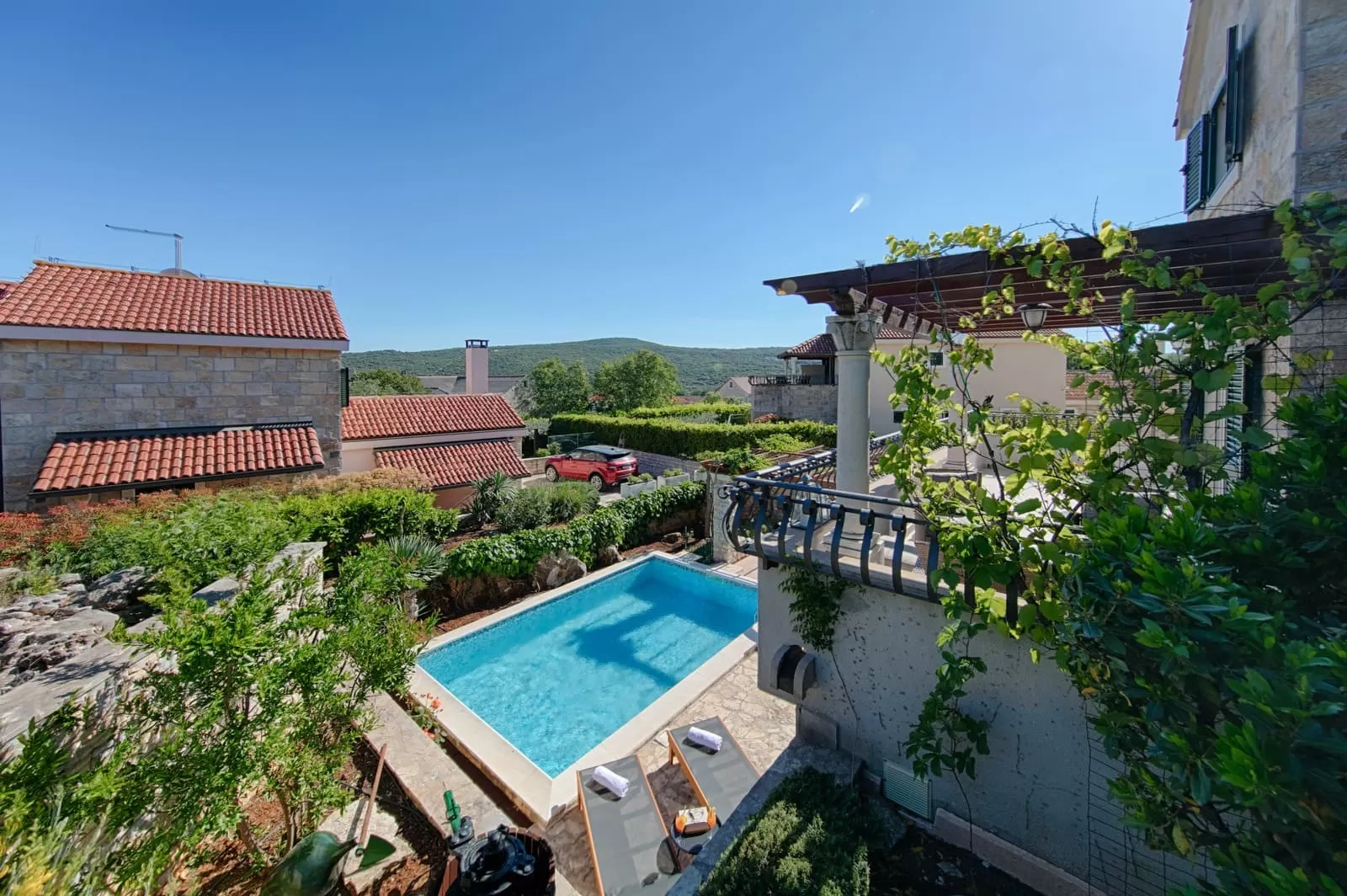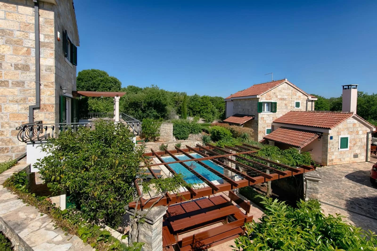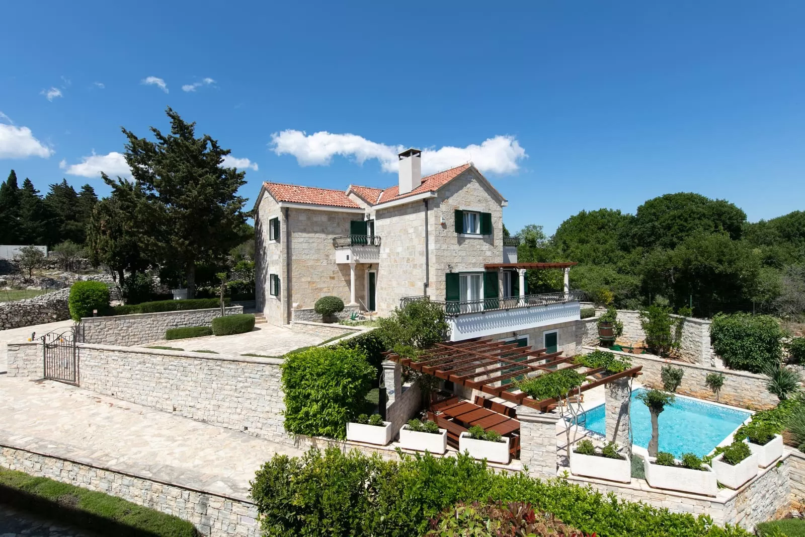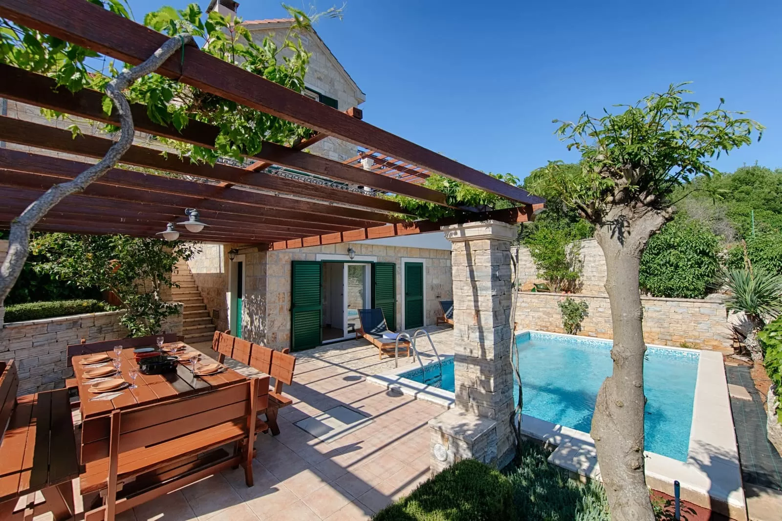 On the island of Brač, at 400 meters above sea level, lies the small village of Pražnica, the center of sheep breeding and the production of the world-famous Brač cheese. If you walk through its narrow romantic streets, they will lead you to Demi, Luči and Anja, three stone sisters of Brač, ready to welcome you within the shelter of their walls, offer you a glass of cold spring water and treat you to authentic Brač cheese. This is the true image of Pražnica, a place where even the stone feels hospitable and the clock ticks slower than anywhere else in the world. Villas Demi, Luči and Anja are sister villas, each with its own outdoor pool. Surrounded by a combination of stone and greenery, they provide privacy, safety, peace and beauty at the same time. Their position is ideal for large families and groups of friends who wish to spend their vacation surrounded by loved ones in a place that nourishes both heart and soul. The soul with indescribable peace and serenity, and the heart with the energy of sunny beaches and the azure blue sea that calls you to dive in and let the waves carry your worries far away from the shore…