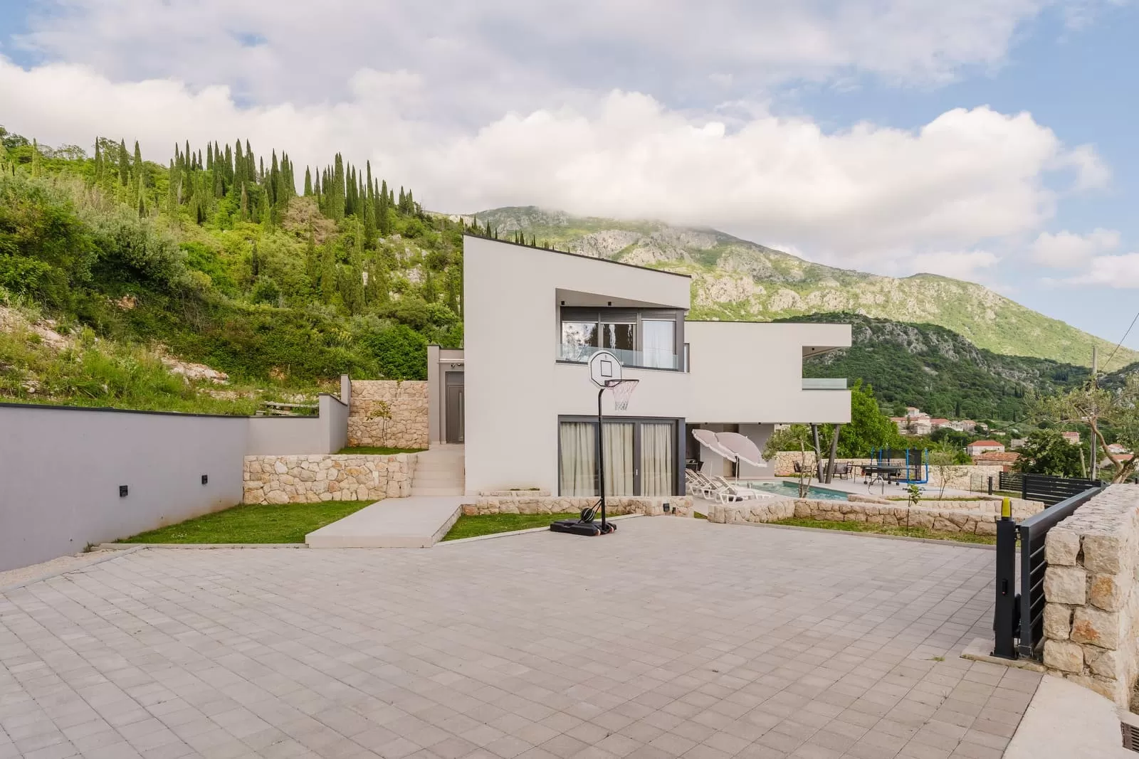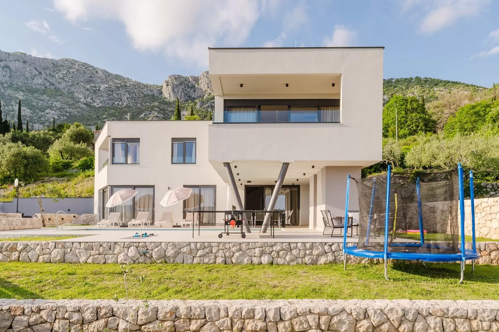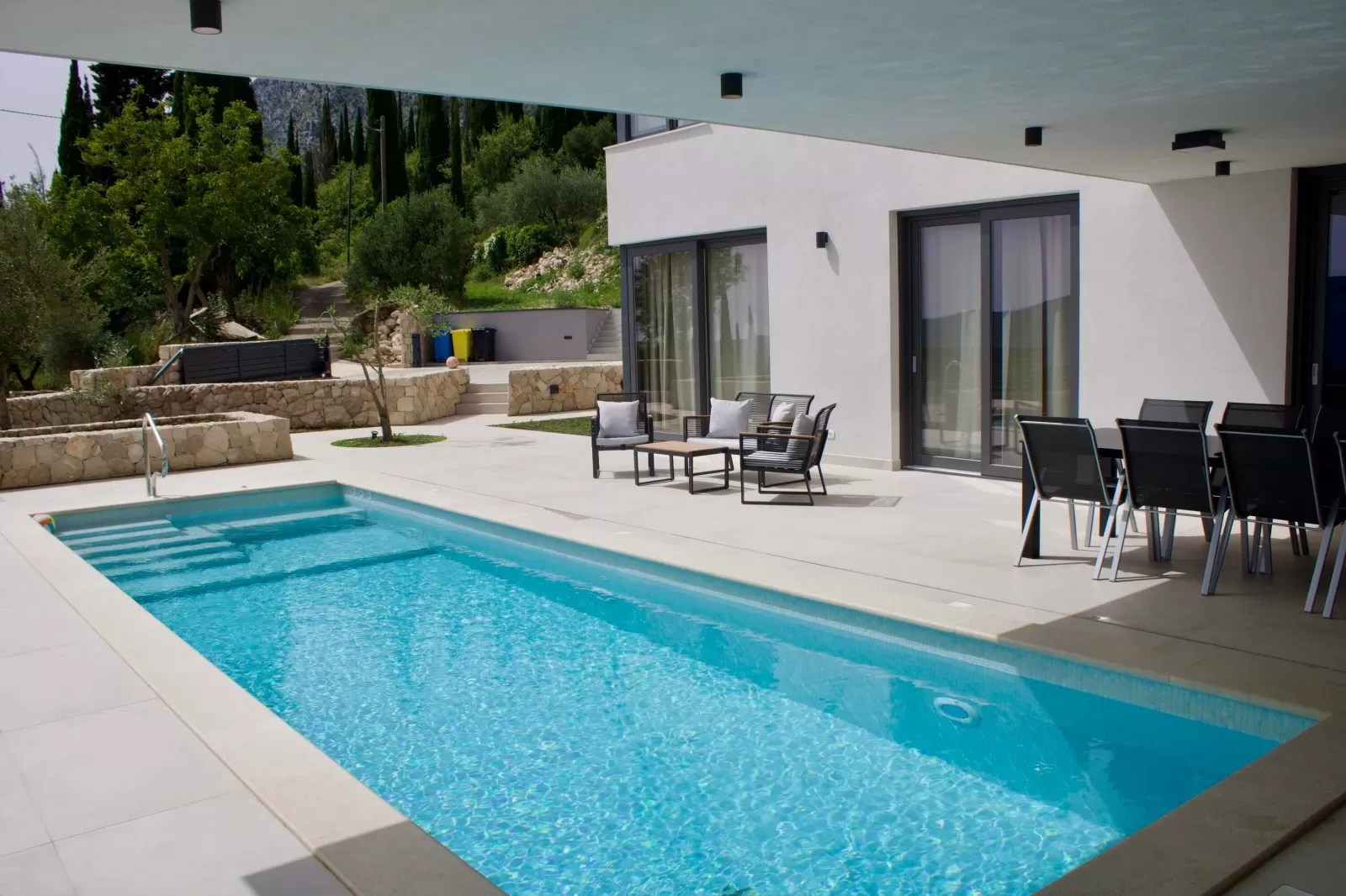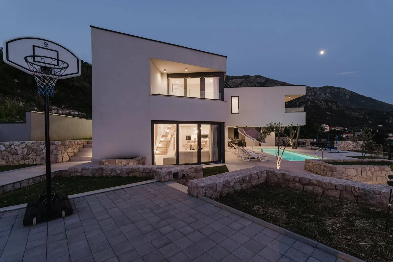 Surrounded by greenery and the rocky Dalmatian landscape, the villa in Dubravka offers a unique sense of privacy and tranquility. The spacious terrace with a heated pool invites you for a refreshing morning swim or evening relaxation under the starry sky, while the comfortable loungers provide the perfect spot for soaking up the sun. The fully fenced property ensures safety and intimacy, making it an ideal choice for families and groups of friends. In the courtyard, you will also find a small basketball corner, perfect for fun and sports, while the outdoor kitchen with a modern barbecue is designed for preparing Mediterranean delicacies in the open air. Three private parking spaces guarantee easy arrival, while the scent of olives and Mediterranean plants in the garden further enriches the atmosphere. Every detail has been carefully designed to ensure a carefree stay – from the pool and sun terrace to the little extras included in the price, giving guests a true sense of luxury and freedom.