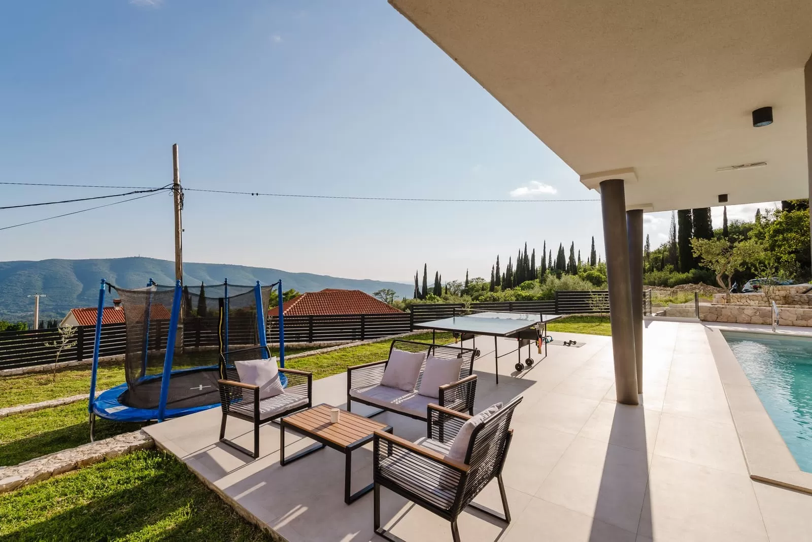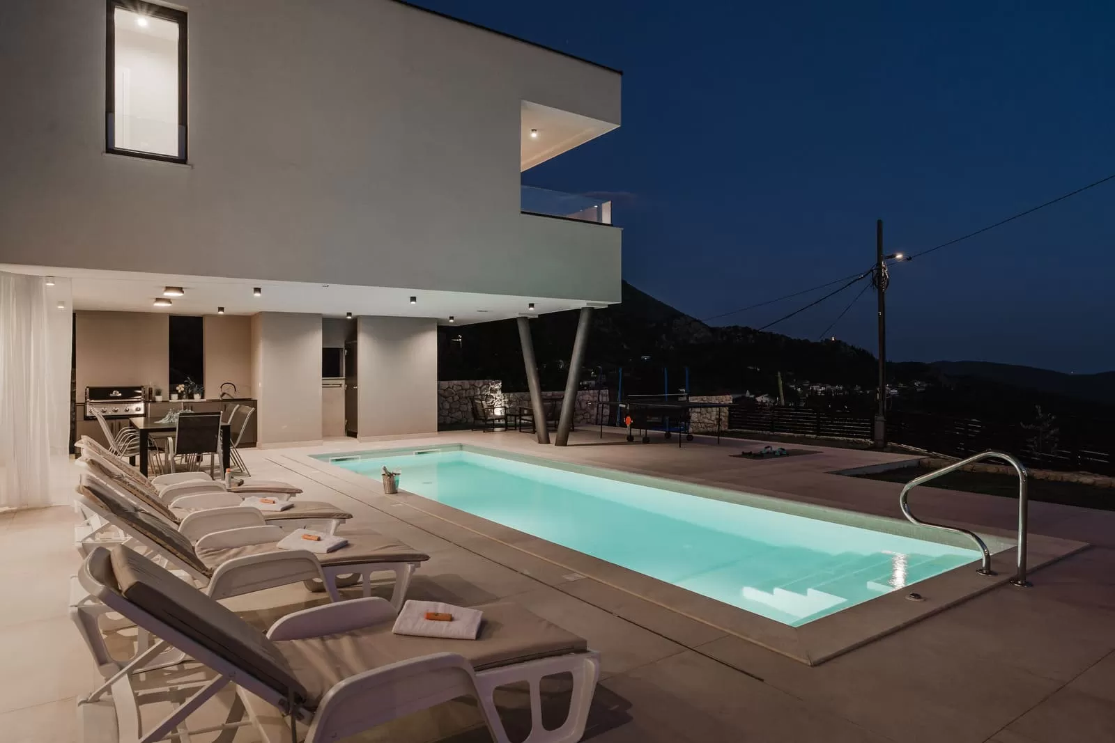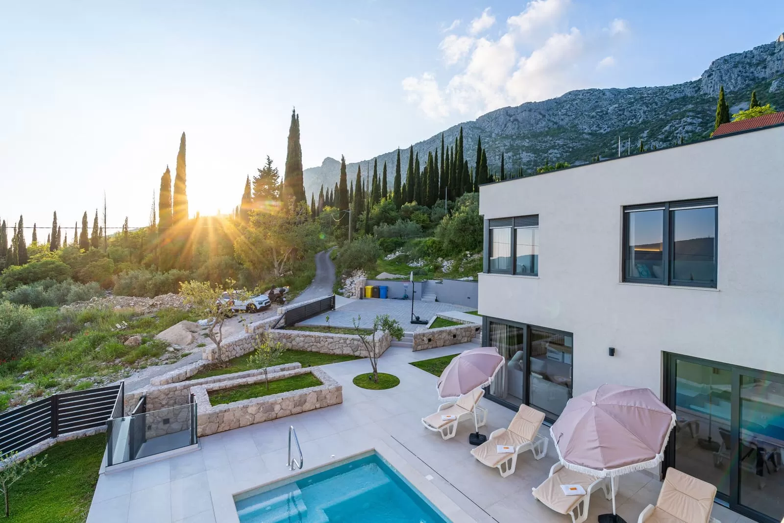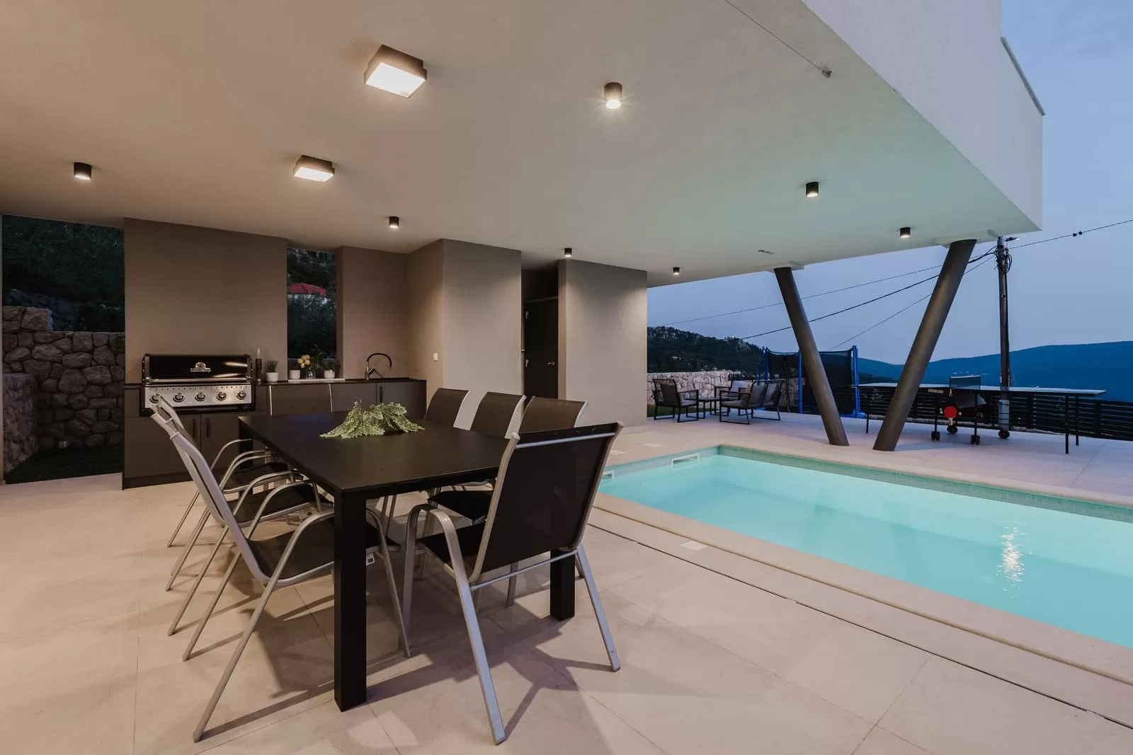 Surrounded by greenery and the rocky Dalmatian landscape, the villa in Dubravka offers a unique sense of privacy and tranquility. The spacious terrace with a heated pool invites you for a refreshing morning swim or evening relaxation under the starry sky, while the comfortable loungers provide the perfect spot for soaking up the sun. The fully fenced property ensures safety and intimacy, making it an ideal choice for families and groups of friends. In the courtyard, you will also find a small basketball corner, perfect for fun and sports, while the outdoor kitchen with a modern barbecue is designed for preparing Mediterranean delicacies in the open air. Three private parking spaces guarantee easy arrival, while the scent of olives and Mediterranean plants in the garden further enriches the atmosphere. Every detail has been carefully designed to ensure a carefree stay – from the pool and sun terrace to the little extras included in the price, giving guests a true sense of luxury and freedom.