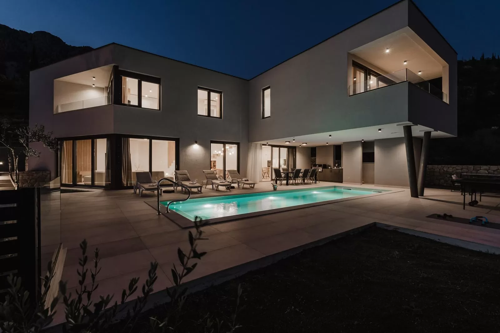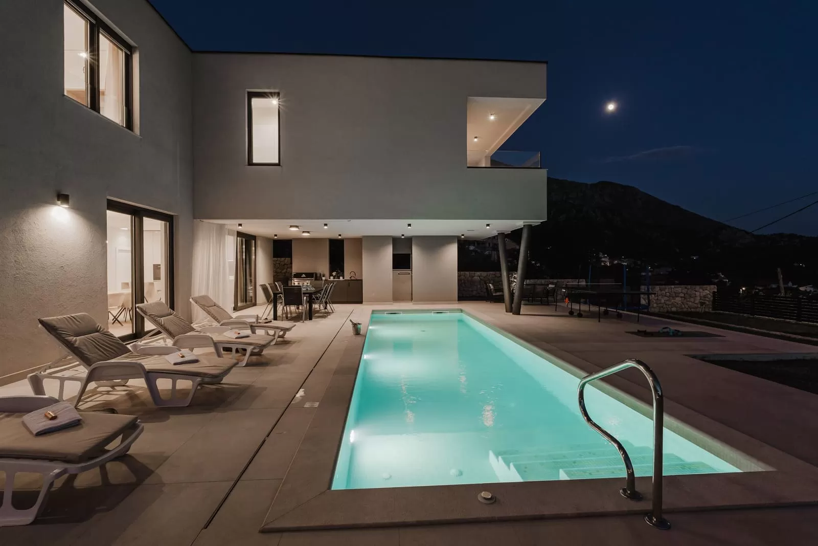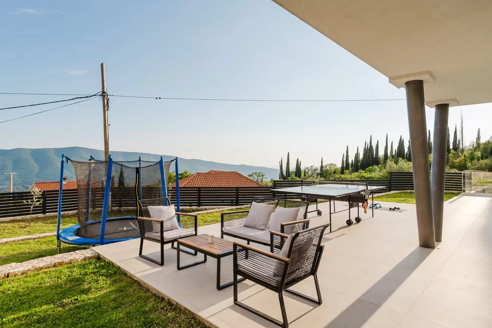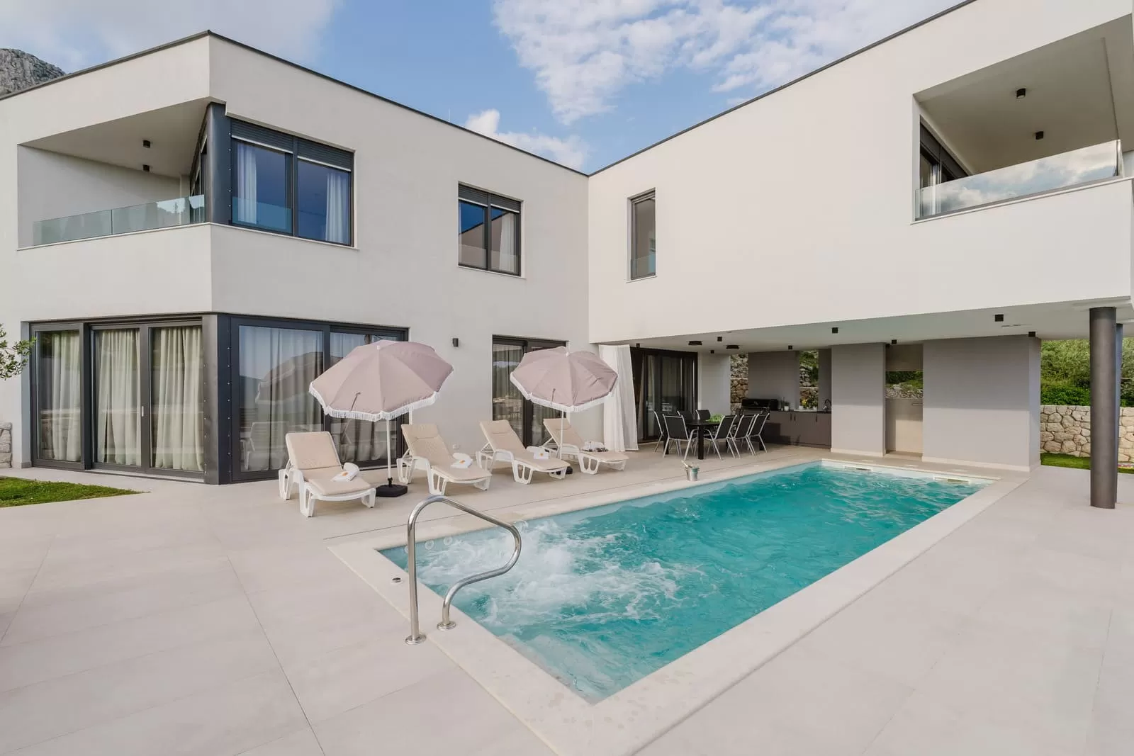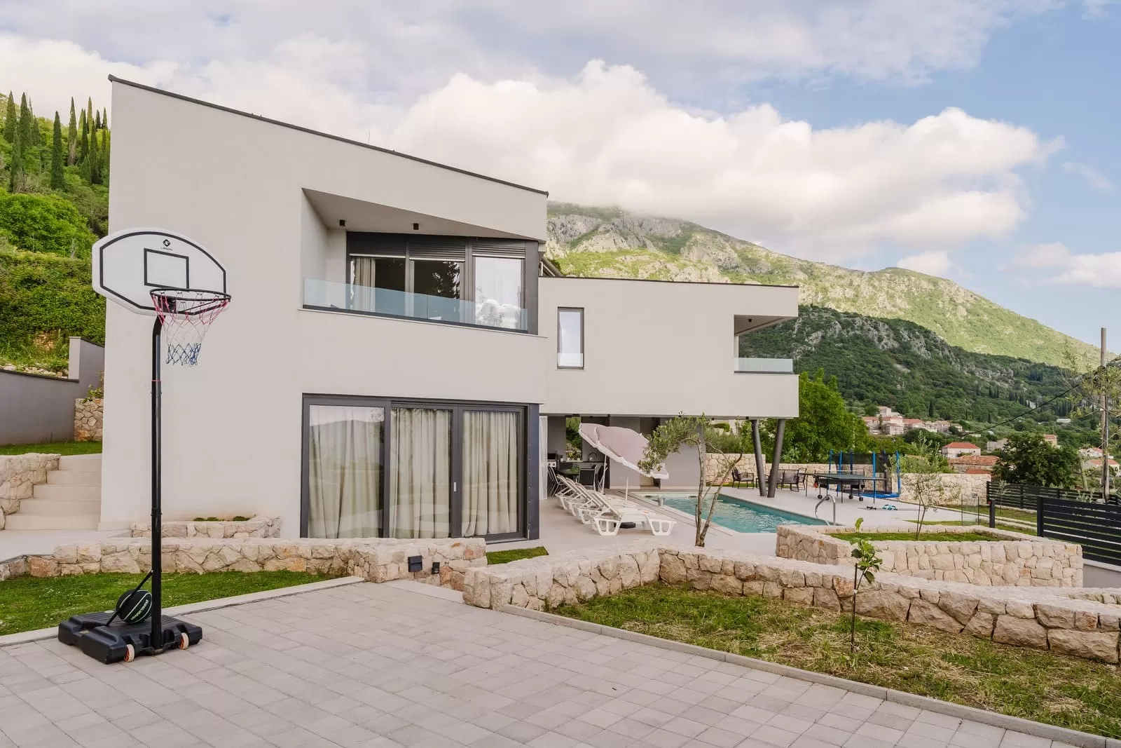Surrounded by greenery and the rocky Dalmatian landscape, the villa in Dubravka offers a unique sense of privacy and tranquility. The spacious terrace with a heated pool invites you for a refreshing morning swim or evening relaxation under the starry sky, while the comfortable loungers provide the perfect spot for soaking up the sun. The fully fenced property ensures safety and intimacy, making it an ideal choice for families and groups of friends. In the courtyard, you will also find a small basketball corner, perfect for fun and sports, while the outdoor kitchen with a modern barbecue is designed for preparing Mediterranean delicacies in the open air. Three private parking spaces guarantee easy arrival, while the scent of olives and Mediterranean plants in the garden further enriches the atmosphere. Every detail has been carefully designed to ensure a carefree stay – from the pool and sun terrace to the little extras included in the price, giving guests a true sense of luxury and freedom.