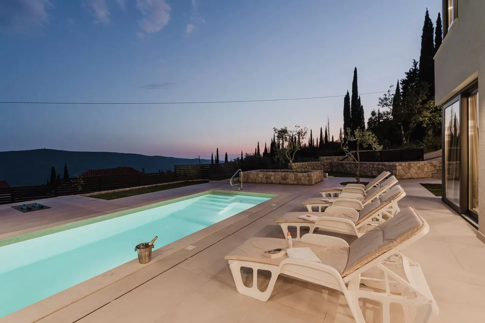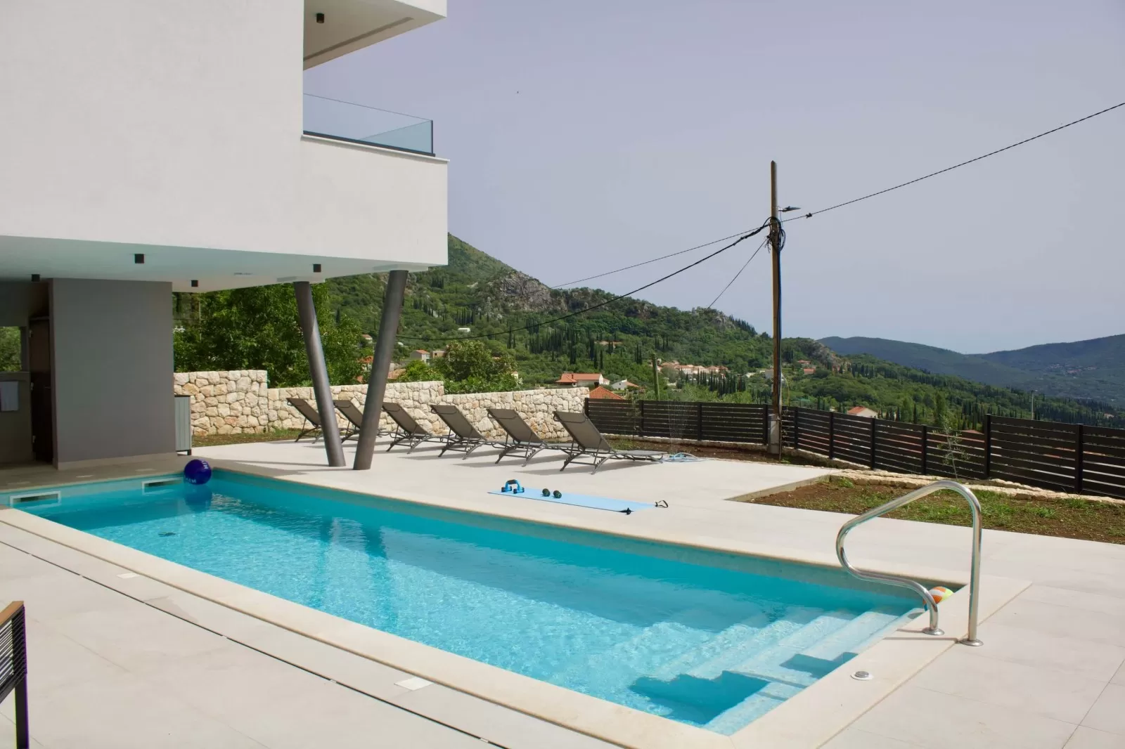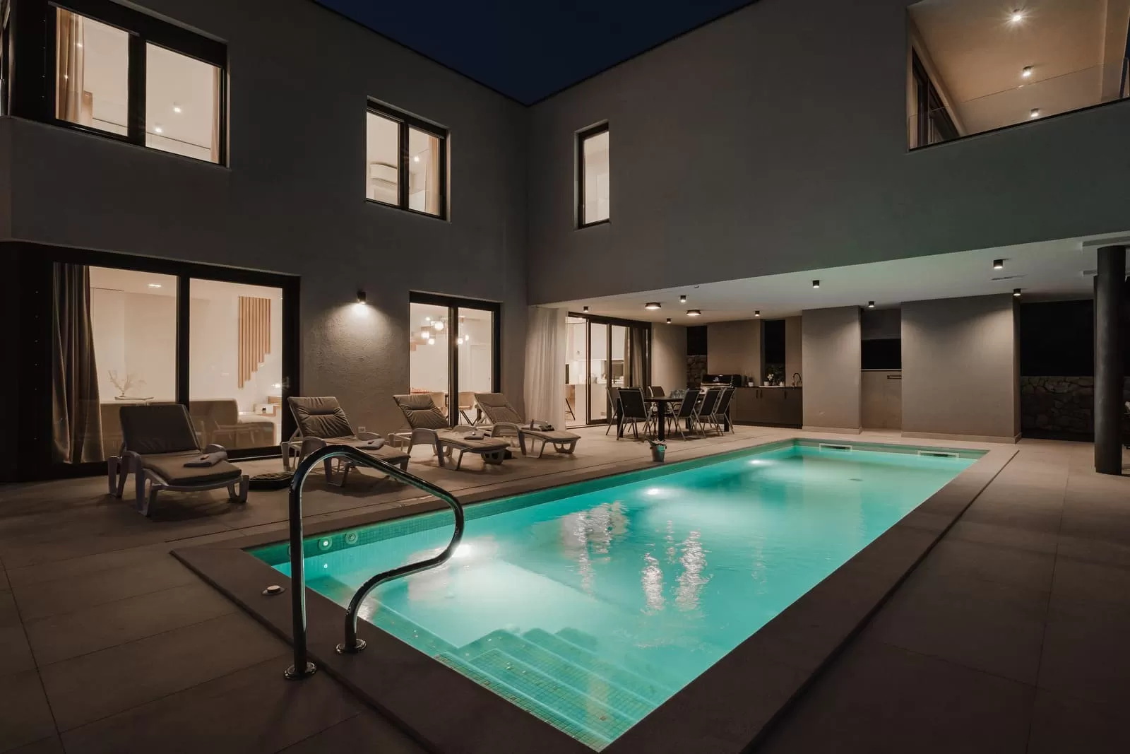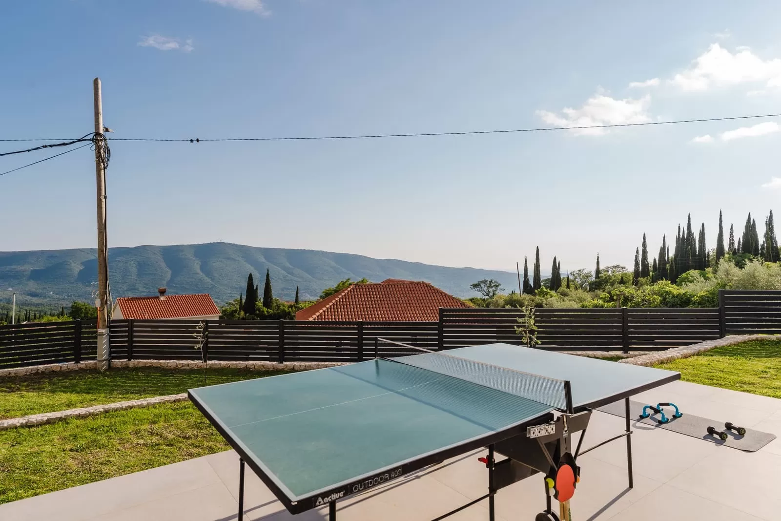 Surrounded by greenery and the rocky Dalmatian landscape, the villa in Dubravka offers a unique sense of privacy and tranquility. The spacious terrace with a heated pool invites you for a refreshing morning swim or evening relaxation under the starry sky, while the comfortable loungers provide the perfect spot for soaking up the sun. The fully fenced property ensures safety and intimacy, making it an ideal choice for families and groups of friends. In the courtyard, you will also find a small basketball corner, perfect for fun and sports, while the outdoor kitchen with a modern barbecue is designed for preparing Mediterranean delicacies in the open air. Three private parking spaces guarantee easy arrival, while the scent of olives and Mediterranean plants in the garden further enriches the atmosphere. Every detail has been carefully designed to ensure a carefree stay – from the pool and sun terrace to the little extras included in the price, giving guests a true sense of luxury and freedom.