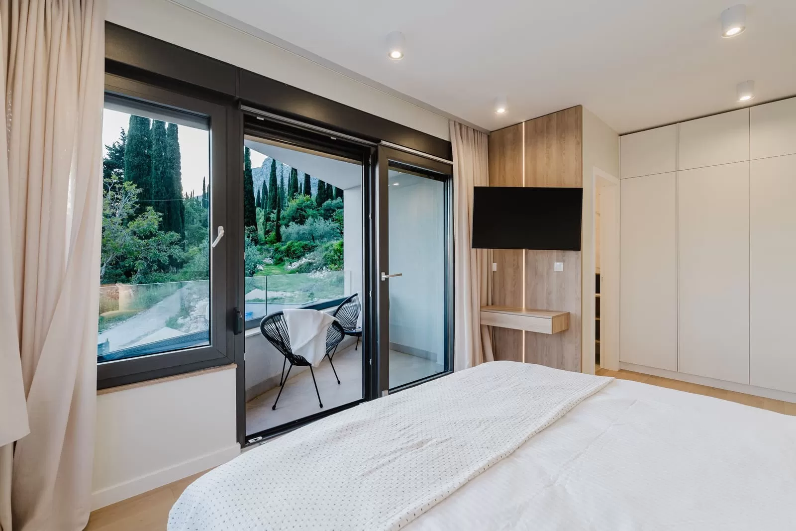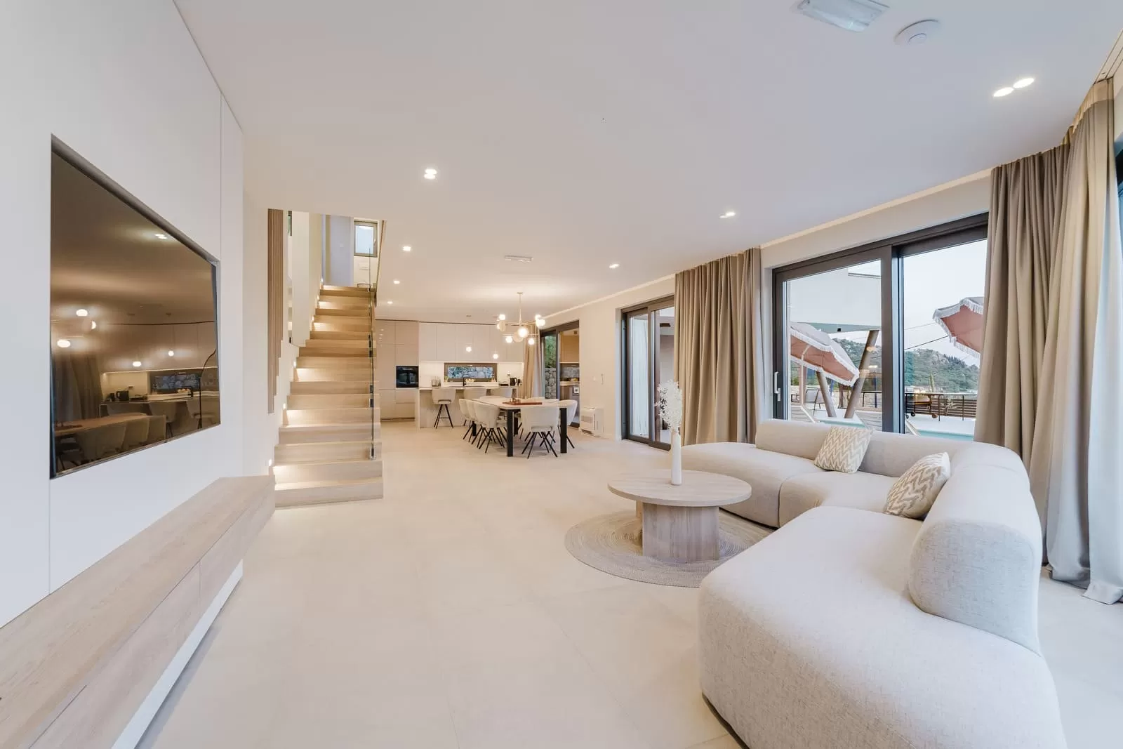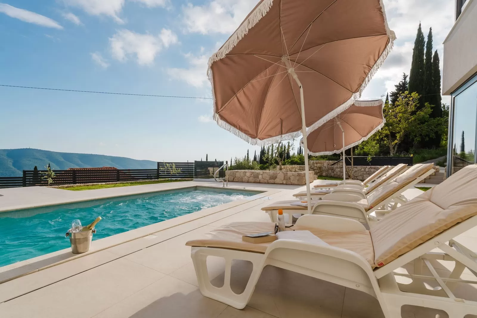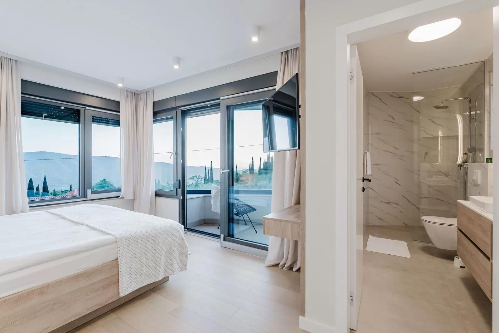 The interior of Villa Dorata exudes contemporary elegance and spaciousness, offering comfort for up to eight guests. The large living room, illuminated by natural light through wide glass walls, is directly connected to the outdoor terrace and pool, creating a perfect harmony between indoor and outdoor living. A modern lounge area with cozy sofas and a smart TV is ideal for evenings together, while minimalist wooden details and warm tones bring a touch of luxury. The kitchen is fully equipped with modern appliances and a stylish island with seating, making it the central gathering spot for cooking and socializing. Next to it, a large dining table seats the entire group, perfect for family dinners or get-togethers with friends. The villa features four bedrooms carefully designed for restful sleep and privacy. Two master bedrooms are equipped with king-size beds, en-suite bathrooms, air conditioning, TV, and balconies with a view, while the other two bedrooms offer two comfortable single beds each – perfect for children or friends. In total, three modern bathrooms provide guests with the comfort of a hotel-like experience. Special attention has been paid to details – from the soft beige and white tones, ambient lighting, to modern amenities such as Netflix, washing machine, dryer, and home appliances. The interior of Villa Dorata is thoughtfully designed to combine functionality and aesthetic pleasure, ensuring guests a memorable stay in the heart of the Dubrovnik hinterland.