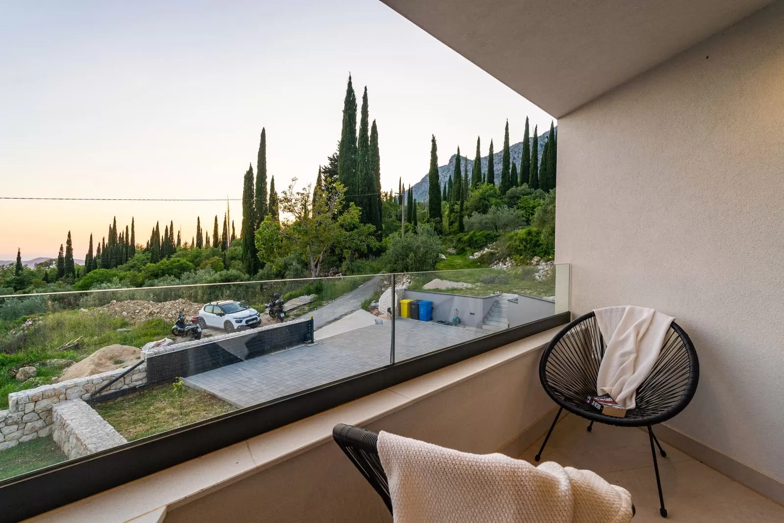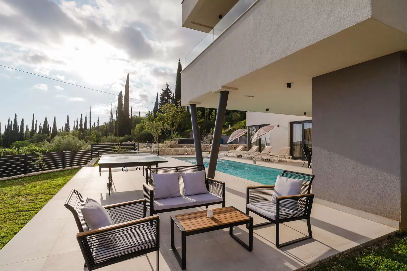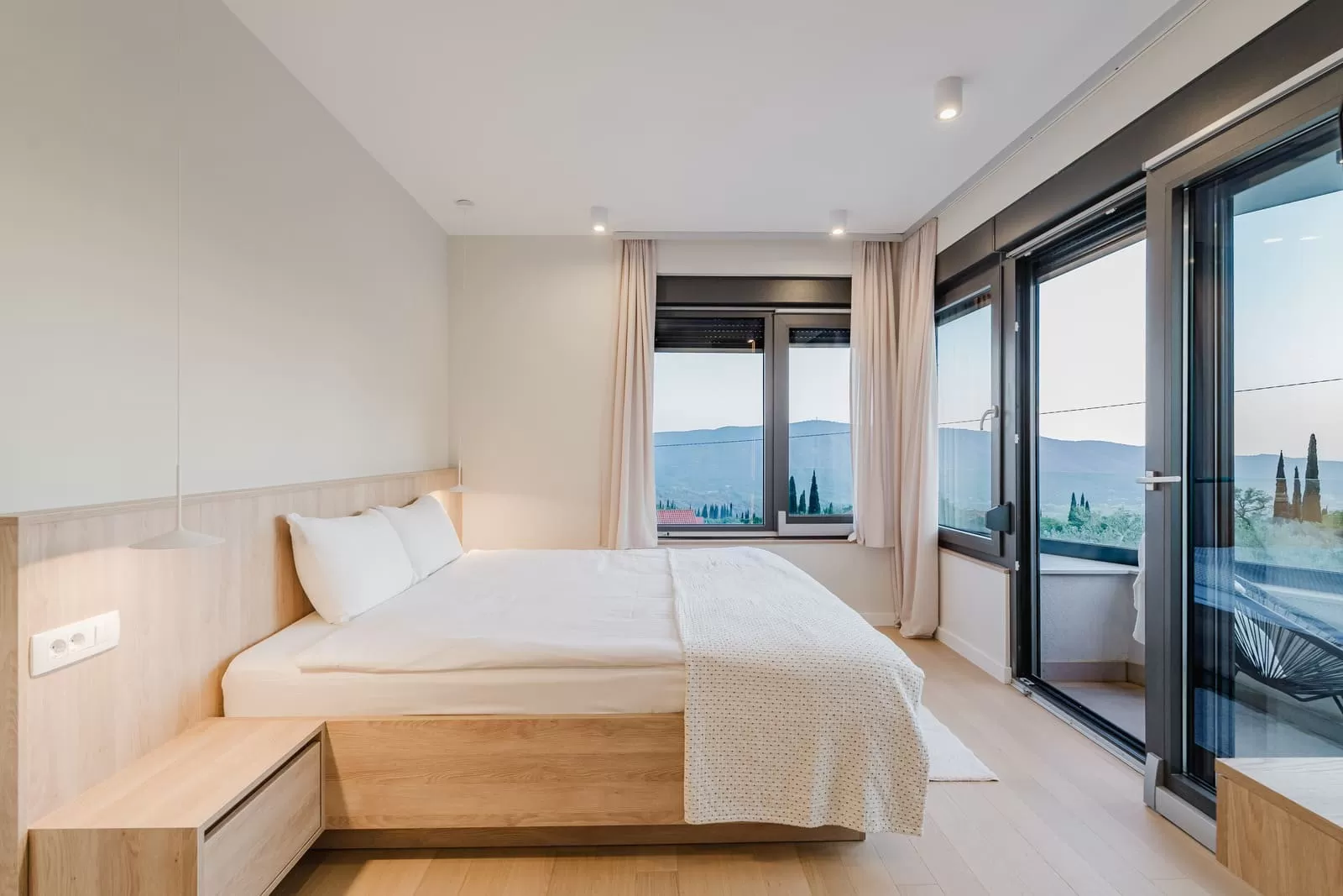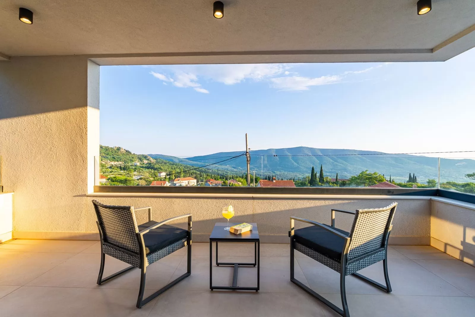 The interior of Villa Dorata exudes contemporary elegance and spaciousness, offering comfort for up to eight guests. The large living room, illuminated by natural light through wide glass walls, is directly connected to the outdoor terrace and pool, creating a perfect harmony between indoor and outdoor living. A modern lounge area with cozy sofas and a smart TV is ideal for evenings together, while minimalist wooden details and warm tones bring a touch of luxury. The kitchen is fully equipped with modern appliances and a stylish island with seating, making it the central gathering spot for cooking and socializing. Next to it, a large dining table seats the entire group, perfect for family dinners or get-togethers with friends. The villa features four bedrooms carefully designed for restful sleep and privacy. Two master bedrooms are equipped with king-size beds, en-suite bathrooms, air conditioning, TV, and balconies with a view, while the other two bedrooms offer two comfortable single beds each – perfect for children or friends. In total, three modern bathrooms provide guests with the comfort of a hotel-like experience. Special attention has been paid to details – from the soft beige and white tones, ambient lighting, to modern amenities such as Netflix, washing machine, dryer, and home appliances. The interior of Villa Dorata is thoughtfully designed to combine functionality and aesthetic pleasure, ensuring guests a memorable stay in the heart of the Dubrovnik hinterland.