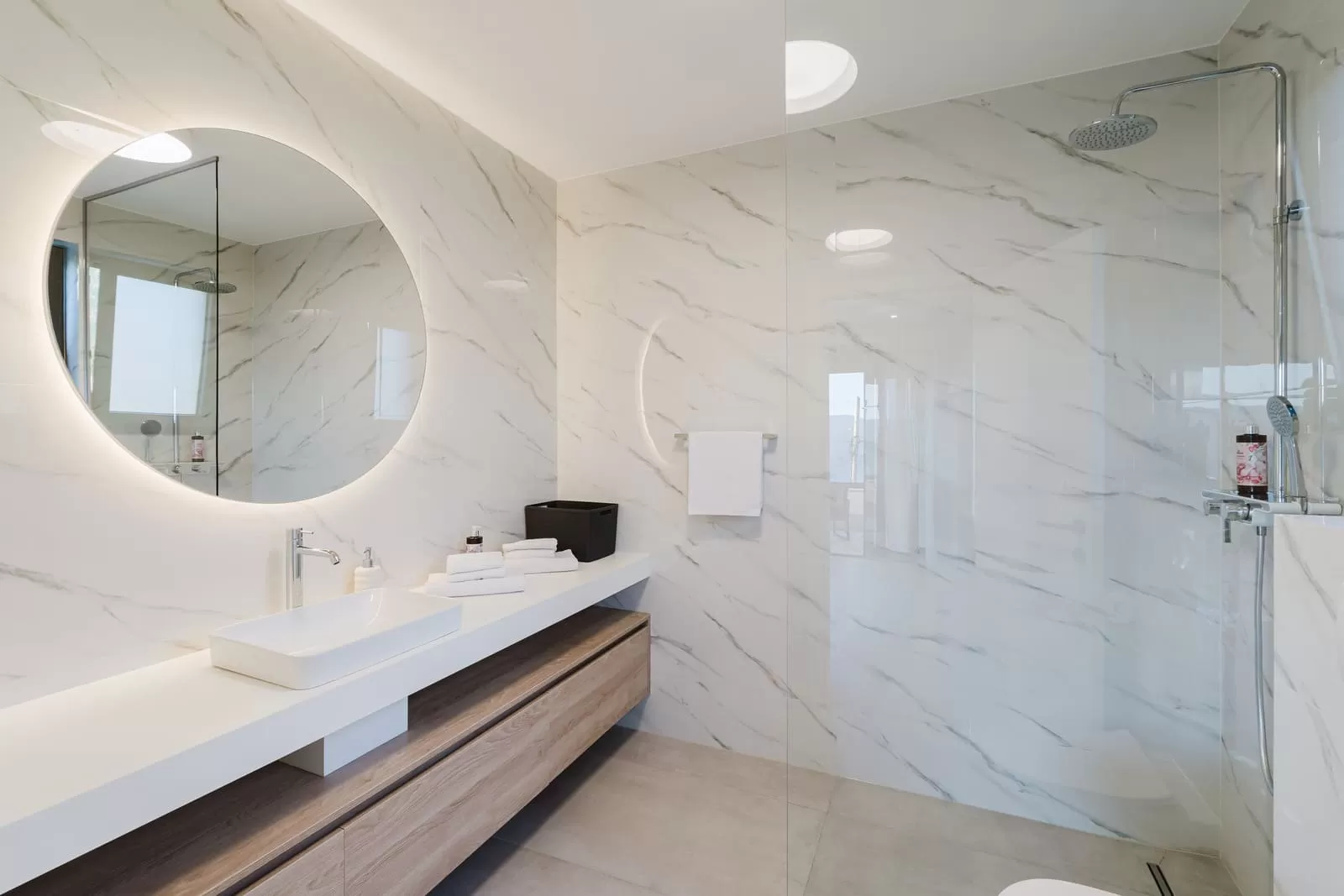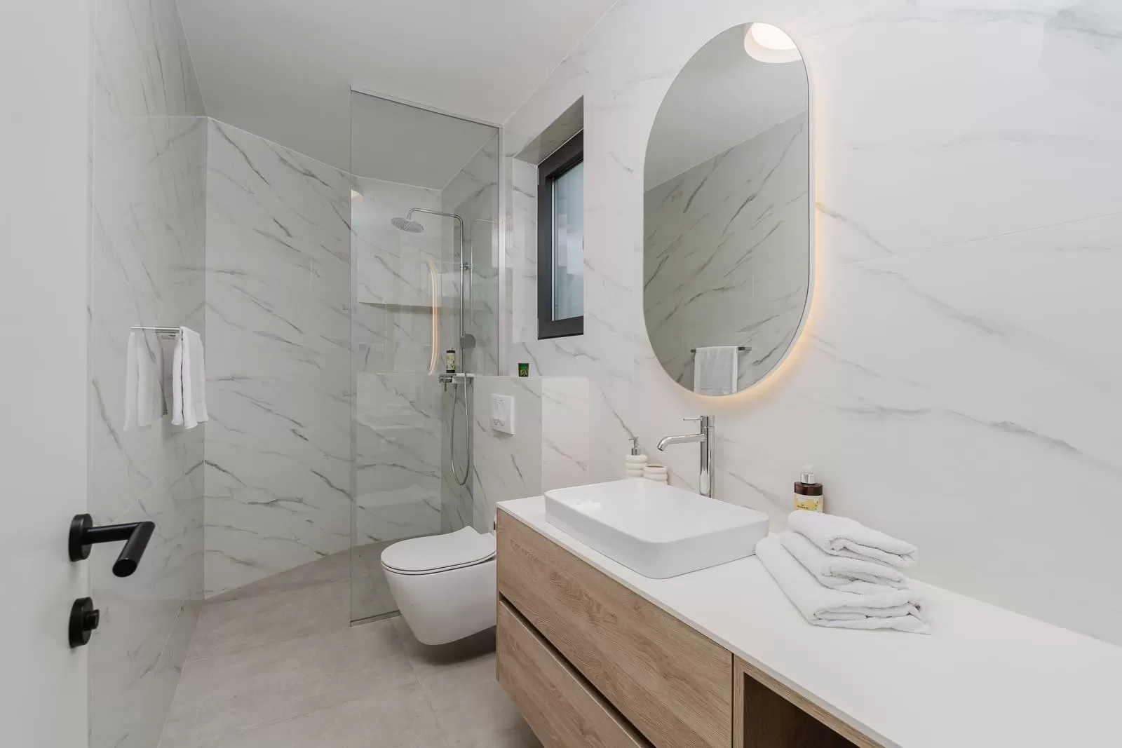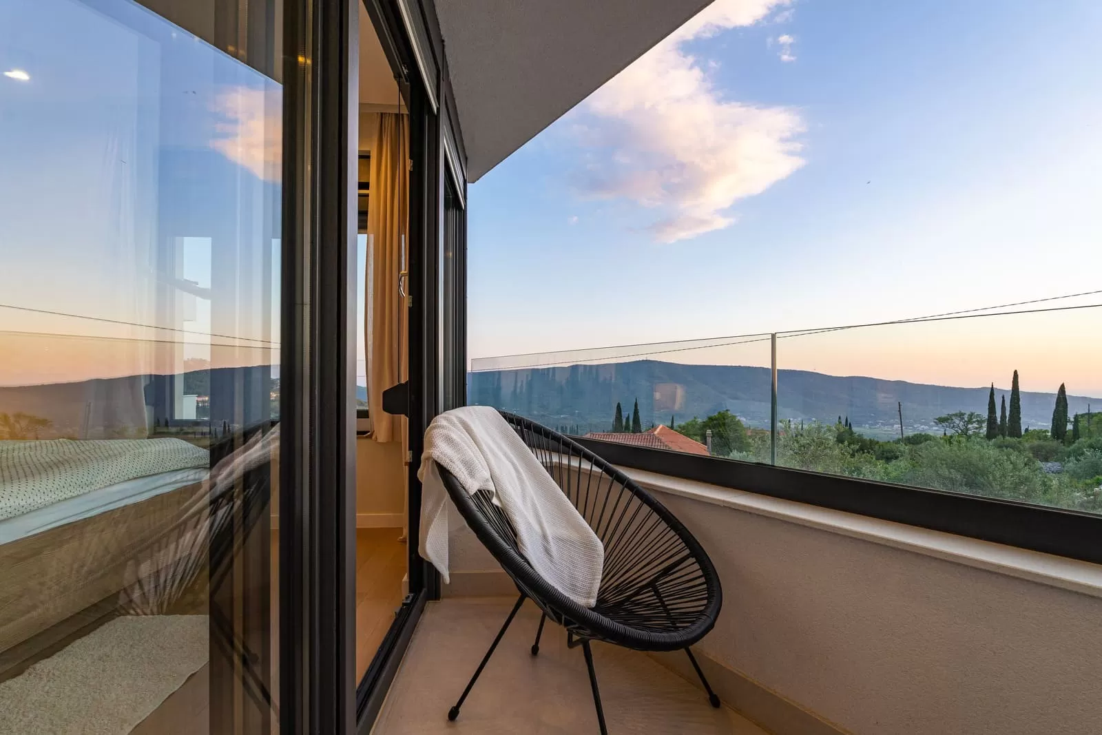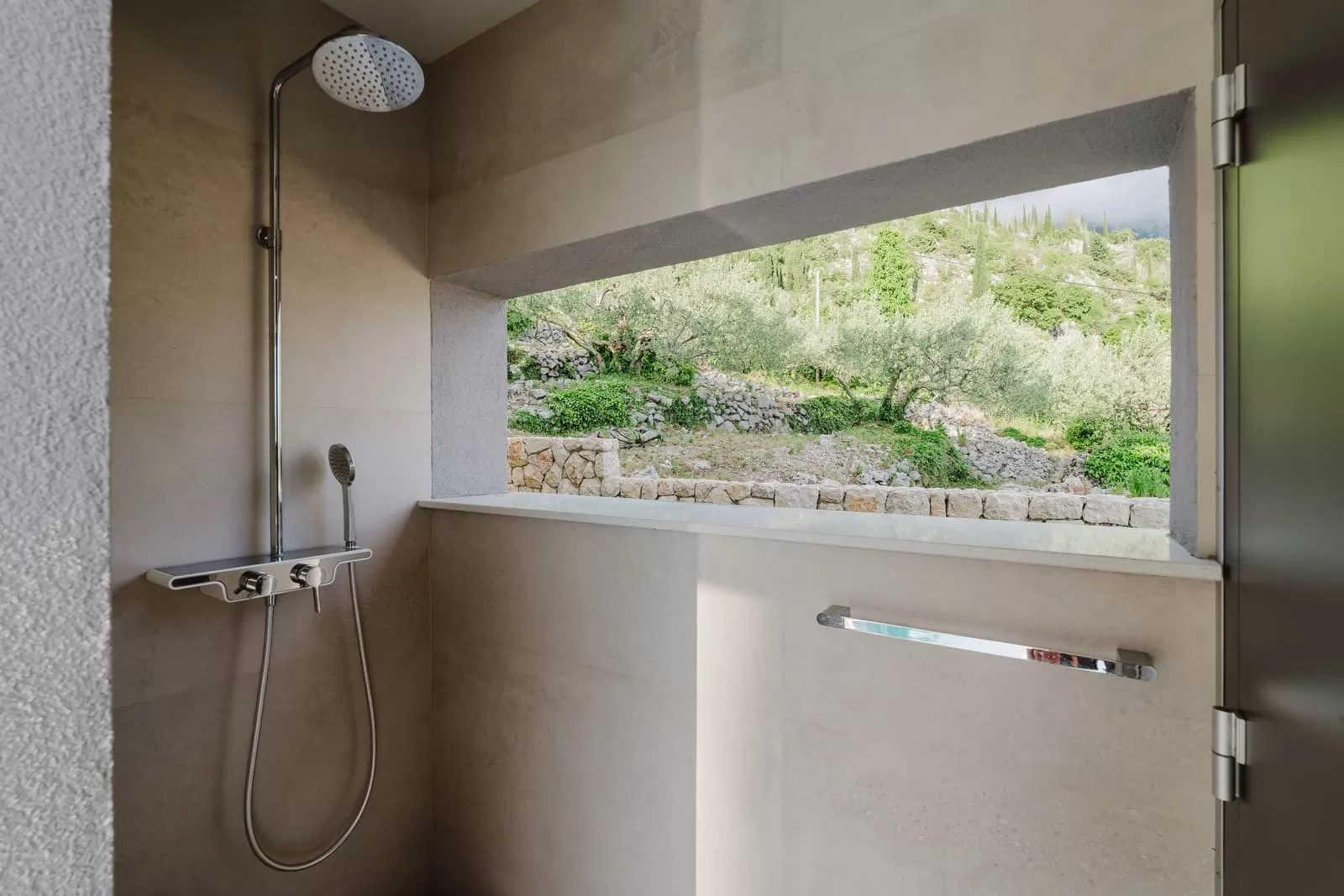 The interior of Villa Dorata exudes contemporary elegance and spaciousness, offering comfort for up to eight guests. The large living room, illuminated by natural light through wide glass walls, is directly connected to the outdoor terrace and pool, creating a perfect harmony between indoor and outdoor living. A modern lounge area with cozy sofas and a smart TV is ideal for evenings together, while minimalist wooden details and warm tones bring a touch of luxury. The kitchen is fully equipped with modern appliances and a stylish island with seating, making it the central gathering spot for cooking and socializing. Next to it, a large dining table seats the entire group, perfect for family dinners or get-togethers with friends. The villa features four bedrooms carefully designed for restful sleep and privacy. Two master bedrooms are equipped with king-size beds, en-suite bathrooms, air conditioning, TV, and balconies with a view, while the other two bedrooms offer two comfortable single beds each – perfect for children or friends. In total, three modern bathrooms provide guests with the comfort of a hotel-like experience. Special attention has been paid to details – from the soft beige and white tones, ambient lighting, to modern amenities such as Netflix, washing machine, dryer, and home appliances. The interior of Villa Dorata is thoughtfully designed to combine functionality and aesthetic pleasure, ensuring guests a memorable stay in the heart of the Dubrovnik hinterland.