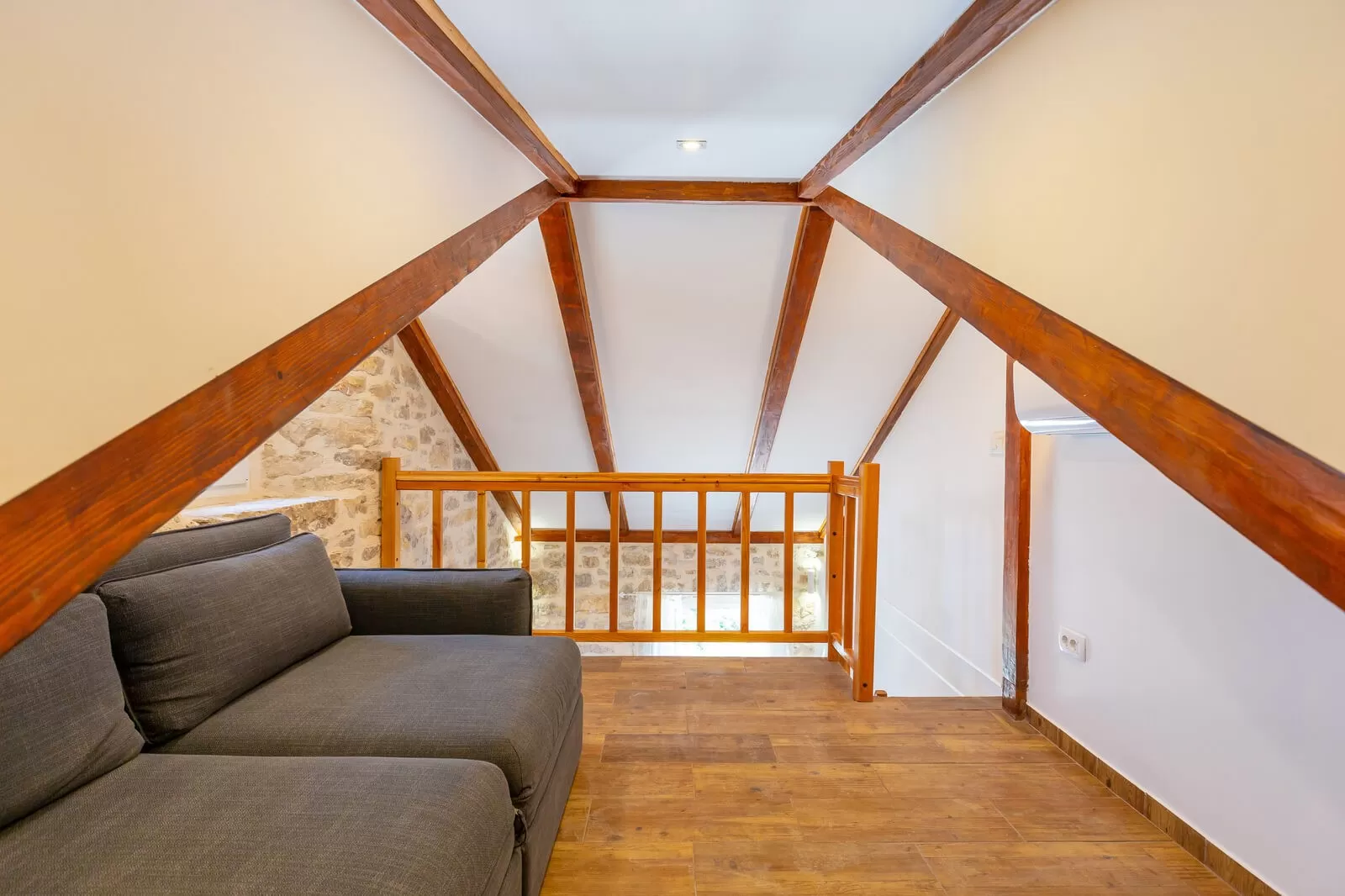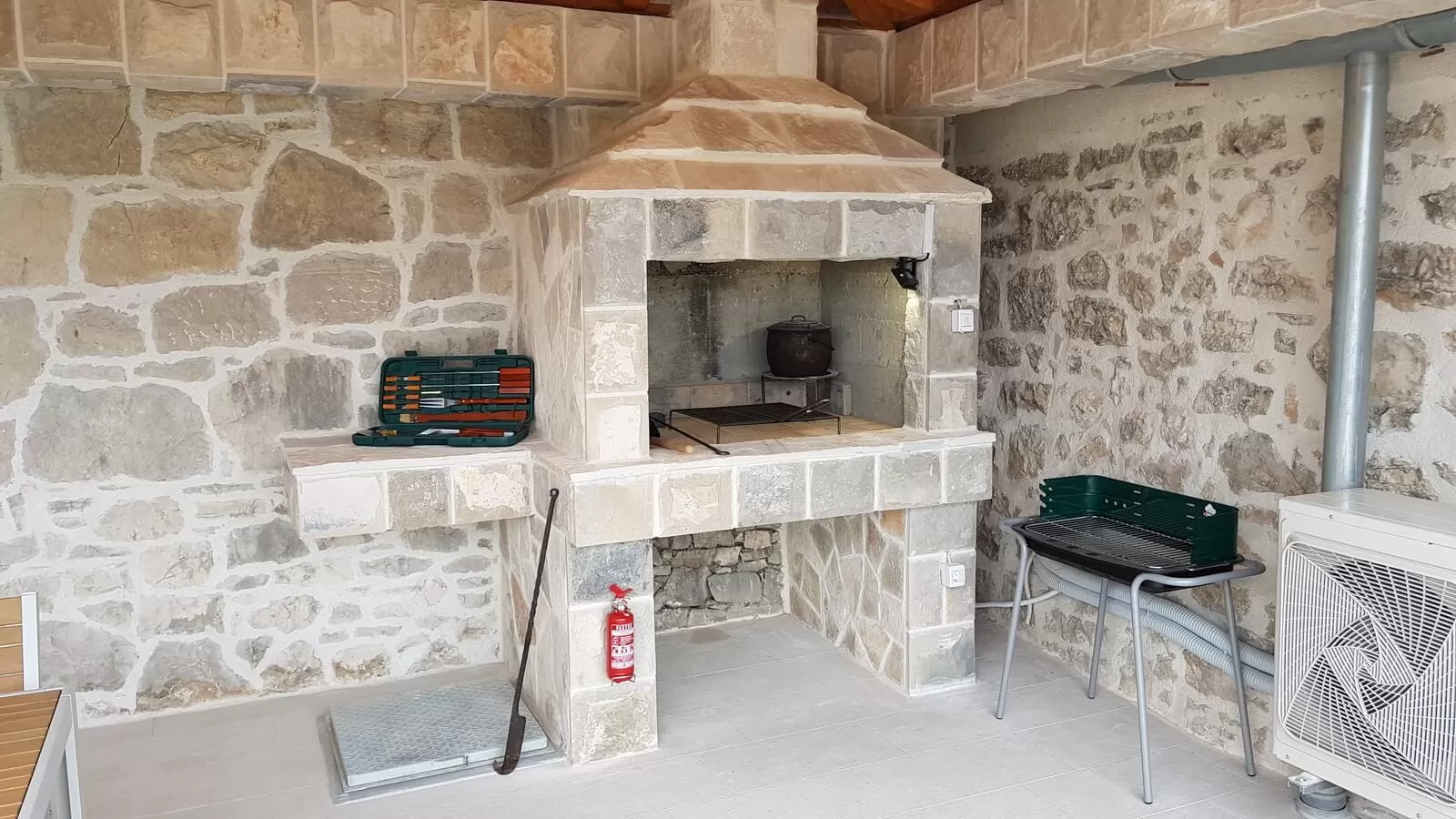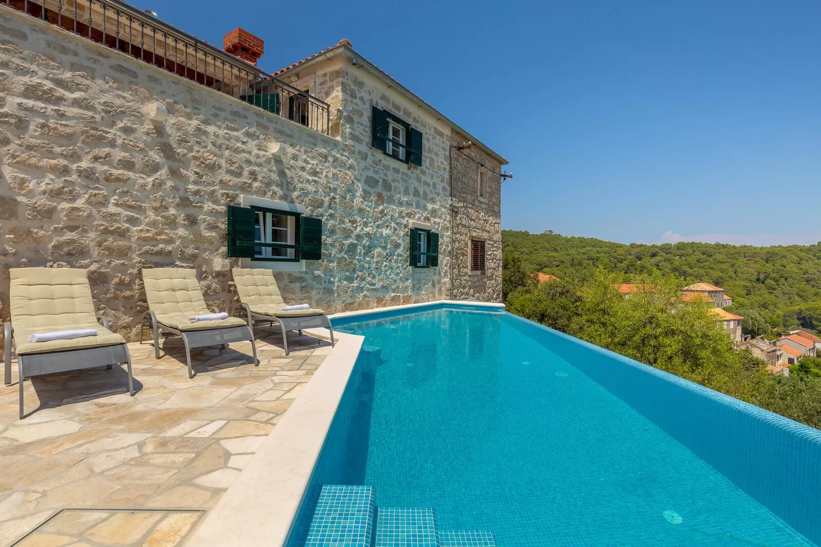 Rustic Villa Korina has 2 bedrooms with ensuite bathrooms and can accommodate a maximum of 6 people. The bedrooms are rustic in style and provide great comfort. Wood, beams, and stone visible in the villa give it true charm, and Villa Korina offers a warm atmosphere as if you were at home. The charming kitchen is ideal for enjoying traditional dishes, and the living room is a retreat from the heat. Beautiful details such as wooden decorations, a stone wall, and a wooden table will further enhance the atmosphere in the villa. Game enthusiasts will enjoy the PlayStation while the rest relaxes with a beautiful view and a captivating pool. Rustic Villa Korina has a fully fenced property and parking for 1 car. In the evening, relax with fragrant greenery, a beautiful fireplace, and the enchanting style of the villa, and experience unforgettable moments. Villa Korina offers its guests great privacy and a dream vacation.