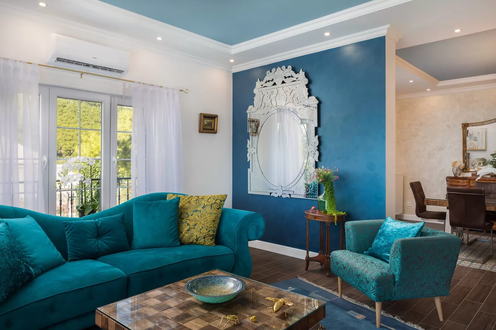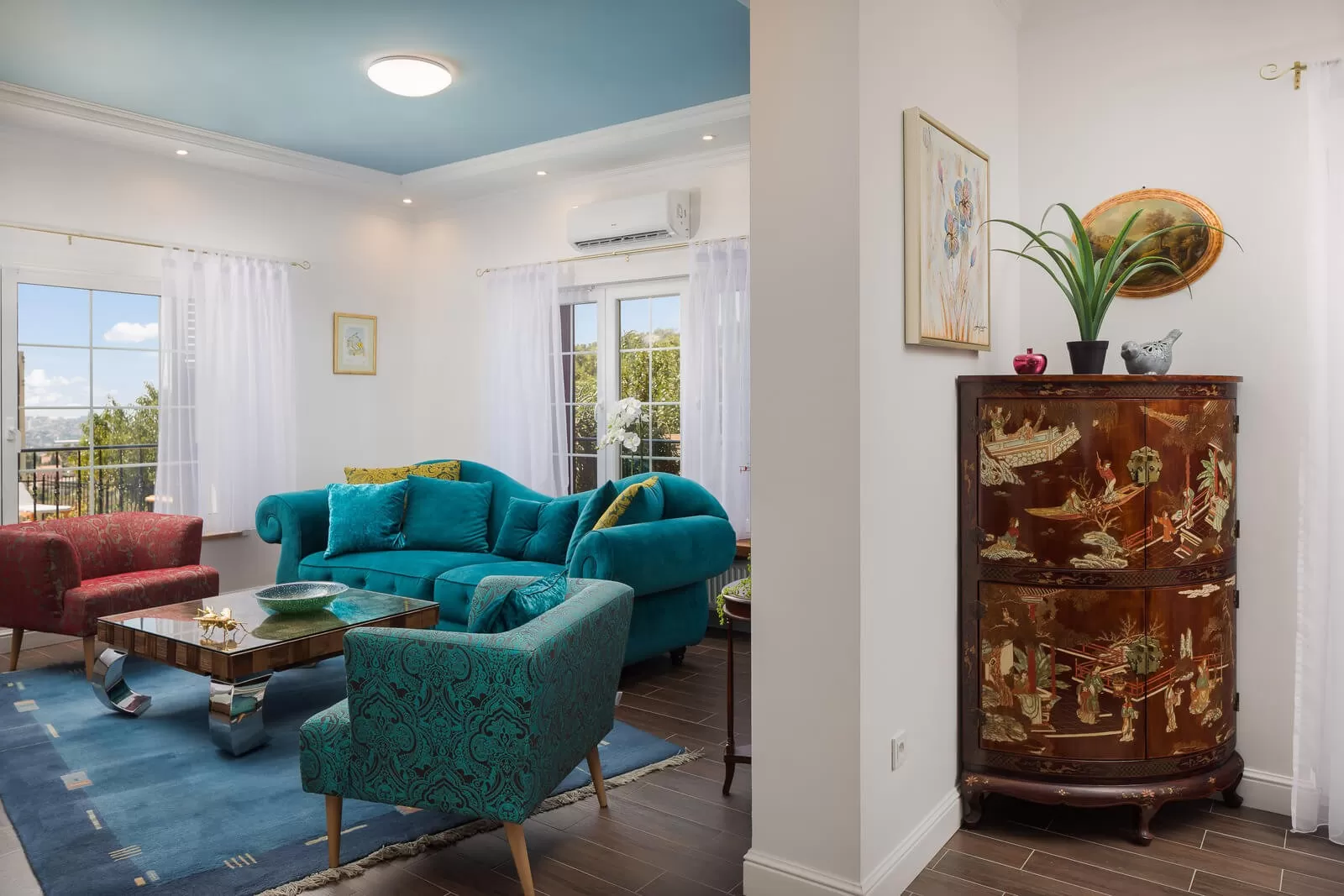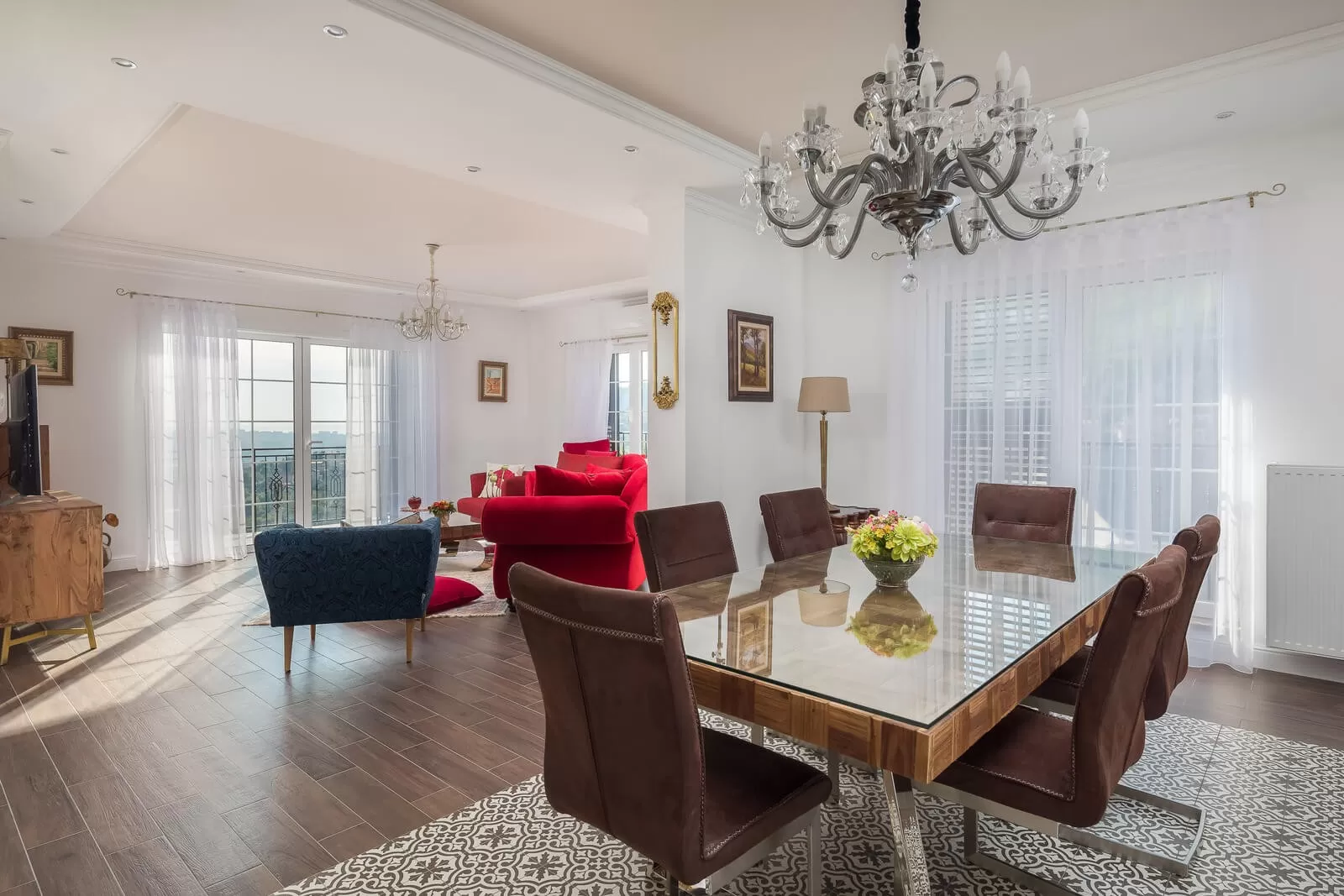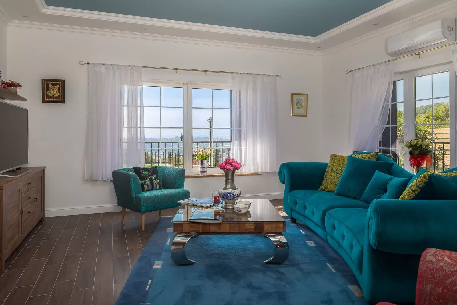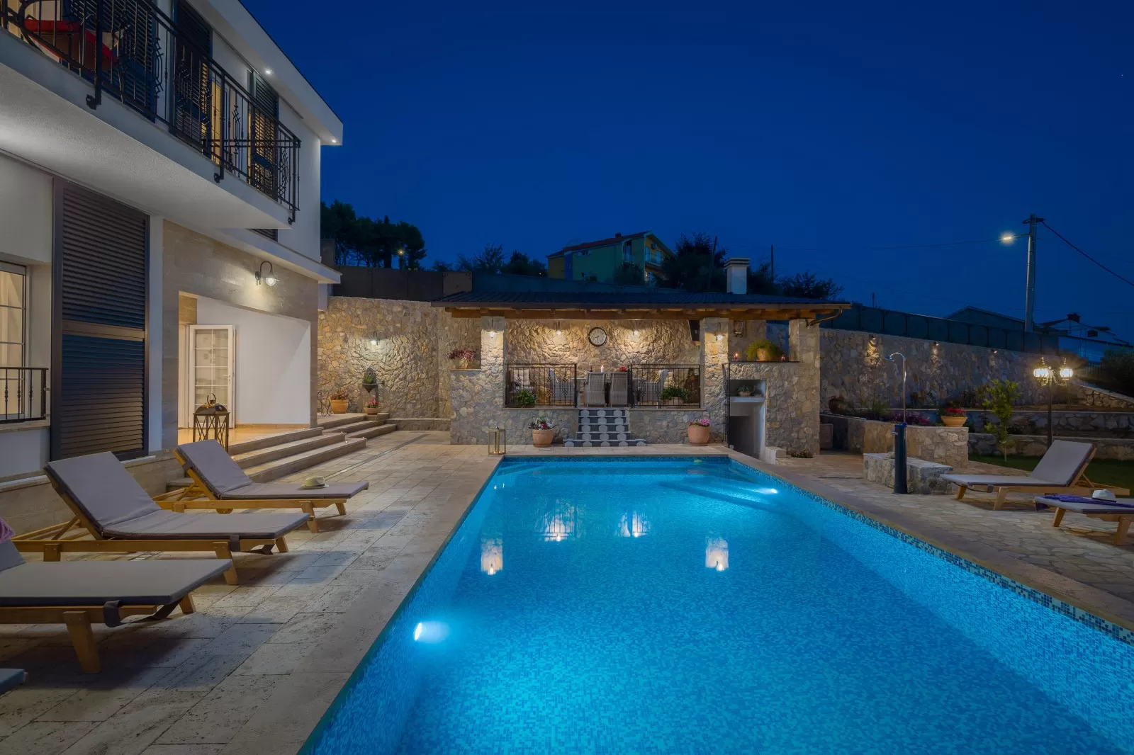 Luxury Villa Zvonimir has 5 bedrooms and can accommodate 10 people. The bedrooms are decorated in shades of blue, orange, and turquoise, creating a pleasant atmosphere in the luxurious villa. The spacious living room with blue and red tones blends with the modern kitchen. Enjoy cooking while the rest of the company relaxes on the comfortable sofa and enjoys the panoramic view. The dining table will serve you for lunches and dinners where you can prepare homemade food. In the villa, you can notice various decorations such as vases, a beautiful chandelier, and a wooden dresser. Luxury Villa Zvonimir has a completely fenced property and parking for 5 cars. Experience the most beautiful memories in the villa where, with a view, a glass of wine, and Dalmatian klapa music, you will not remain indifferent.