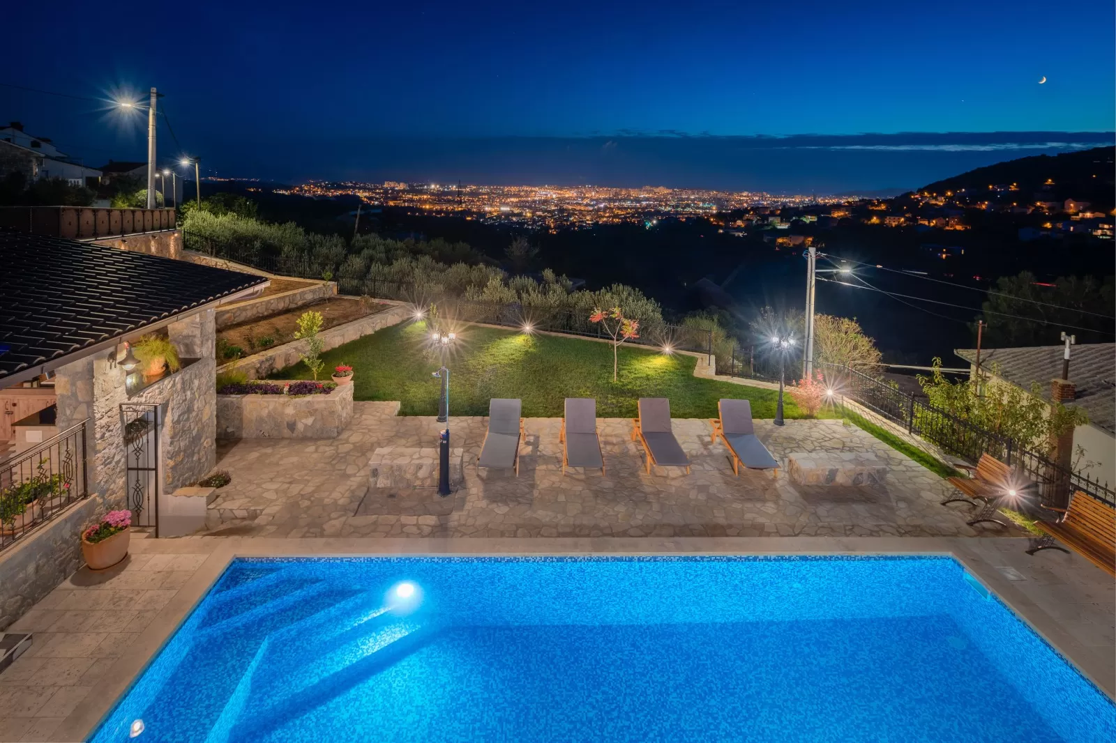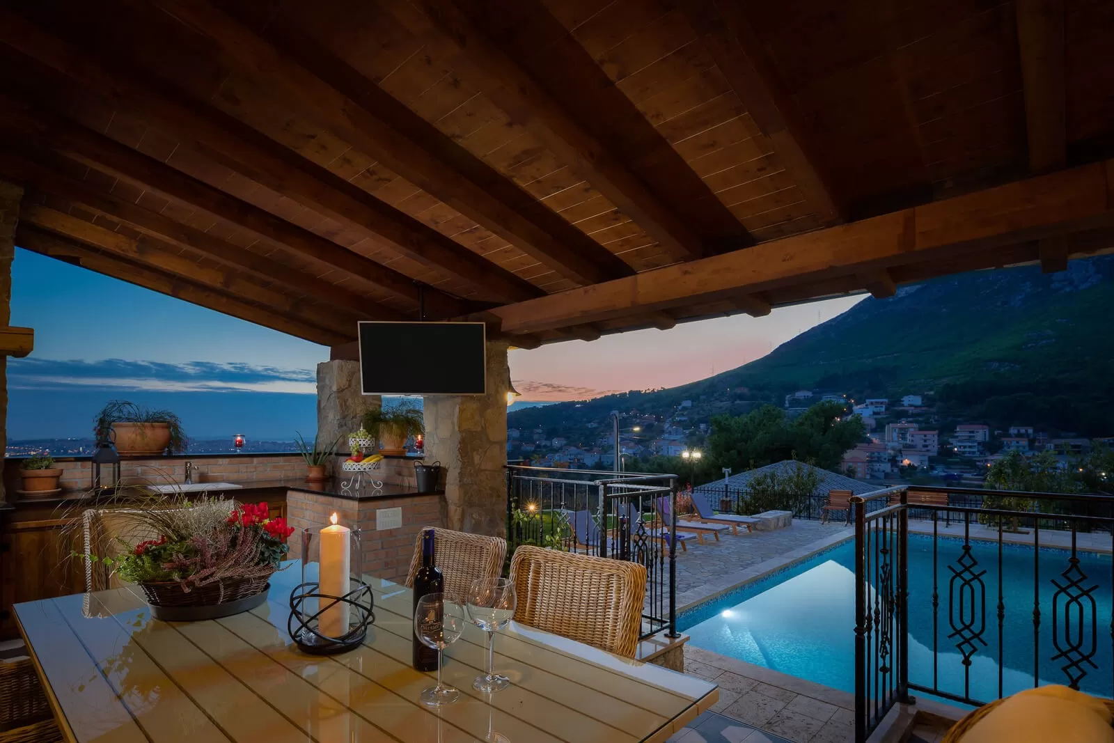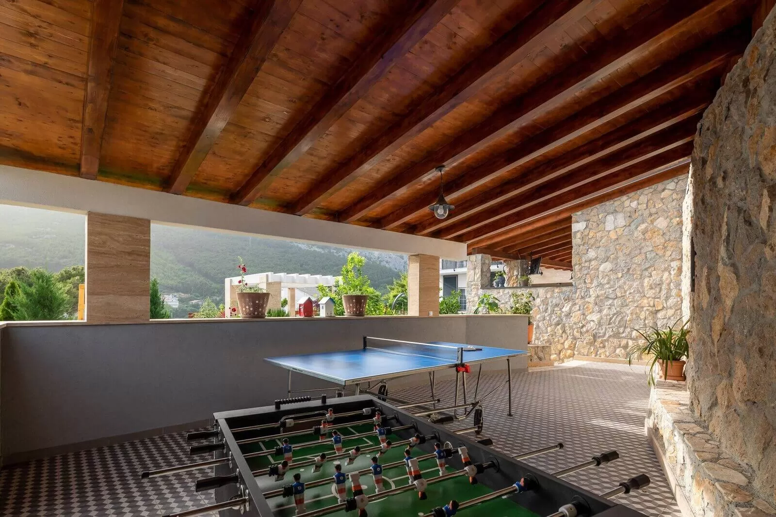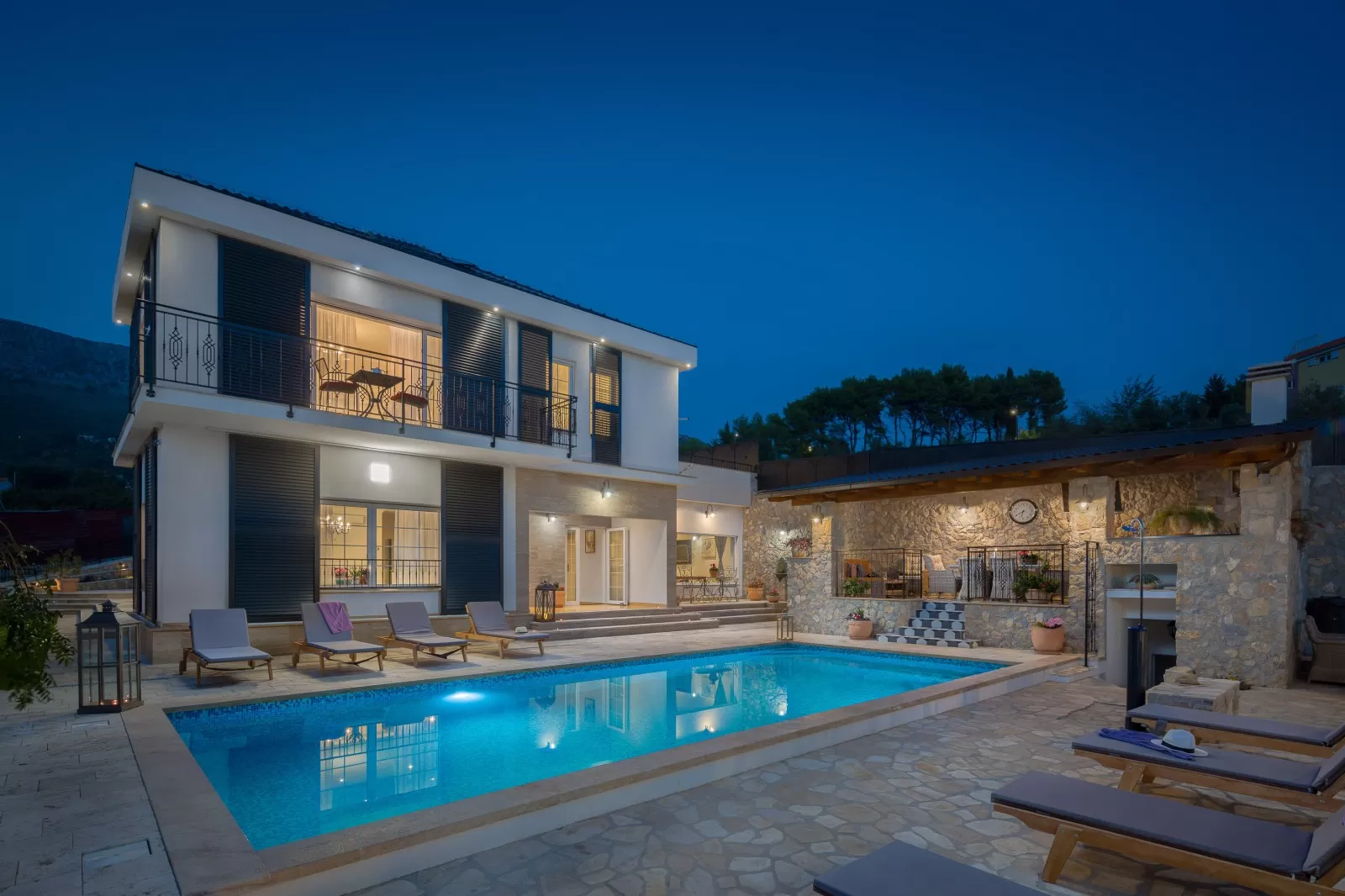 A panoramic view, swimming in the pool, and relaxing in the outdoor Jacuzzi are all you need for a dream vacation. The luxurious Villa Zvonimir with its landscaped garden will awaken the most beautiful feelings in you. Take a dip in the pool, soak up the sun rays, and organize a family breakfast on the outdoor terrace. The outdoor shower is perfect for refreshment on hot summer days, while the covered terrace offers a retreat from the strong sun. Prepare Dalmatian food and indulge in the magical view while sipping your favorite coffee. Table tennis and foosball will come in handy for afternoon gatherings in the fresh air. Villa Zvonimir offers transfer services if you decide to go on a family outing or visit the center of Split. Home-cooked food, indescribable views, a fireplace, and a glass of wine will take your mind far from the daily routine. In the nighttime, with a panoramic view, refreshment in the Jacuzzi, and night swimming in the pool, you will create beautiful memories. Luxury, pleasant climate, and stargazing are priceless.