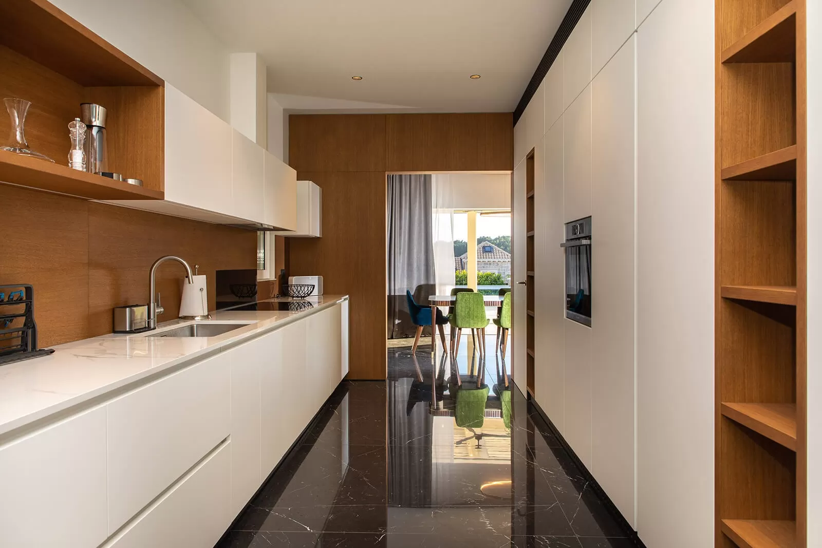 Iako je naslonjena na sestrinsku Villu Rat zbog visokih kamenih zidova svojim gostima će pružiti dovoljno privatnosti. S obje strane kuće se nalaze velike klizne stakle stijene koje daju puno dnevnog svjetla i prozračnosti. Ispred vile se nalazi natkrivena vanjska kuhinja, prostor za blagovanje i roštilj. Ovaj dio kuće je idealan za dnevna druženja uz ručak najfinijih specijaliteta s roštilja. Sa stražnje strane vile se nalazi veliki grijani bazen uz kojeg su smještene ležaljke za sunčanje i opuštanje i dodatni natkriveni prostor za blagovanje ili opuštena druženja. Sama vila je površine 350 metara kvadratnih raspoređenih na 2 etaže. Na donjoj etaži se nalazi veliki luksuzno opremljen dnevni boravak, potpuno opremljena kuhinja i prostor za blagovanje. U podrumu kuće se nalazi moderan luksuzan vinski podrum idealan za večernja druženja uz degustaciju najfinijih vina. Ukoliko se želite potpuno opustiti osim klasične finske saune dostupna vam je i turska parna kupelj. Što se spavaćih soba tiče Villa Katarina ima ukupno 4 spavaće sobe u koje se ugodno mogu smjestiti 8 gostiju. Svaka spavaća soba je klimatizirana, ima king size krevet, vlastitu kupaonicu i TV, a glavna spavaća soba ima i svoju terasu.