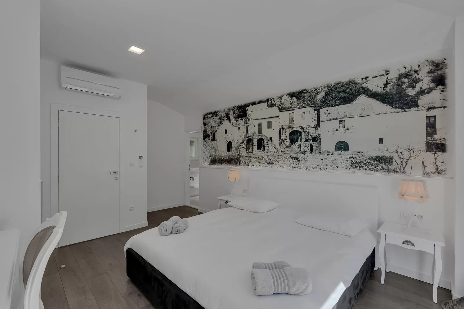 Unutarnji prostori Ville Prestige odišu prozračnošću, svjetlom i profinjenim dizajnom. Dnevni boravak otvorenog koncepta povezuje se s vanjskim prostorima kroz staklene stijene, omogućujući neometan pogled na more iz svake perspektive. Elegantne linije namještaja i neutralni tonovi stvaraju osjećaj smirenosti, dok pažljivo odabrane dekoracije unose dozu osobnosti. Prostrana blagovaonica s velikim stolom i raskošnim lusterom idealna je za zajedničke obroke i svečane večere. Moderna kuhinja potpuno je opremljena najnovijim uređajima, savršena za pripremu gurmanskih jela. Pet spavaćih soba, svaka s king-size krevetom, privatnom kupaonicom, klima uređajem i TV-om, pružaju potpunu privatnost i komfor. Kupaonice su uređene u suvremenom stilu, s vrhunskim materijalima i prostranim tuševima. Sauna i dodatne wellness opcije unutar vile podižu razinu udobnosti na viši nivo. Cijela kuća klimatizirana je i opremljena brzim Wi-Fi-em te svim potrebnim sitnicama za bezbrižan boravak. Spoj luksuza i funkcionalnosti čini interijer idealnim i za duži odmor i za kratki luksuzni bijeg.