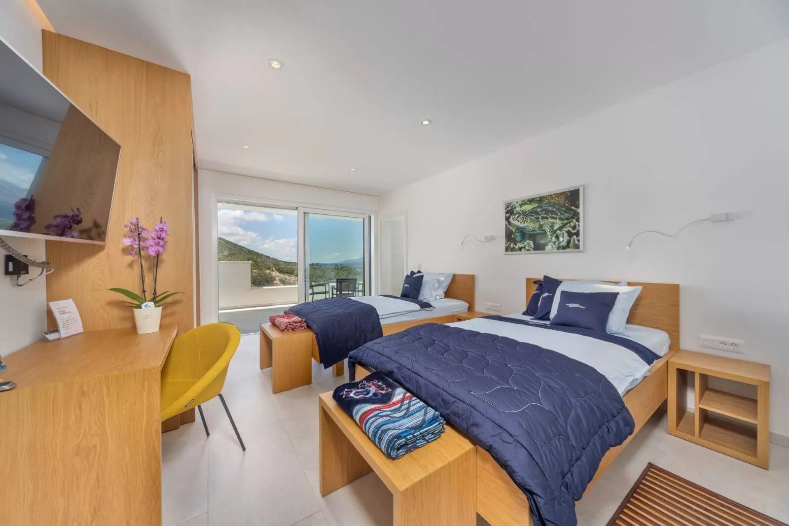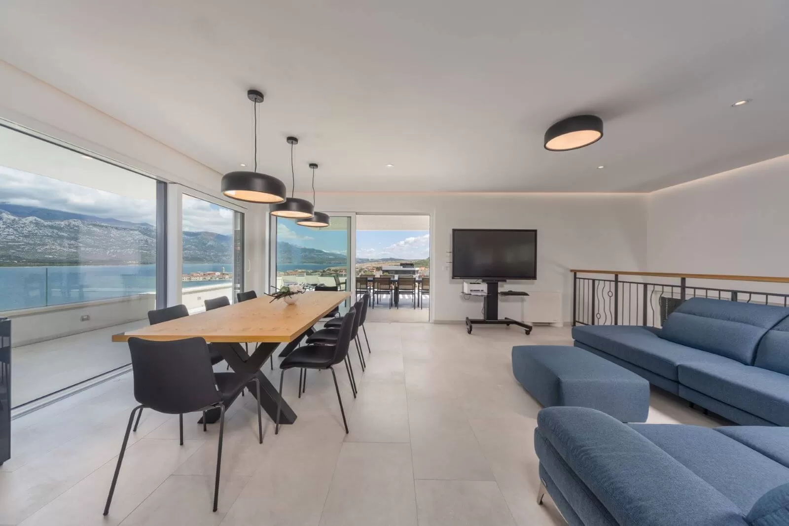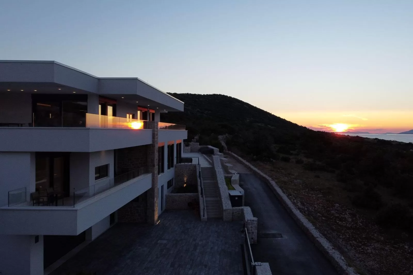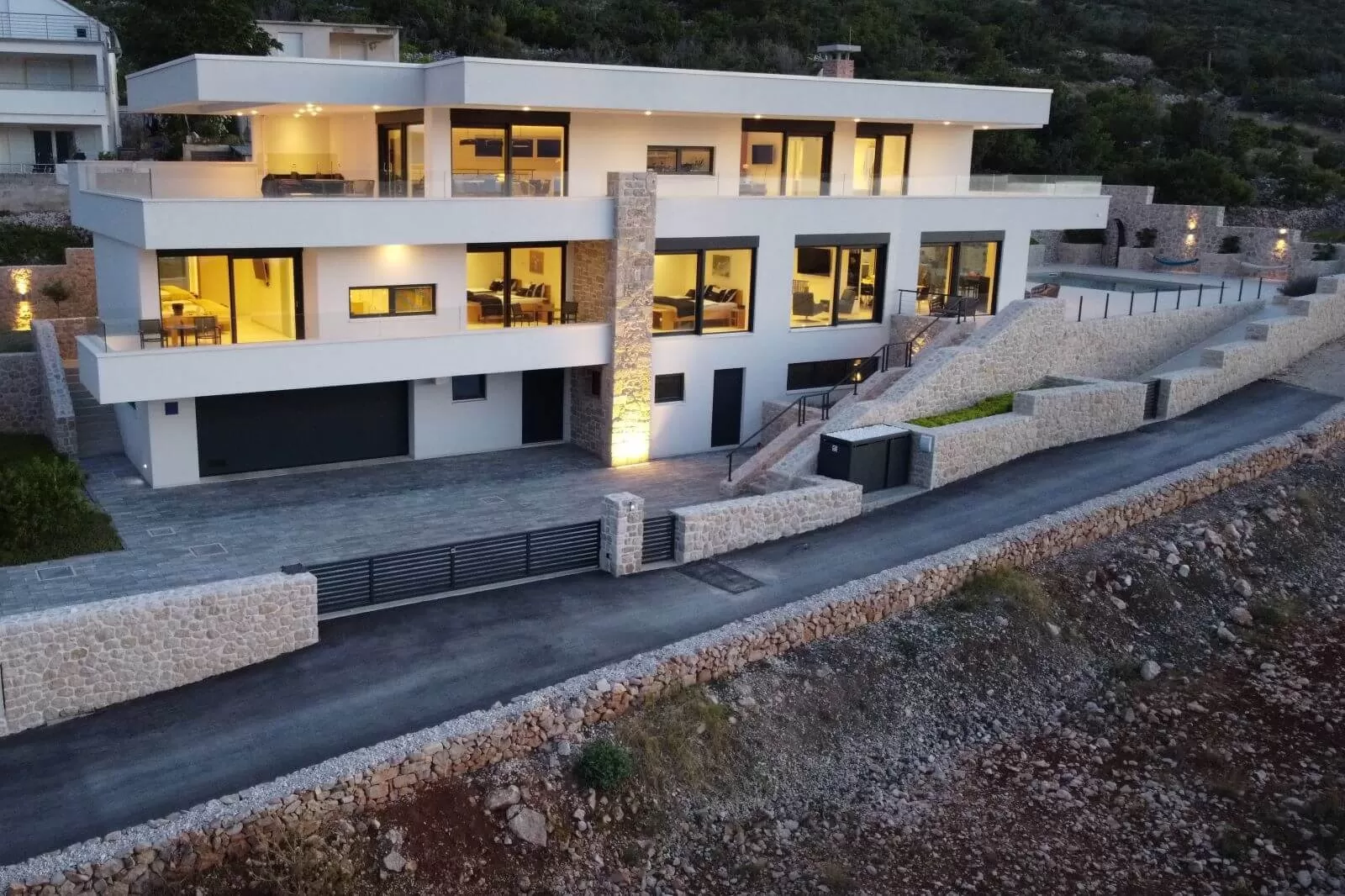 Vila sadrži ukupno 6 luksuzno opremljenih spavaćih soba raspoređenih na 2 etaže koje ukupno mogu primiti 12 gostiju. Od toga 3 spavaće sobe imaju king size krevete, a 3 spavaće sobe po 2 single wide kreveta koji se po potrebi mogu i spojiti. Svaka spavaća soba je iznimno prostrana, klimatizirana, ima vlastitu kupaonicu i TV. Osim toga gostima su na raspolaganju 2 potpuno opremljene kuhinje, 2 blagovaonice unutar vile i još 2 vani na terasama tako da mogu birati na kojoj strani će blagovati i družiti se ovisno o raspoloženju i vremenu. Na terasi se nalazi i vrhunski Kamado Joe roštilj. Zbog svoje prostranosti i tehničke opremljenosti (smart stol, printer, kompjuter..) vila je pogodna i za poslovne sastanke, tečajeve ili manje team building-e. Osim interijera vile, eksterijer je također vrlo komforan, a uključuje nekoliko terasa od kojih svaka ima zadivljujući panoramski pogled i veliki otvoreni prostor gdje se nalazi grijani bazen koji ima funkciju protustrujnog plivanja i masaže. Oko bazena gostima su na raspolaganju ležaljke za sunčanje, uživanje i ispijanje omiljenog pića. Također gostima su na raspolaganju 2 garaže i 4 parkinga mjesta ispred kuće.